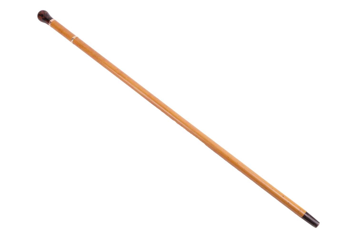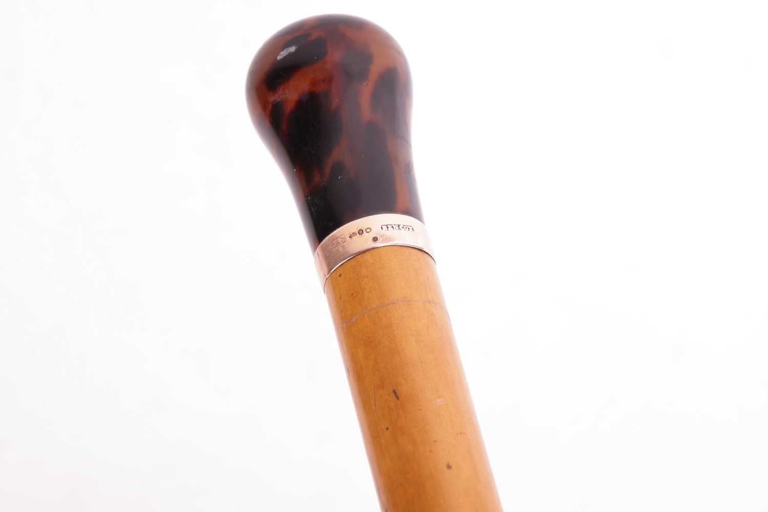 A Malacca walking cane with resin pommel, the connecting gold band with hallmarks for 12ct gold and stamped 'Ben Cox' with maker's mark 'J.C', the cane measuring 89cm in length, together with a 7.3mm wide wedding band with hallmarks for 9ct gold, ring size X, weighing 4.6 grams