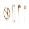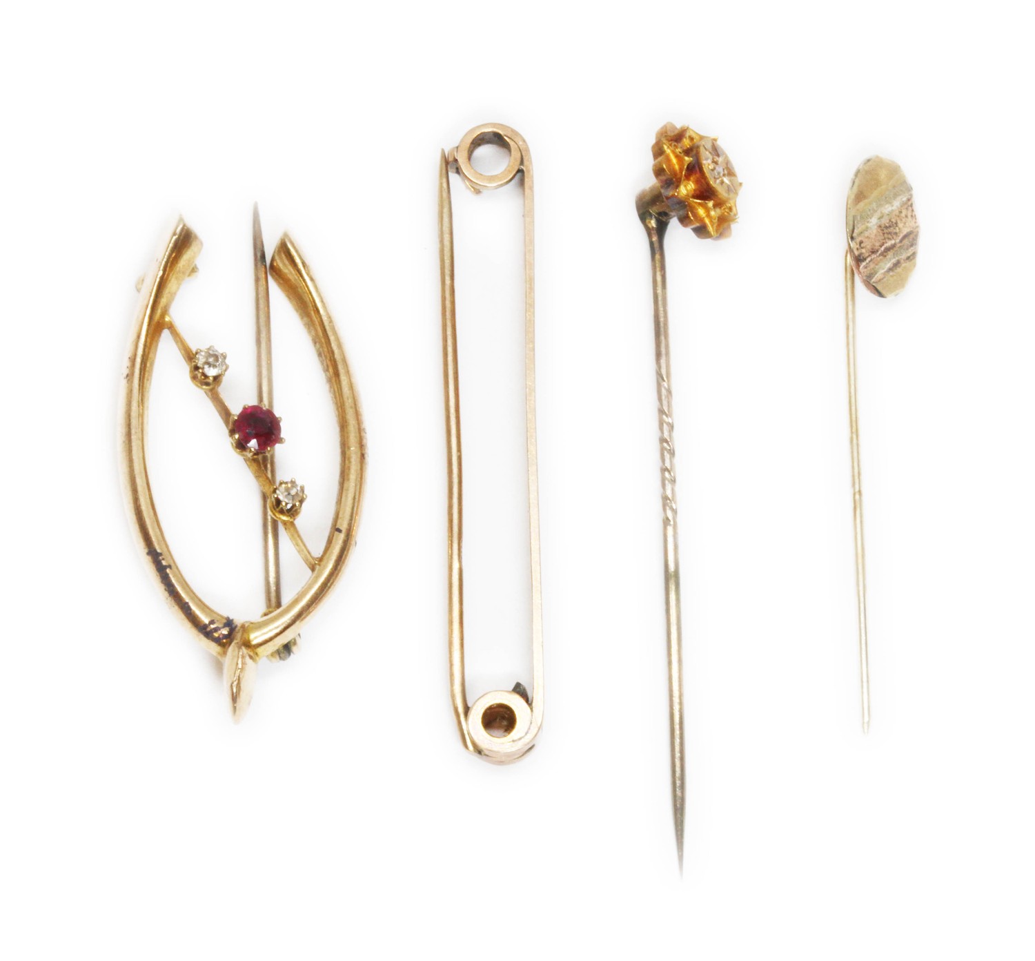 A mixed lot comprising a horseshoe brooch indistinctly marks, a hallmarked 9ct gold tie pin, a stick pin indistinctly marked 15ct and another unmarked, gross weight 8.3g.