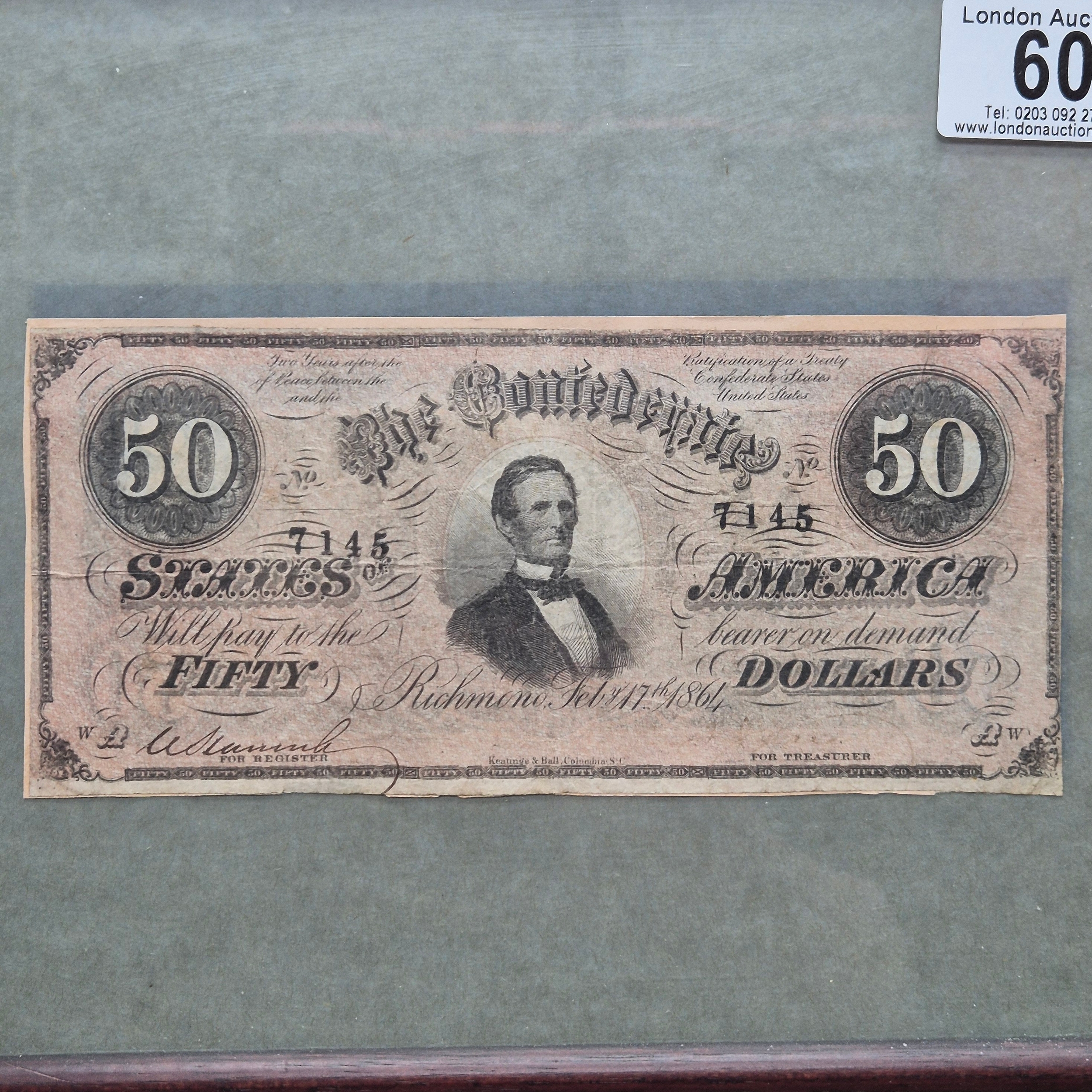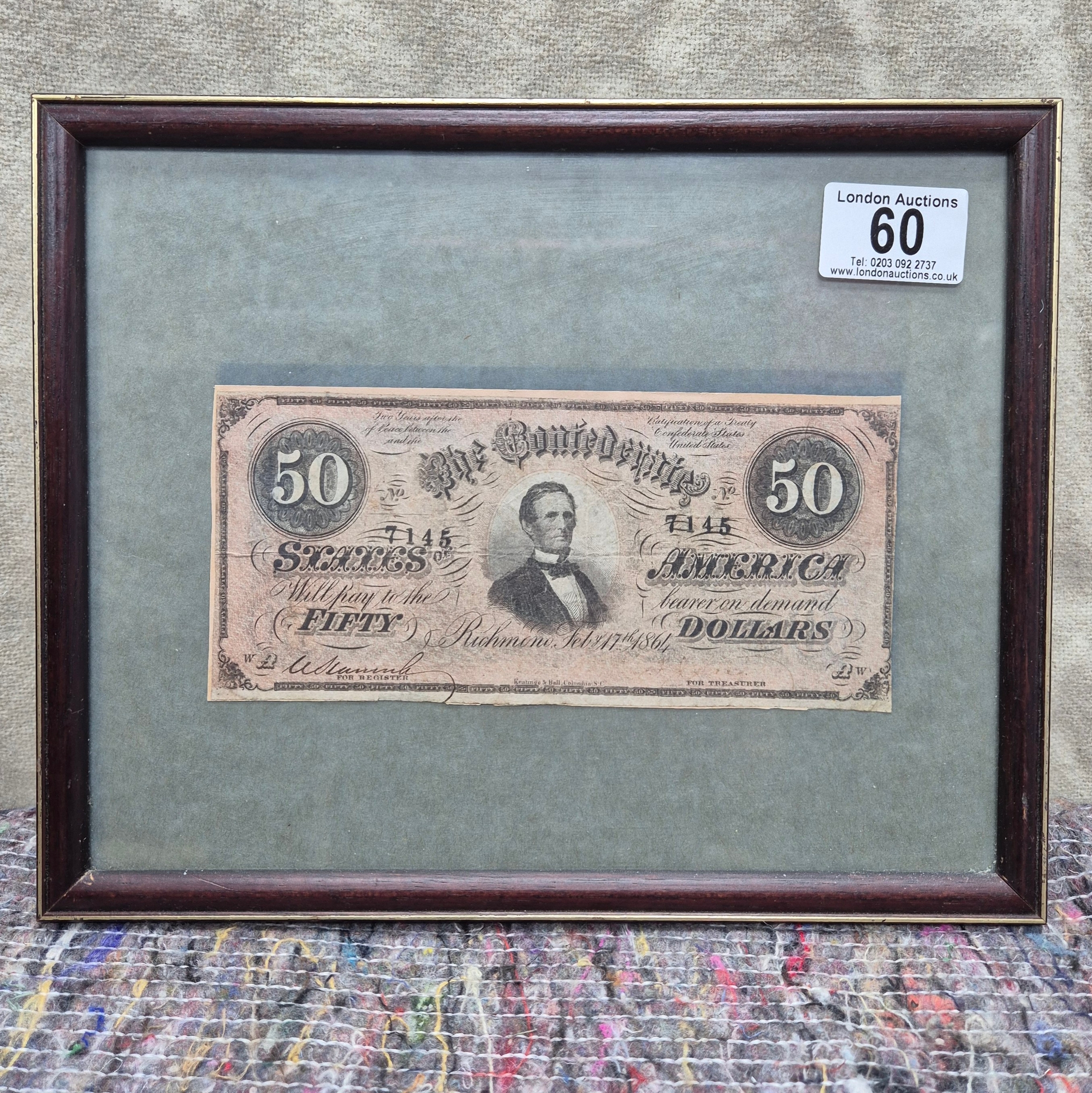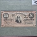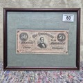 A Framed Confederate States USA 50 Dollar Note W Plate without series