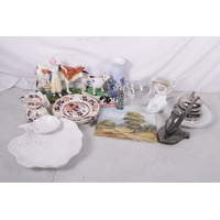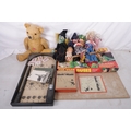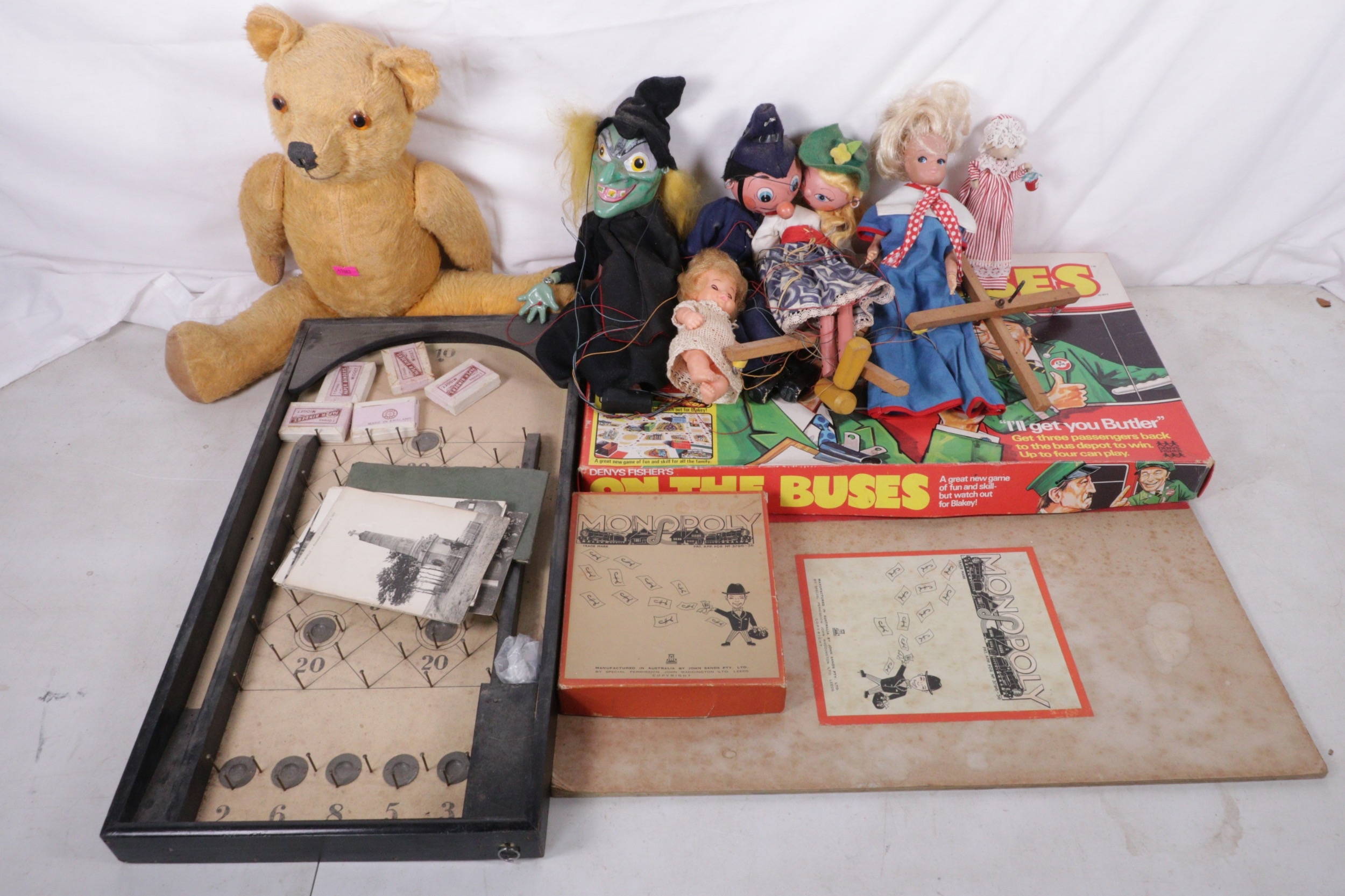 Vintage Pelham puppets, jointed teddy bear, Sindy doll, On the buses game etc, Wooden pinball style game, Monopoly, postcards etc.