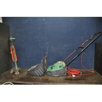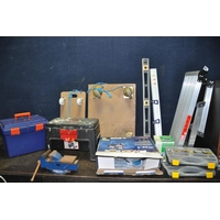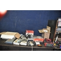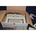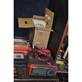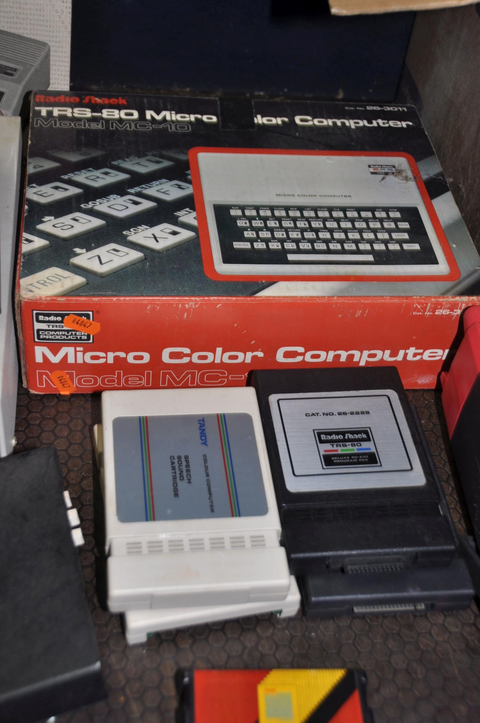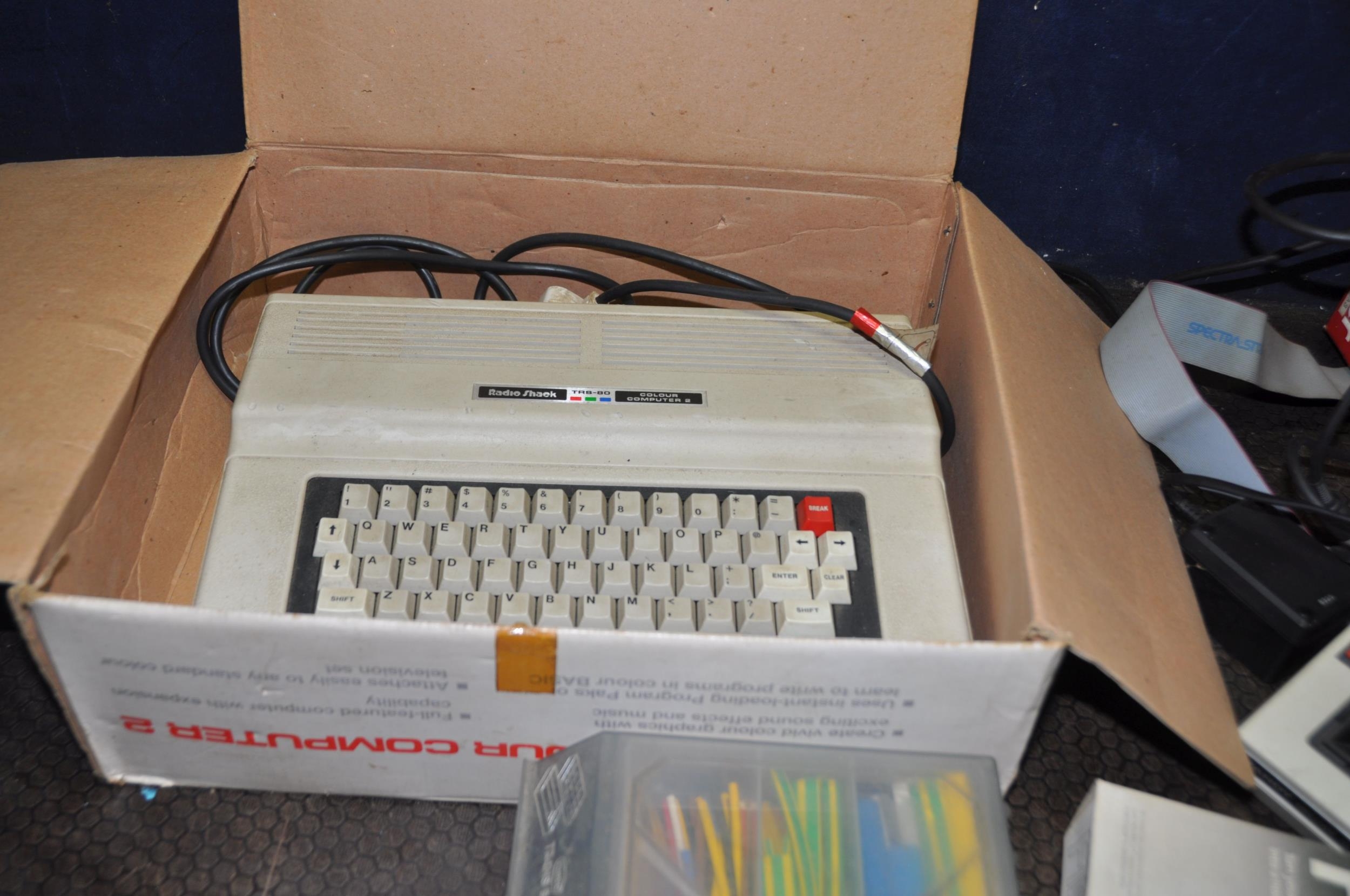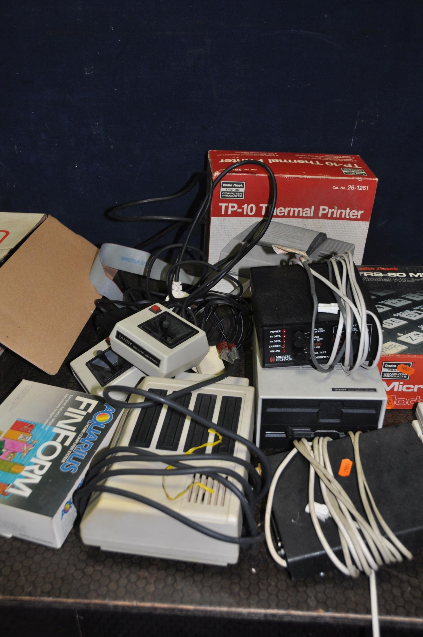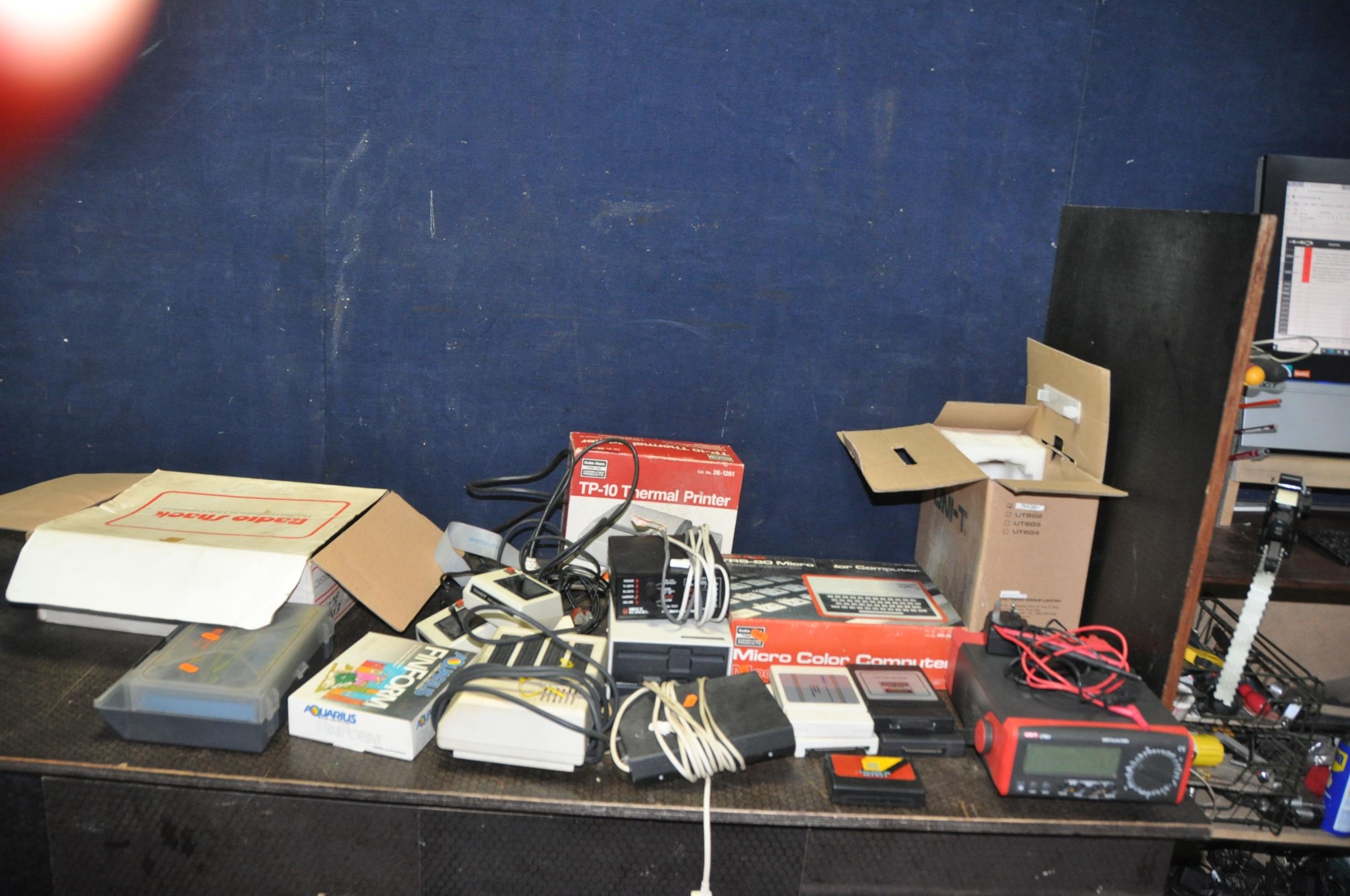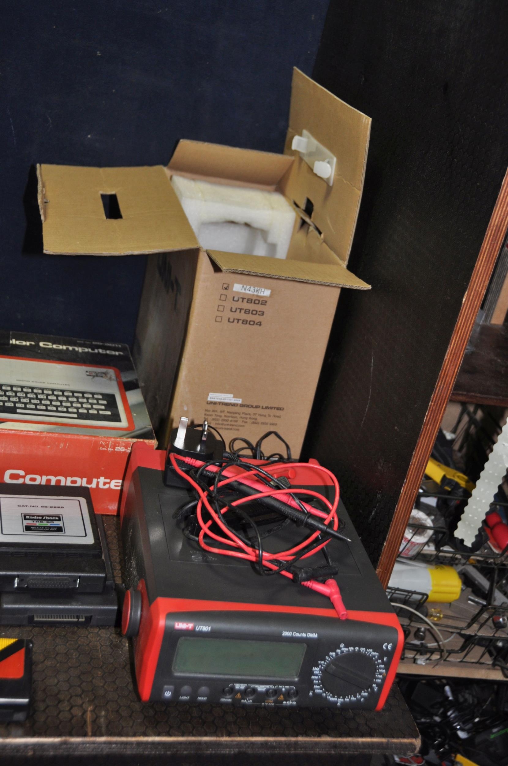 A TRAY CONTAINING ELECTRICAL EQUIPMENT AND TOOLS including a Uni-T UT801 bench top multimeter, Radio Shack TRS80 Micro Colour Computer, a TRS80 Colour Computer 2, a TP10 Thermal Printer, etc (all UNTESTED)