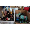 Two boxes of alcoholic beverages including sparkling wine, Babycham, Brandy, Tiramisu et,