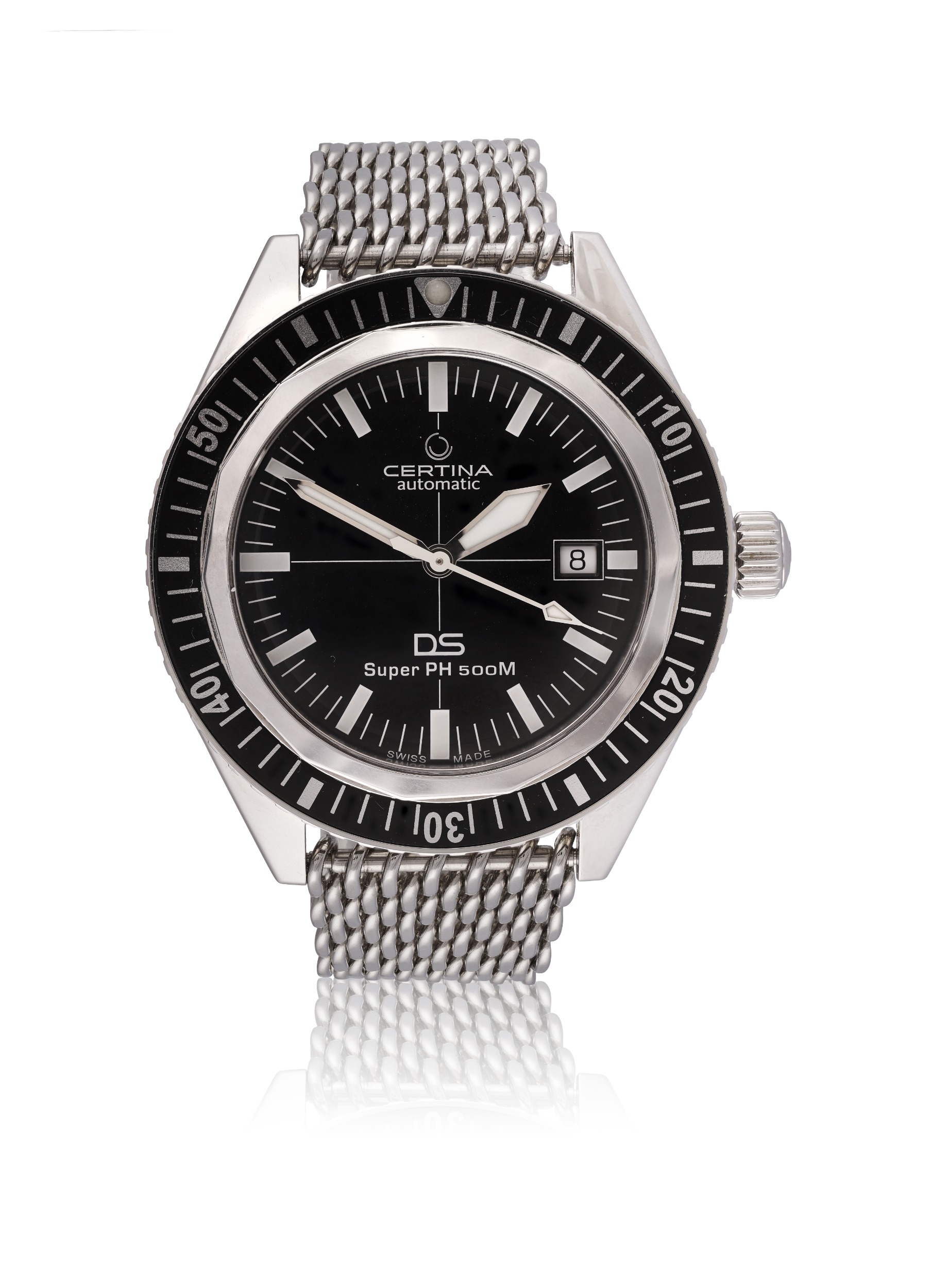 CERTINA DS SUPER PH500M REF. ISO 6425, STAINLESS STEEL A modern diver's wristwatch Year: 2025 Dial: Black dial with applied luminous rectangular hour markers, minute track, date aperture at 3 o'clock Movement: Automatic, ETA Powermatic calibre Case: Stainless steel case with screw-down caseback Size: 43 mm diameter. Gross Weight: 140 g approx. Bracelet/Strap: Original strap with pin buckle, with additional stainless steel mesh bracelet Accessories: Full set with box and papers