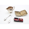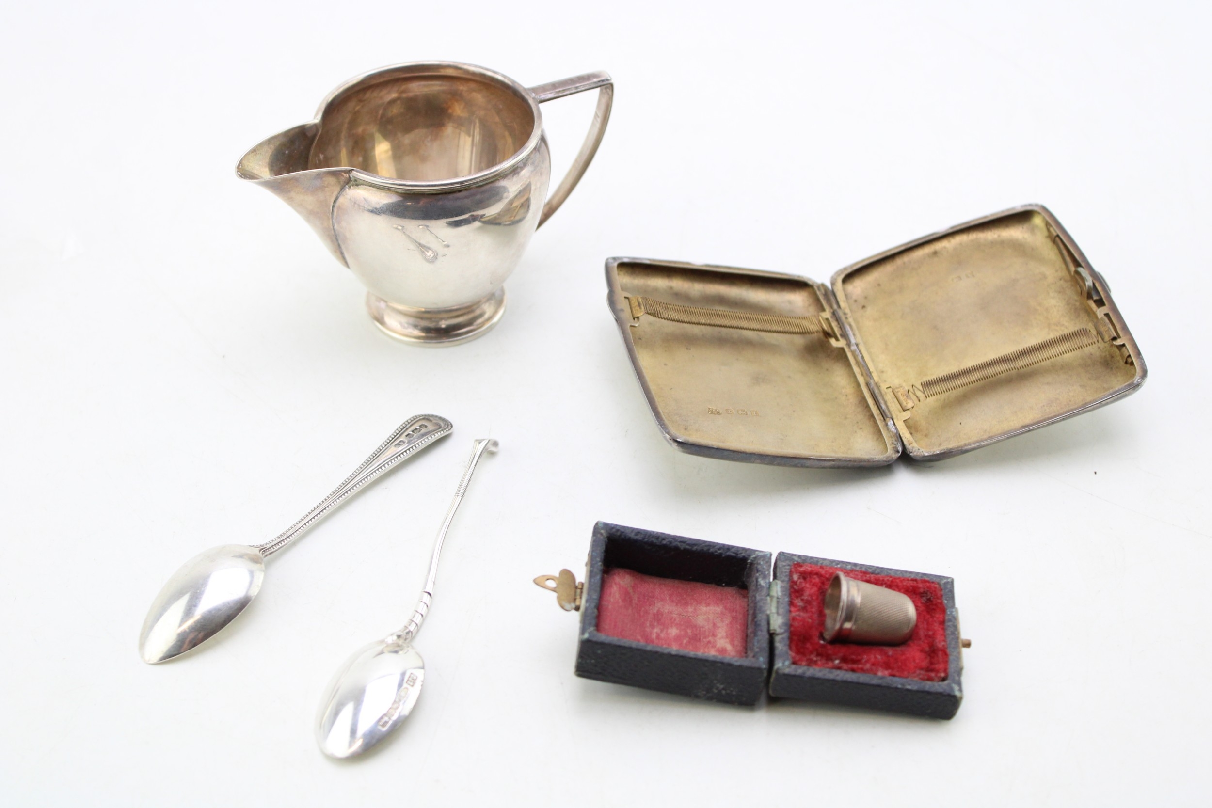 Silver to include a cream jug, Birmingham 1937, a golfing tea spoon, a card case, a singular tea spoon and a cased thimble, 196.9g.