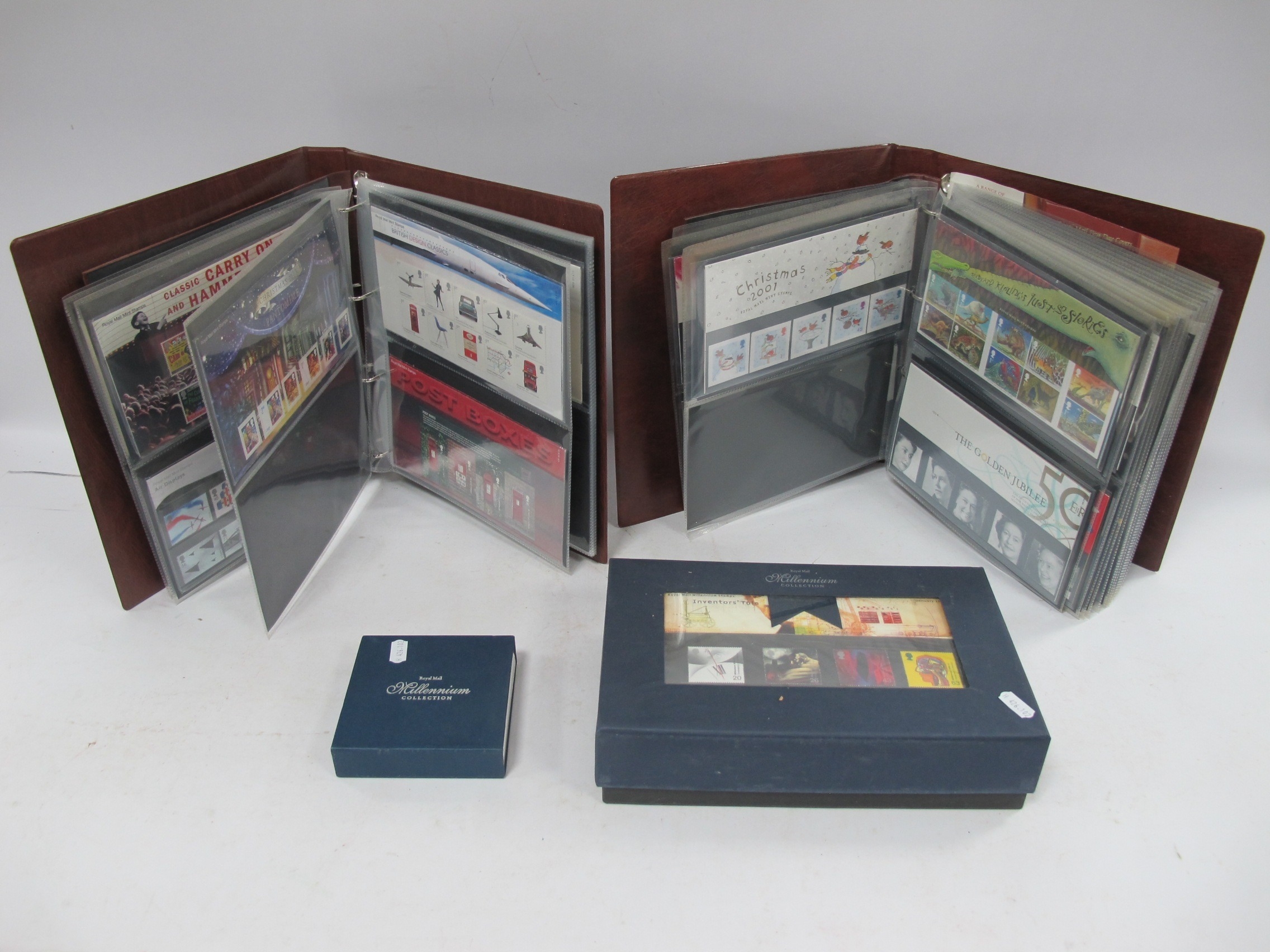 Stamps; A Collection of GB presentation packs, ranging from Millennium to Early Post-Millennium period, housed in two Royal Mail presentation pack albums, plus two Royal Mail special edition millennium packs. The collection contains over £650 in mint commemorative stamps.