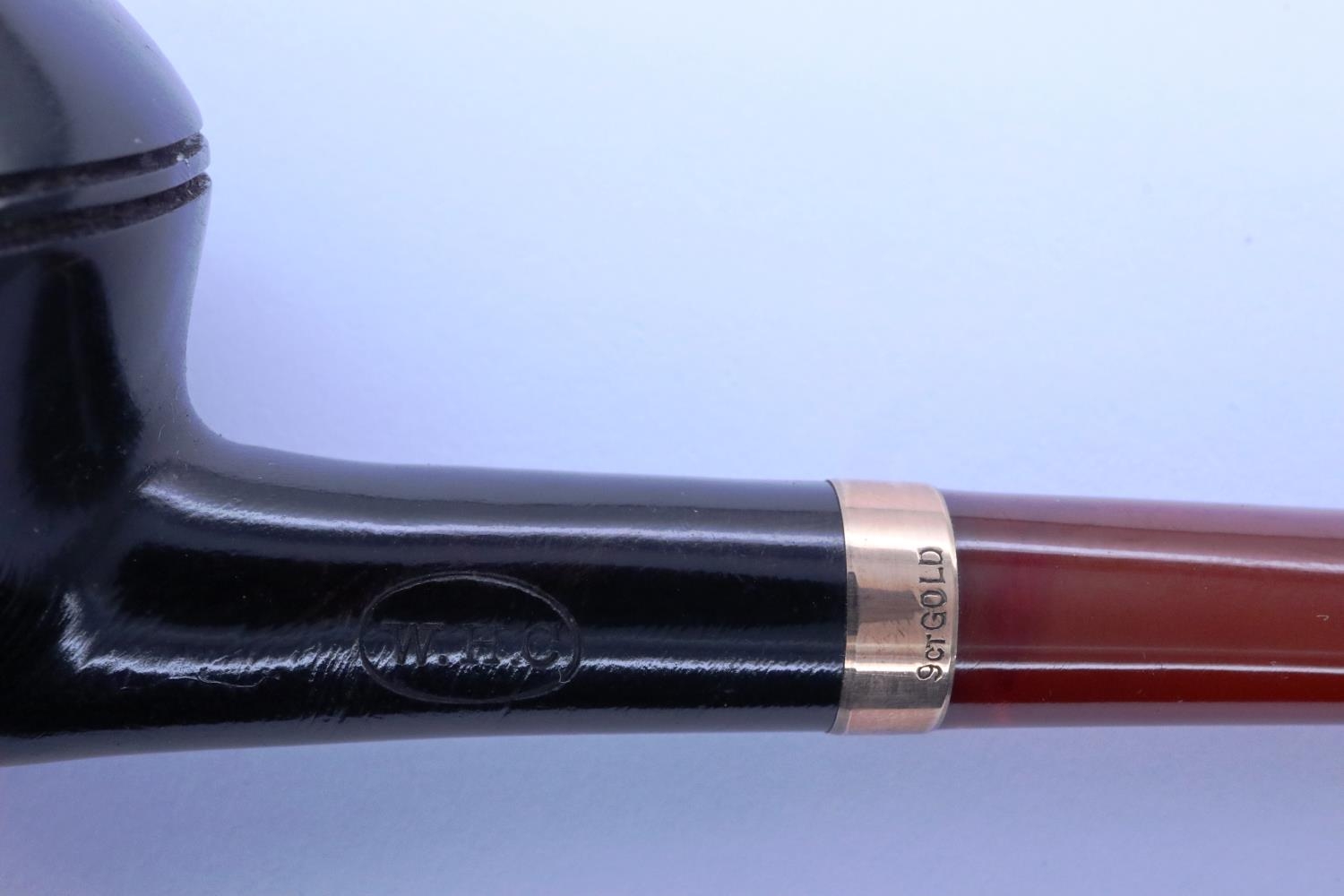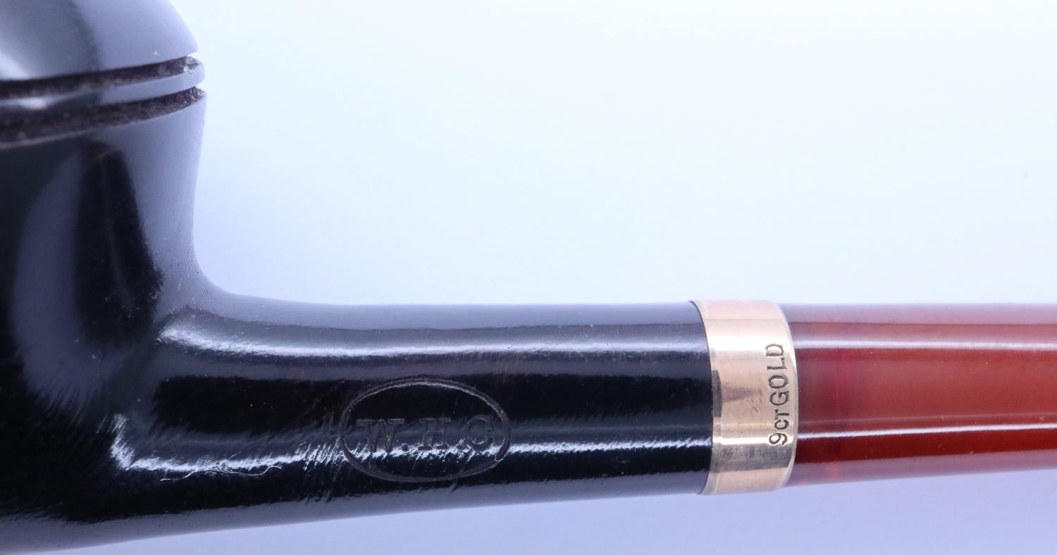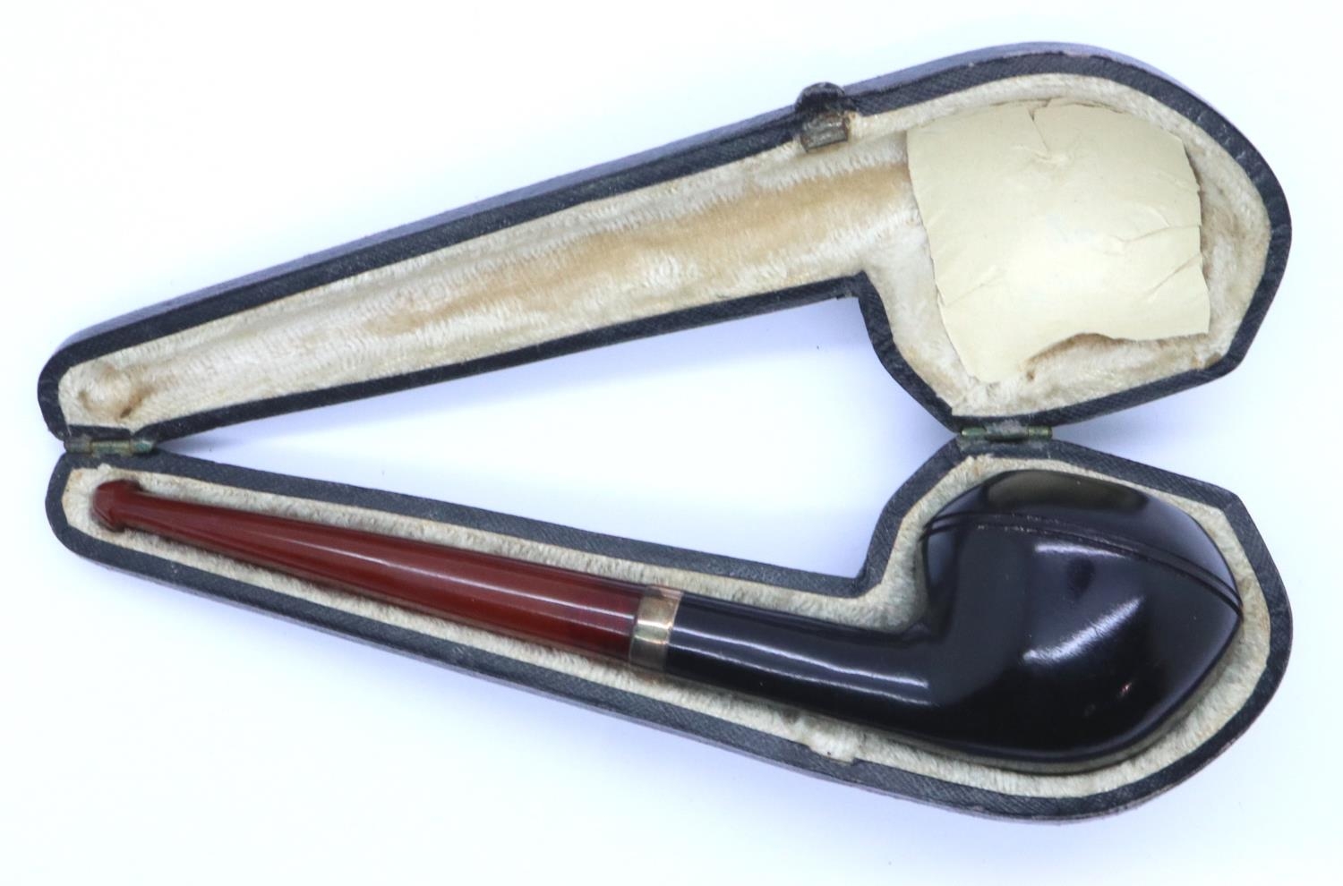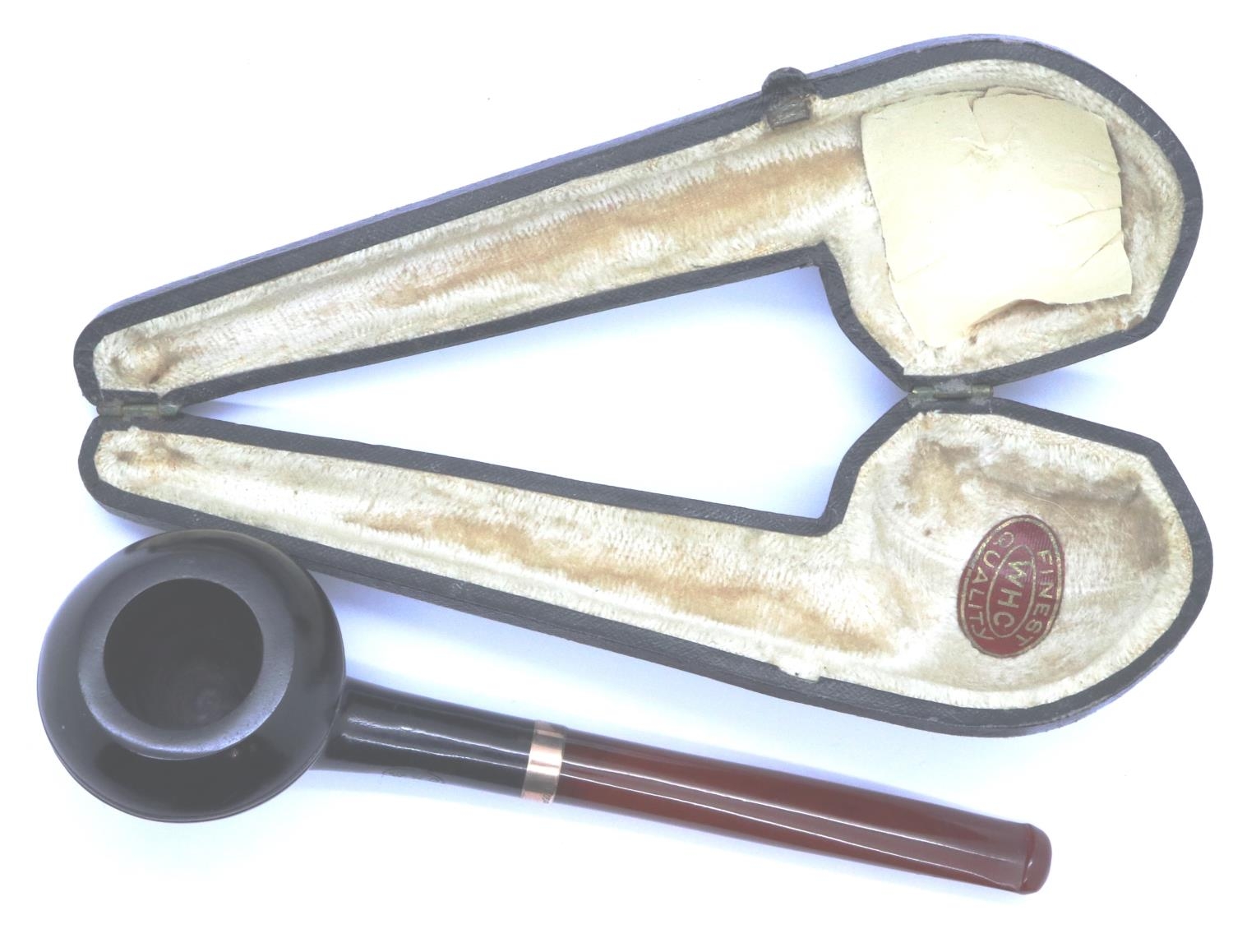 Cased WHO smoking pipe with a 9ct gold band. P&P Group 1 (£14+VAT for the first lot and £1+VAT for subsequent lots)