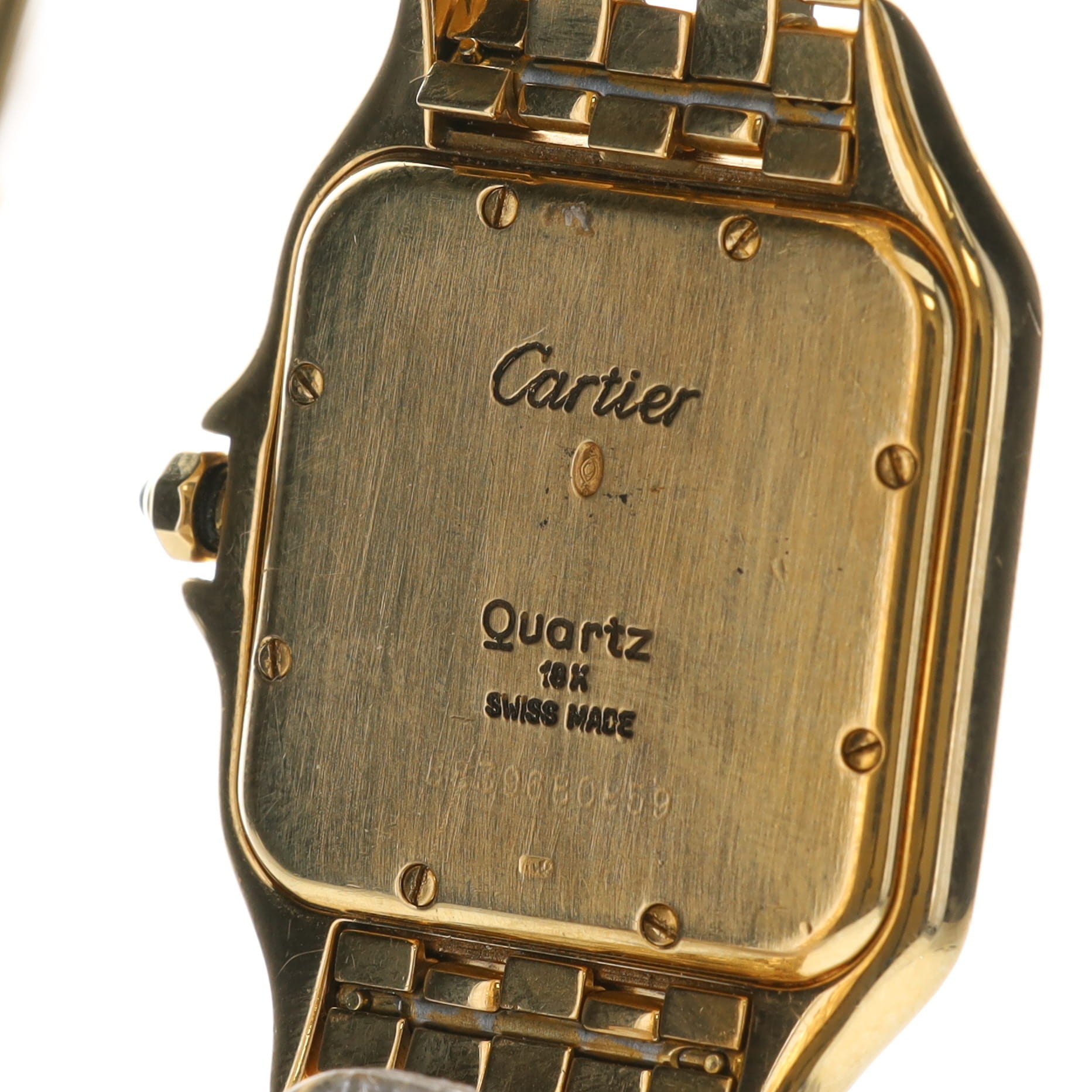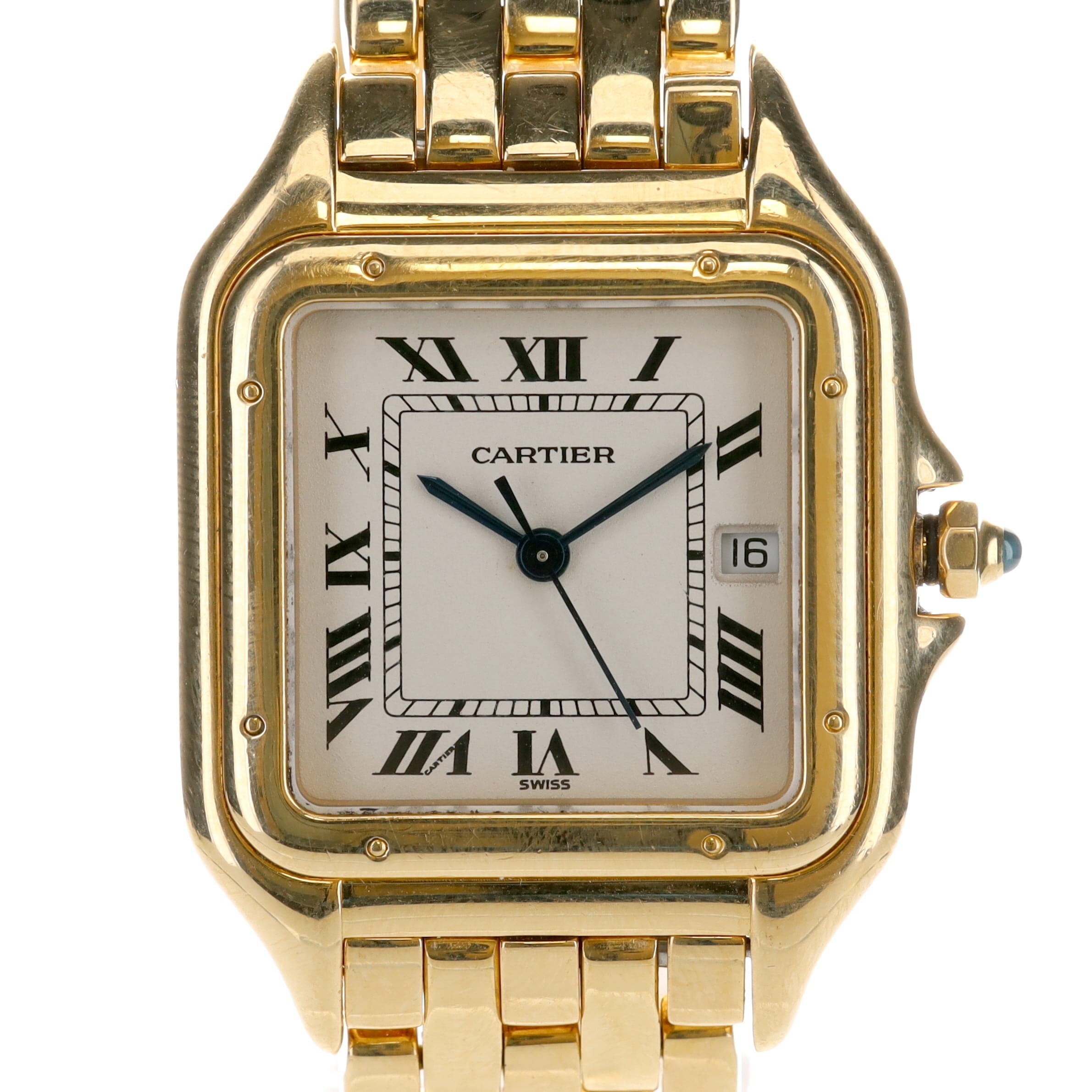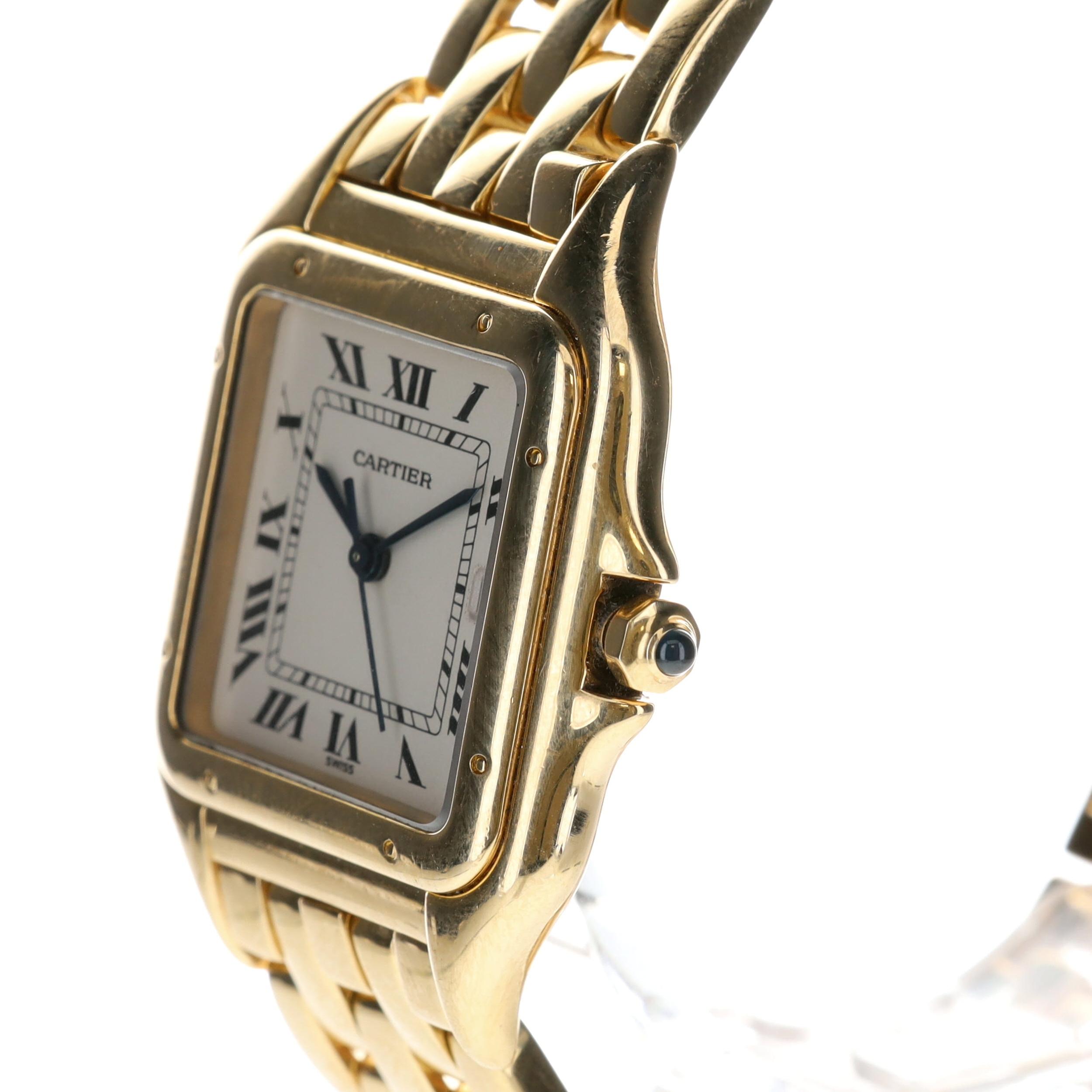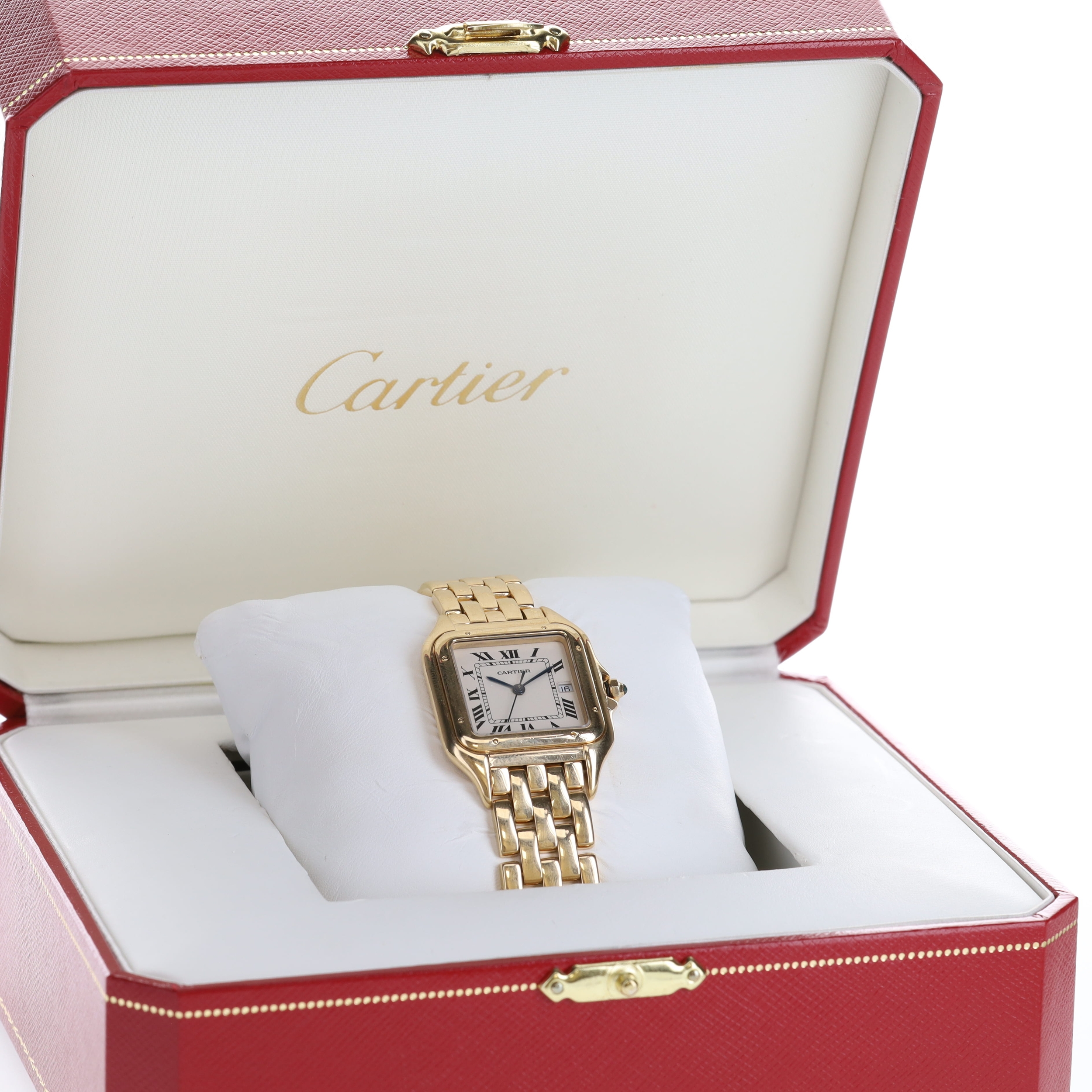 Cartier - Panthère 18ct Gold Quartz Watch. Swiss made quartz movement. Case and strap made from hallmarked 18ct yellow gold. Sapphire crystal. Square white dial with blued steel hands and black roman numerals. Quick set date function with window at 3 o'clock. Dial signed 'Cartier'. Caseback reference code '8839680859'. Includes box and papers (non-original).
