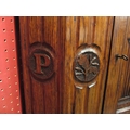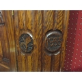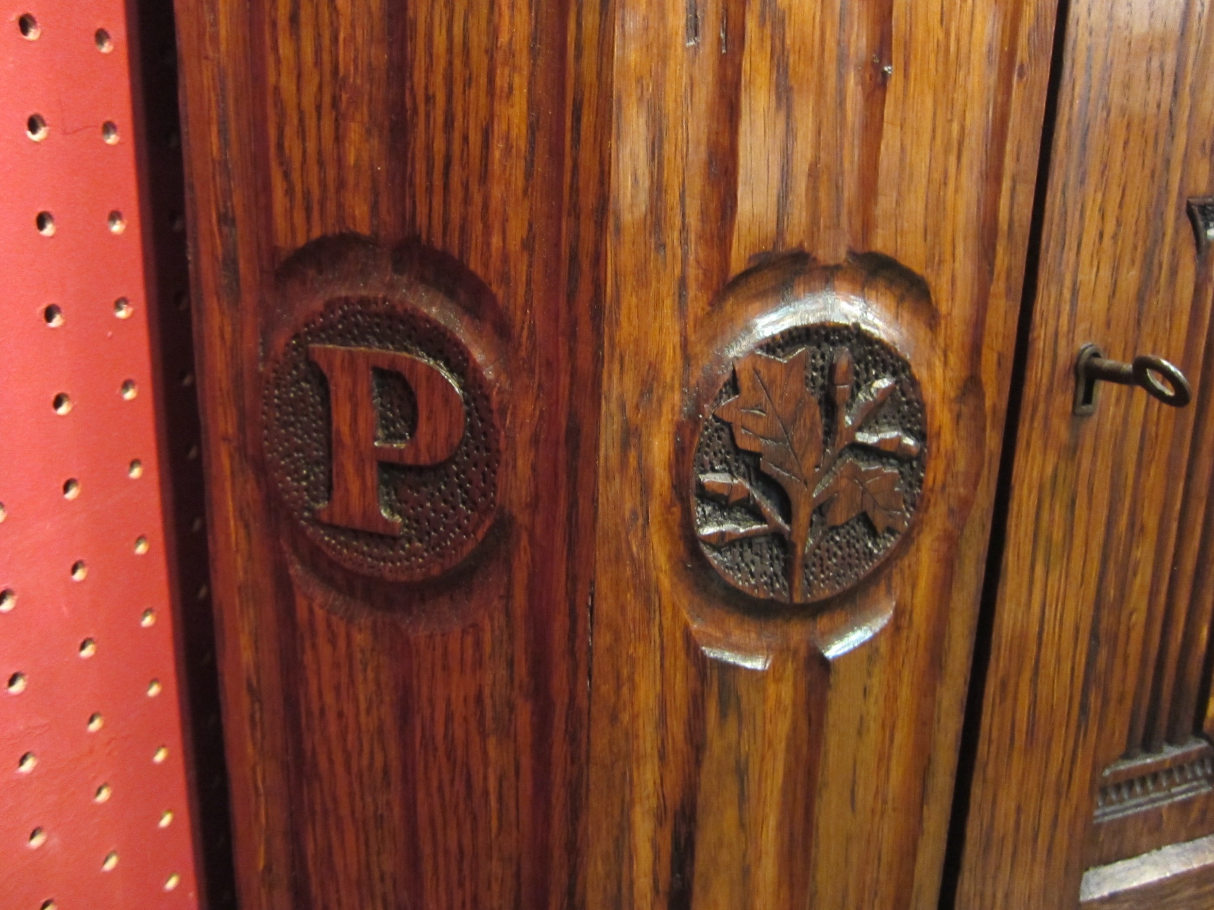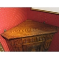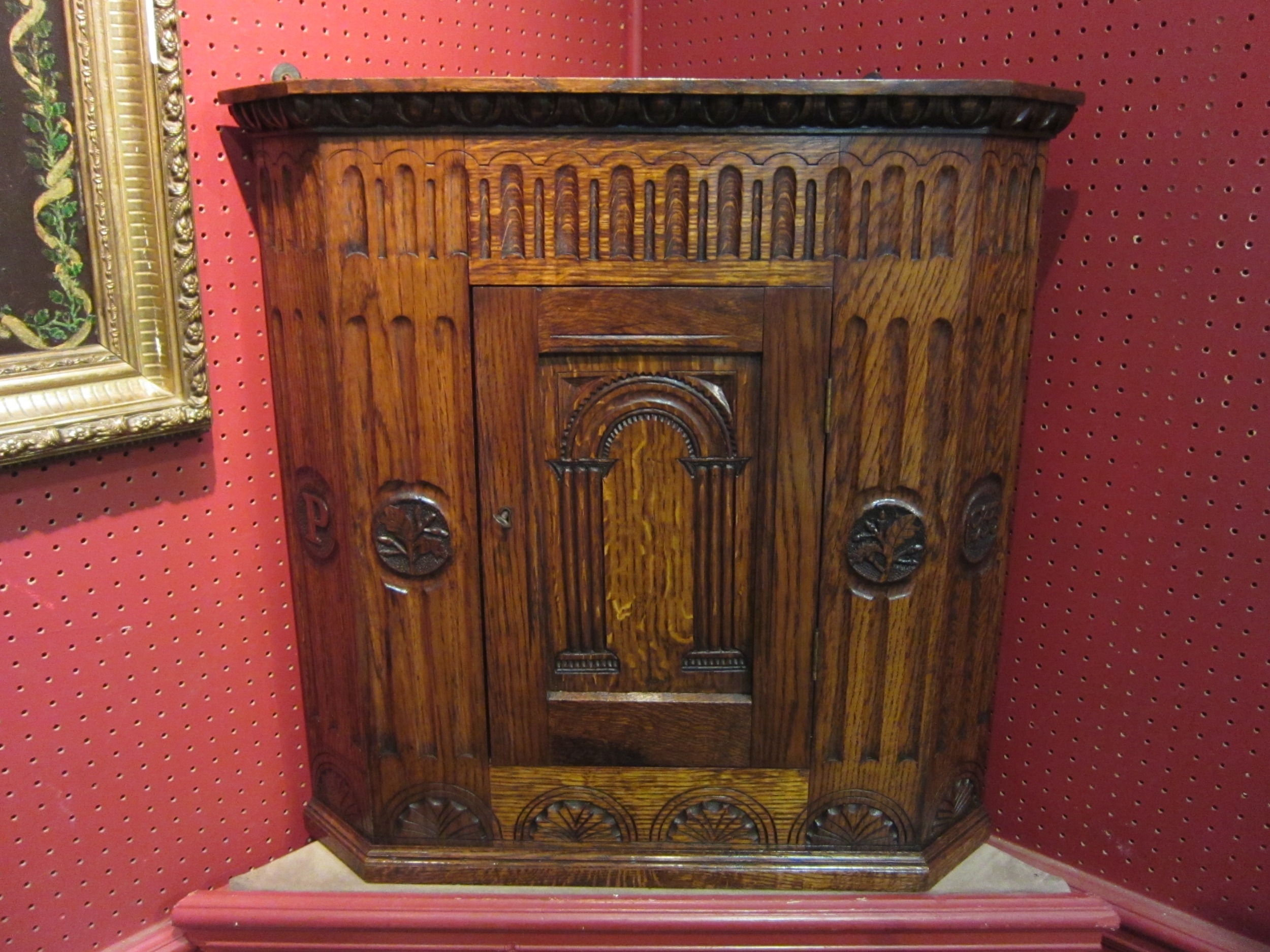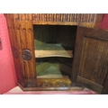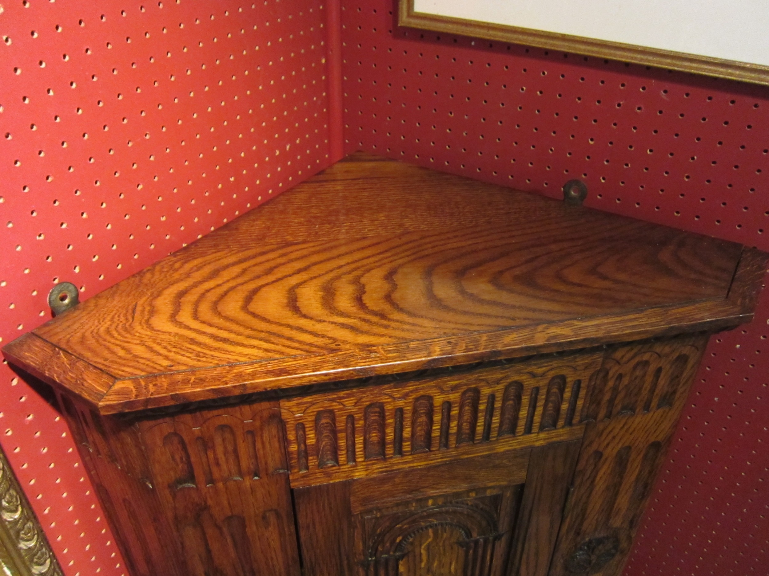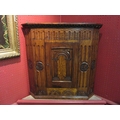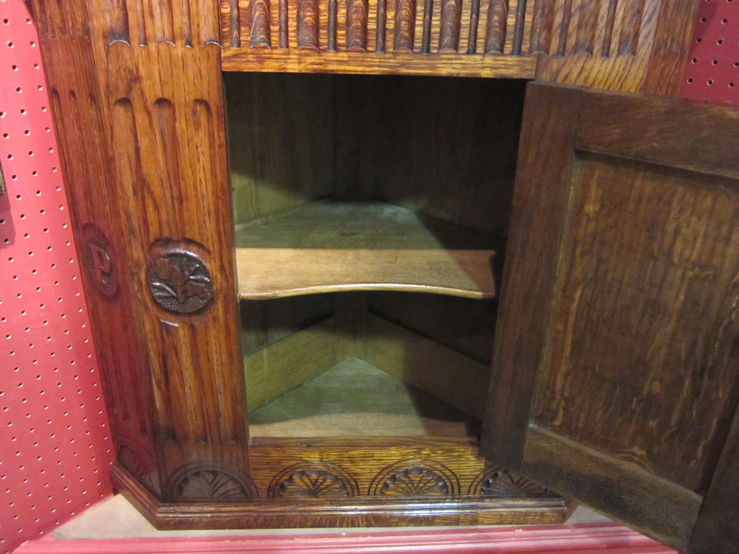 A corner cupboard of small proportions, dated "1933" with a "P" and oak leaf carvings, the panelled single door with pillared arch