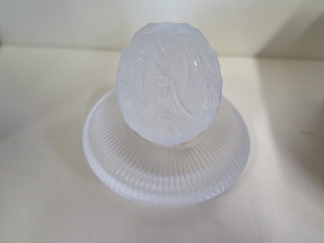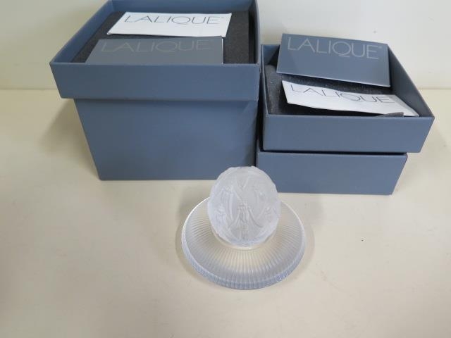 A Lalique Beetle decorated egg and stand, both boxed and good condition, total 7cm tall