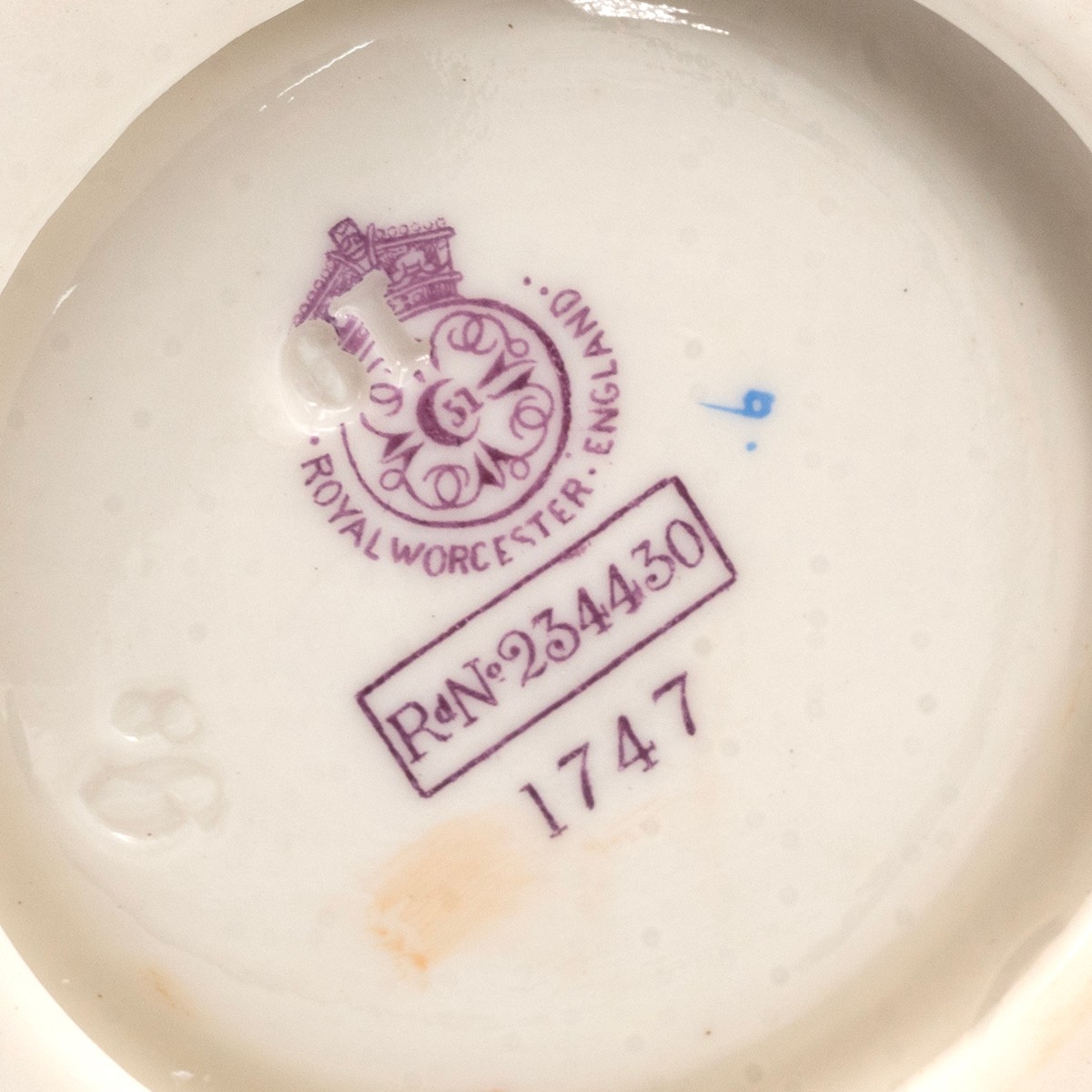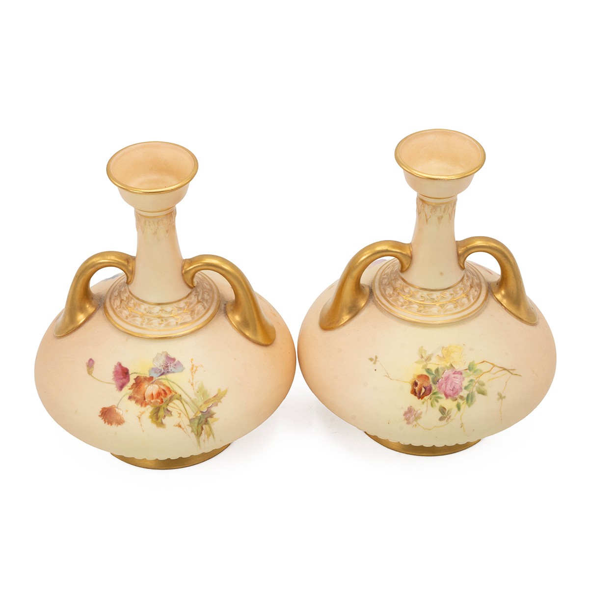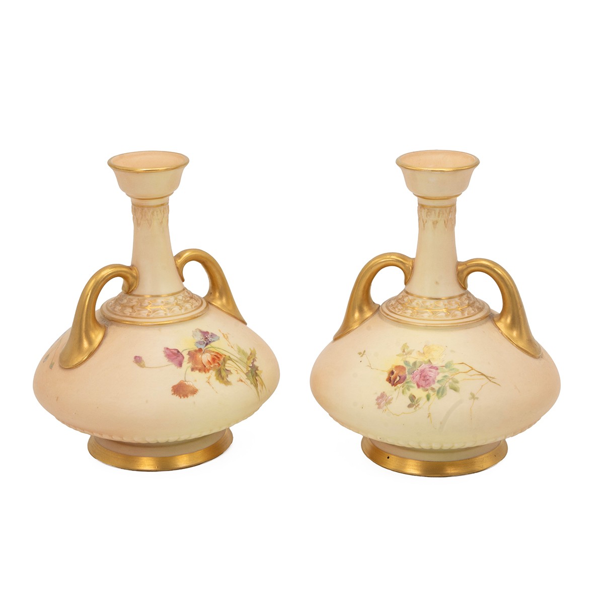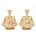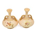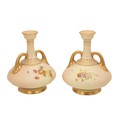 Raby for Royal Worcester - pair of early 20th century blush ivory vases hand decorated with spring flowers with ER monogram, parcel gilt, bottle form with twin gilt handles. Good Royal Worcester marks, with model number 1747 and registered design number 234430 (listed in 1894). Height 17cm. (2)