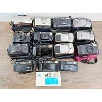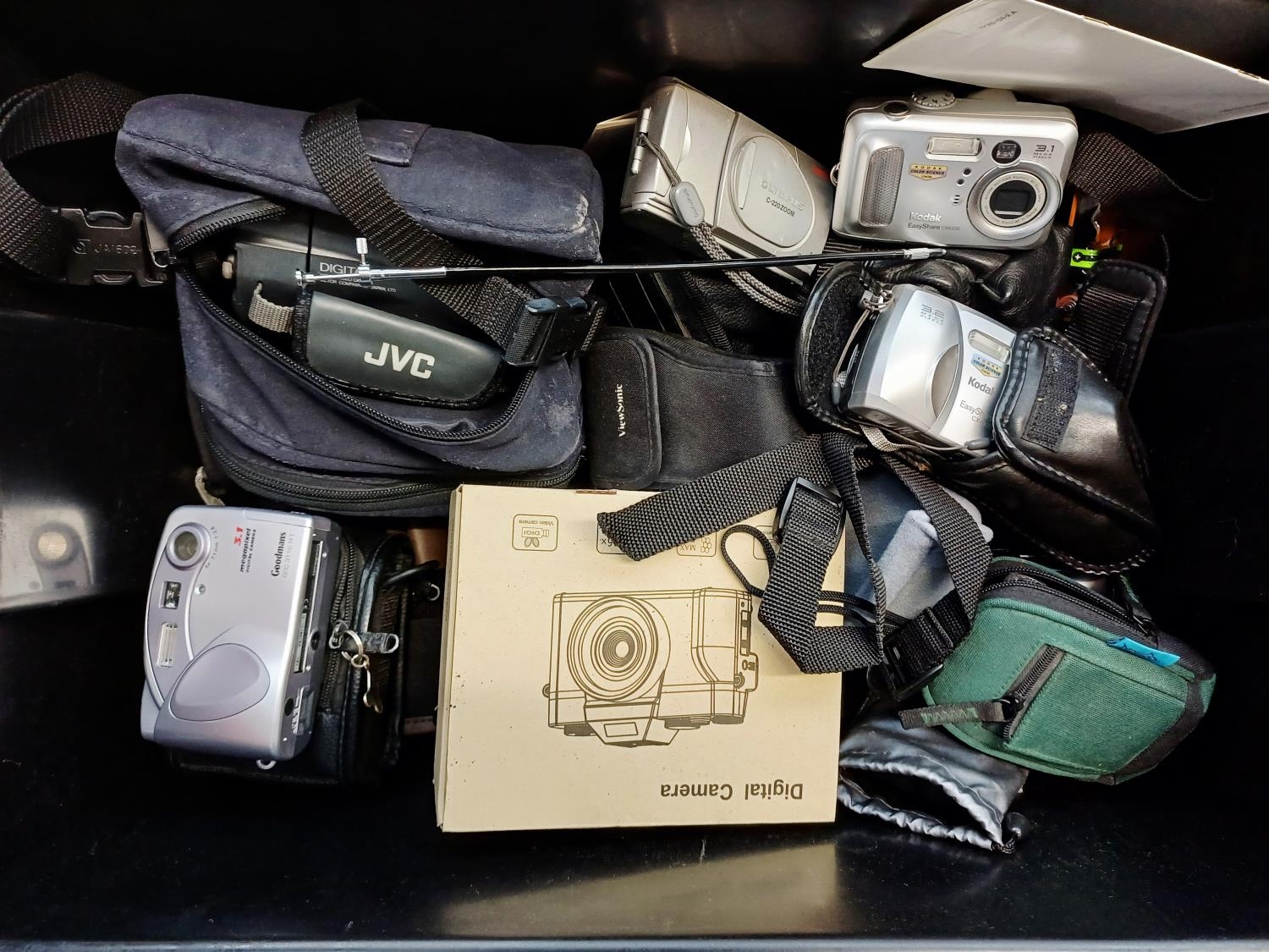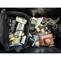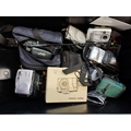 A box containing cameras and photography accessories