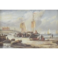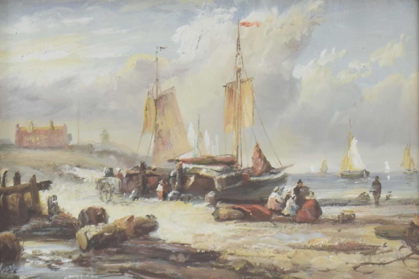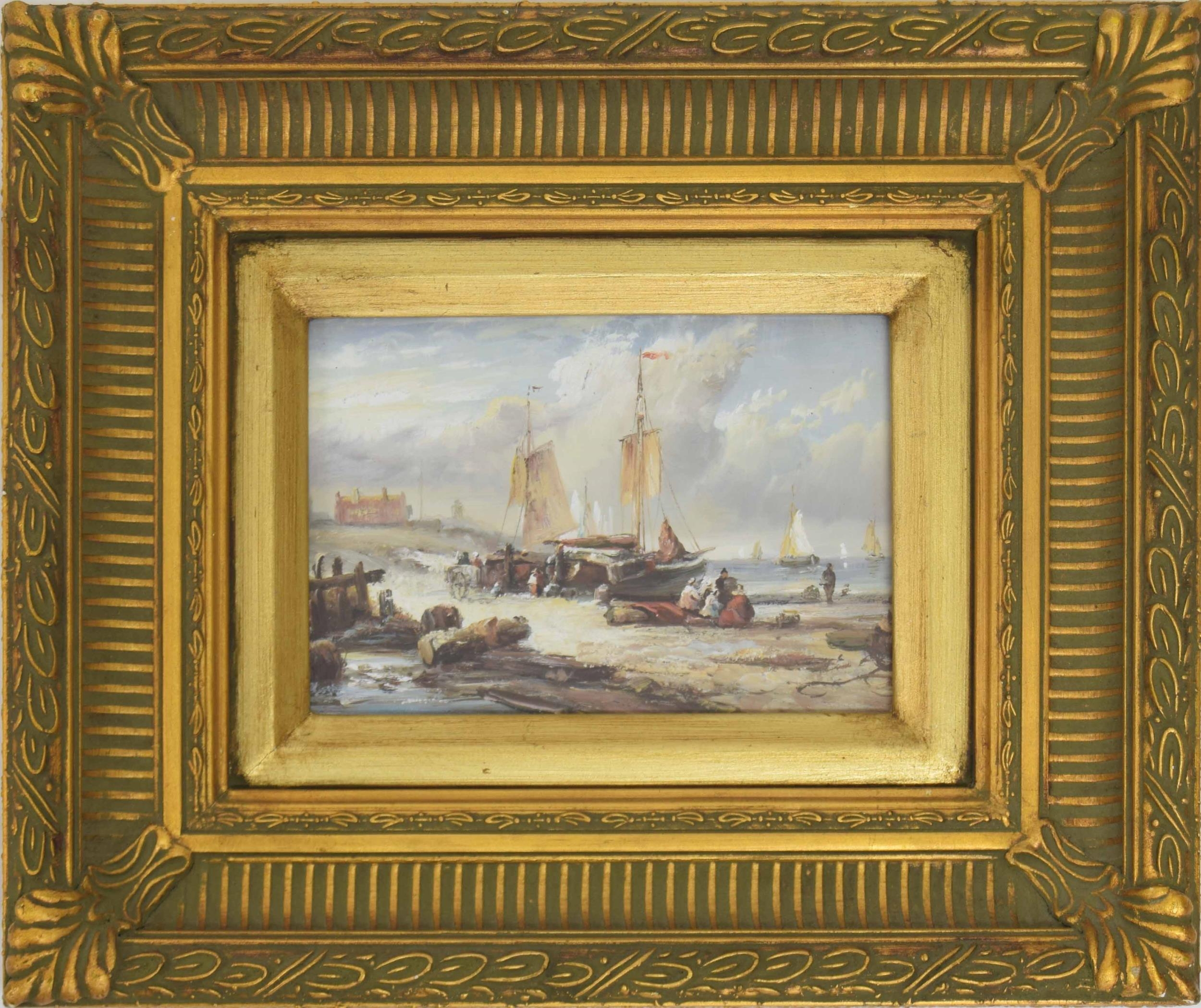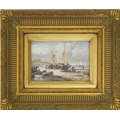 Continental School (20th century) - a beach scene at low tide with figures unloading fishing boats, cottages and a lighthouse beyond, oil on panel, 4.5" x 6.5"; gilded frame