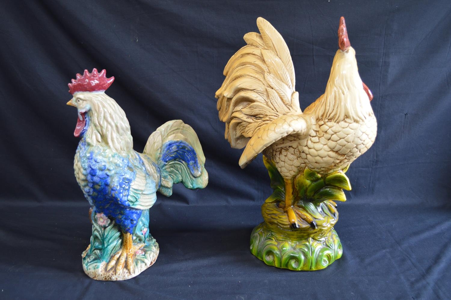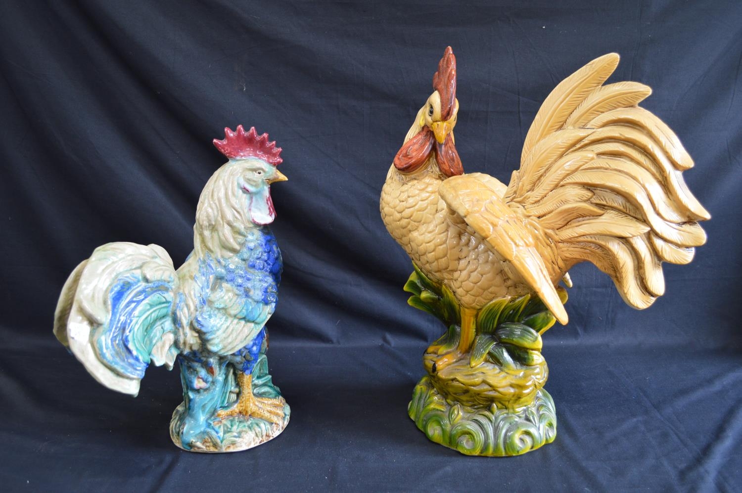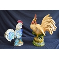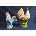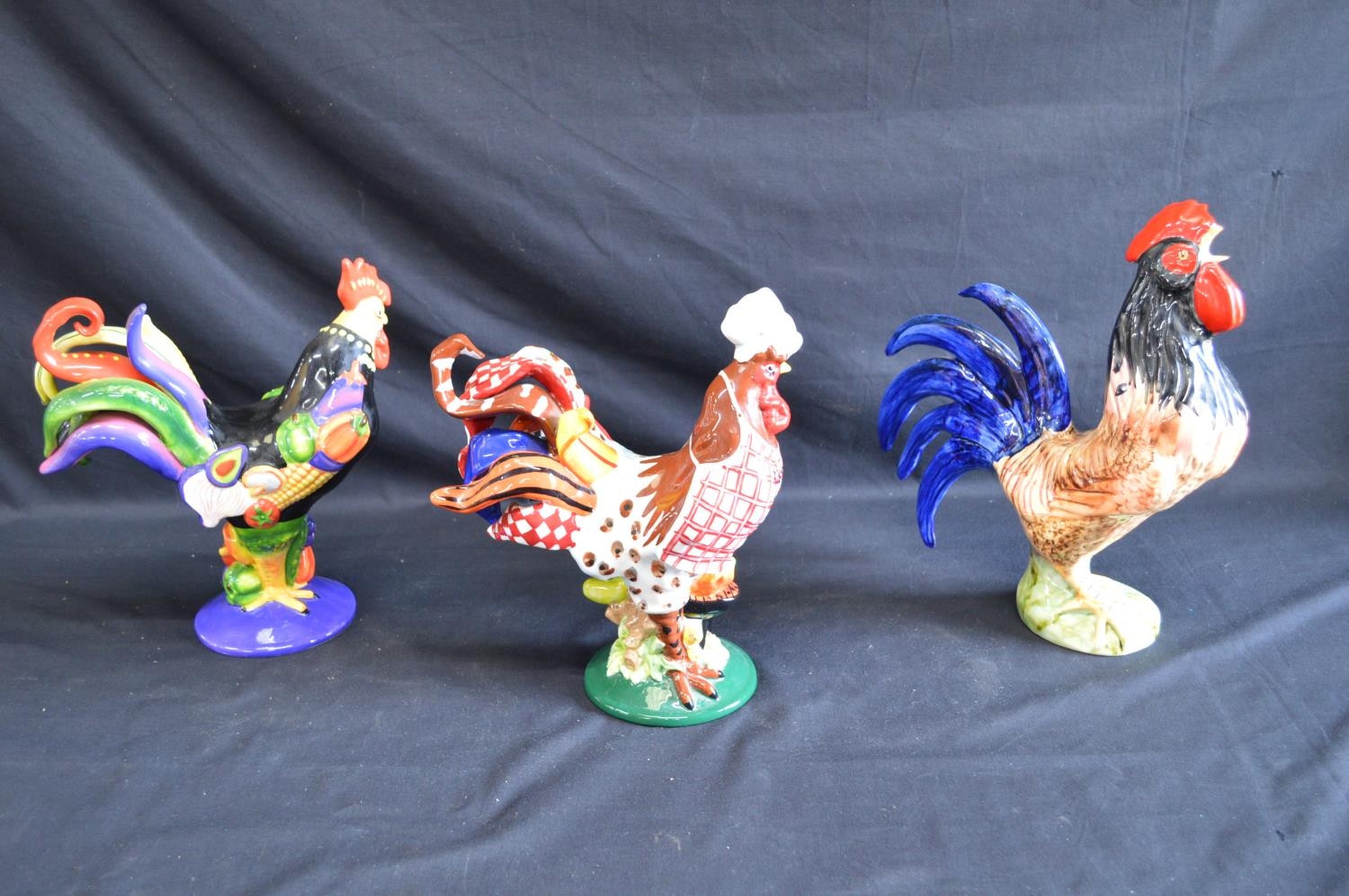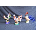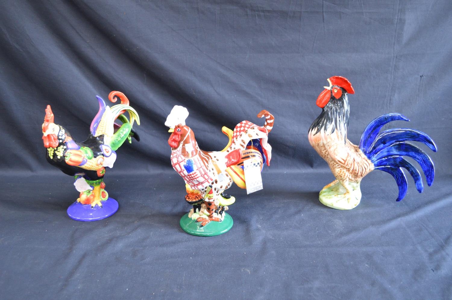 Two Sharon Neuhaus Poultry In Motion figures of cockerels together with three other cockerel figures - tallest 50cm tall