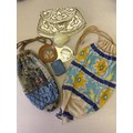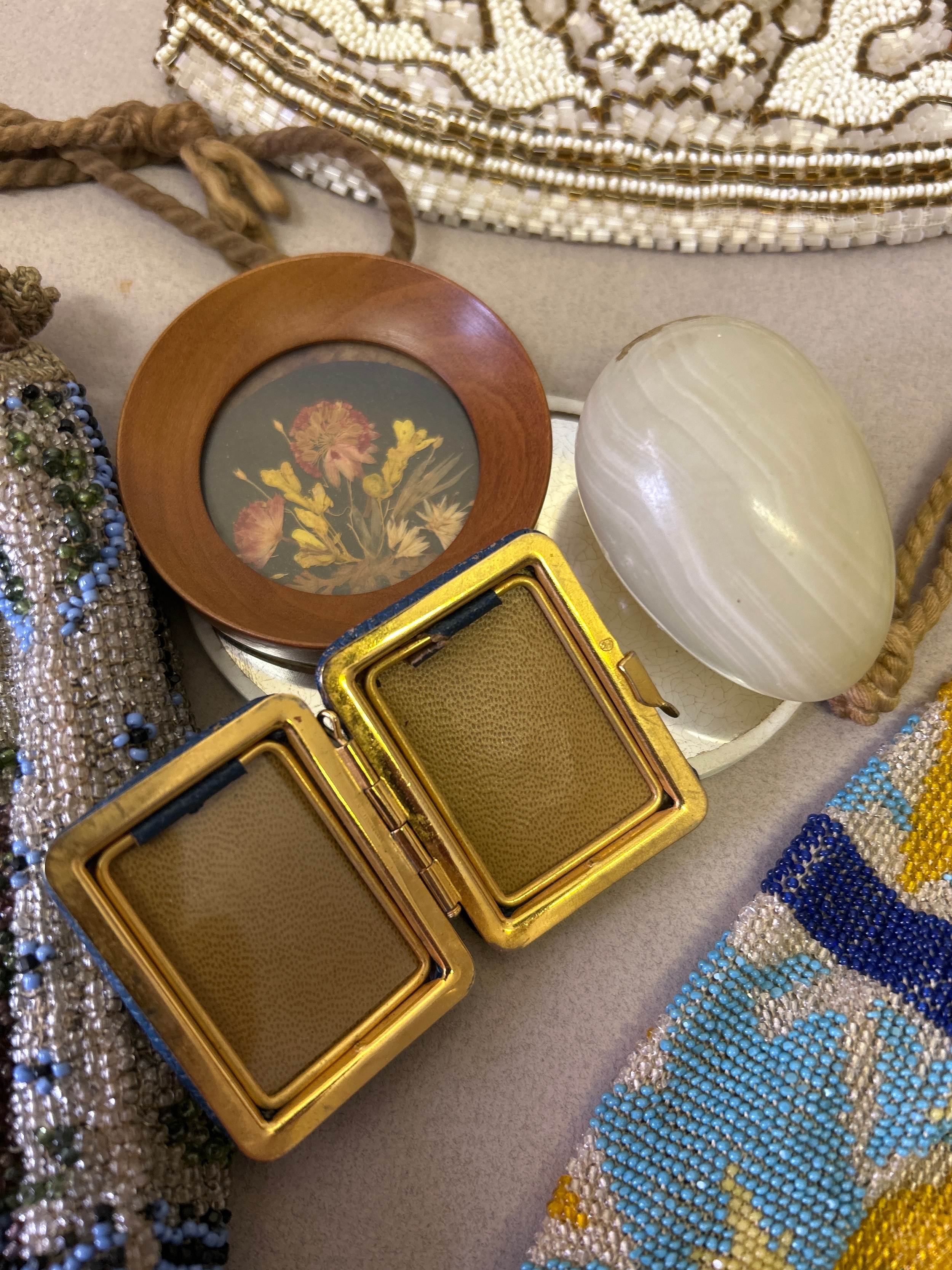 A decorative lot to include Edwardian & 1920’s beadwork evening bags, a sterling silver pill box, a blue leather photo locket, dried flowers in a wooden frame & onyx egg