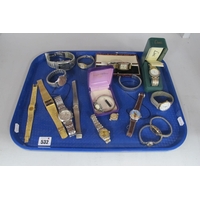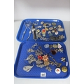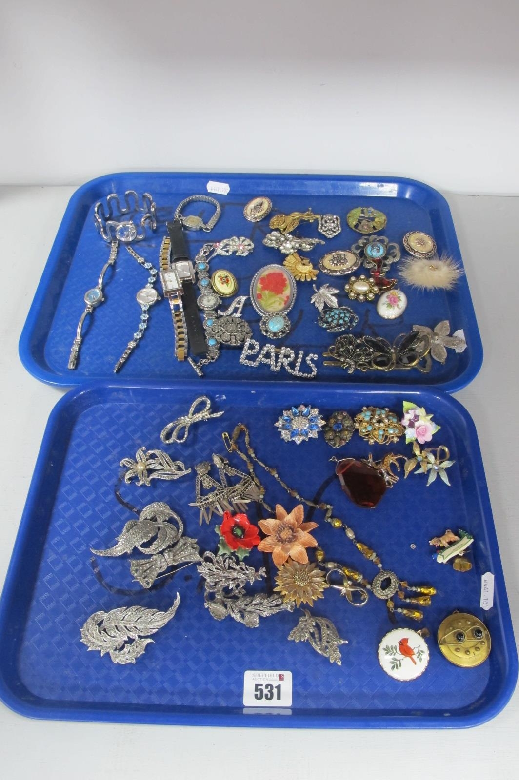 Vintage and Later Costume Jewellery, including brooches, Victorian locket back brooch (lacking pin / damaged), ladies wristwatches, necklace, earrings :- Two Trays