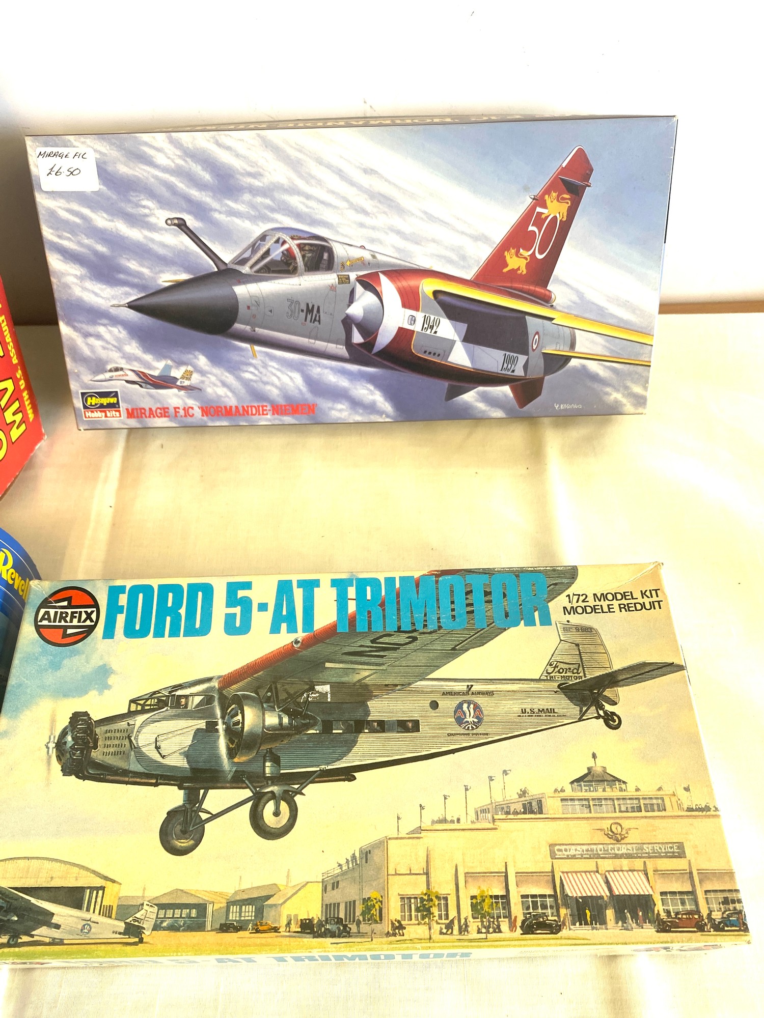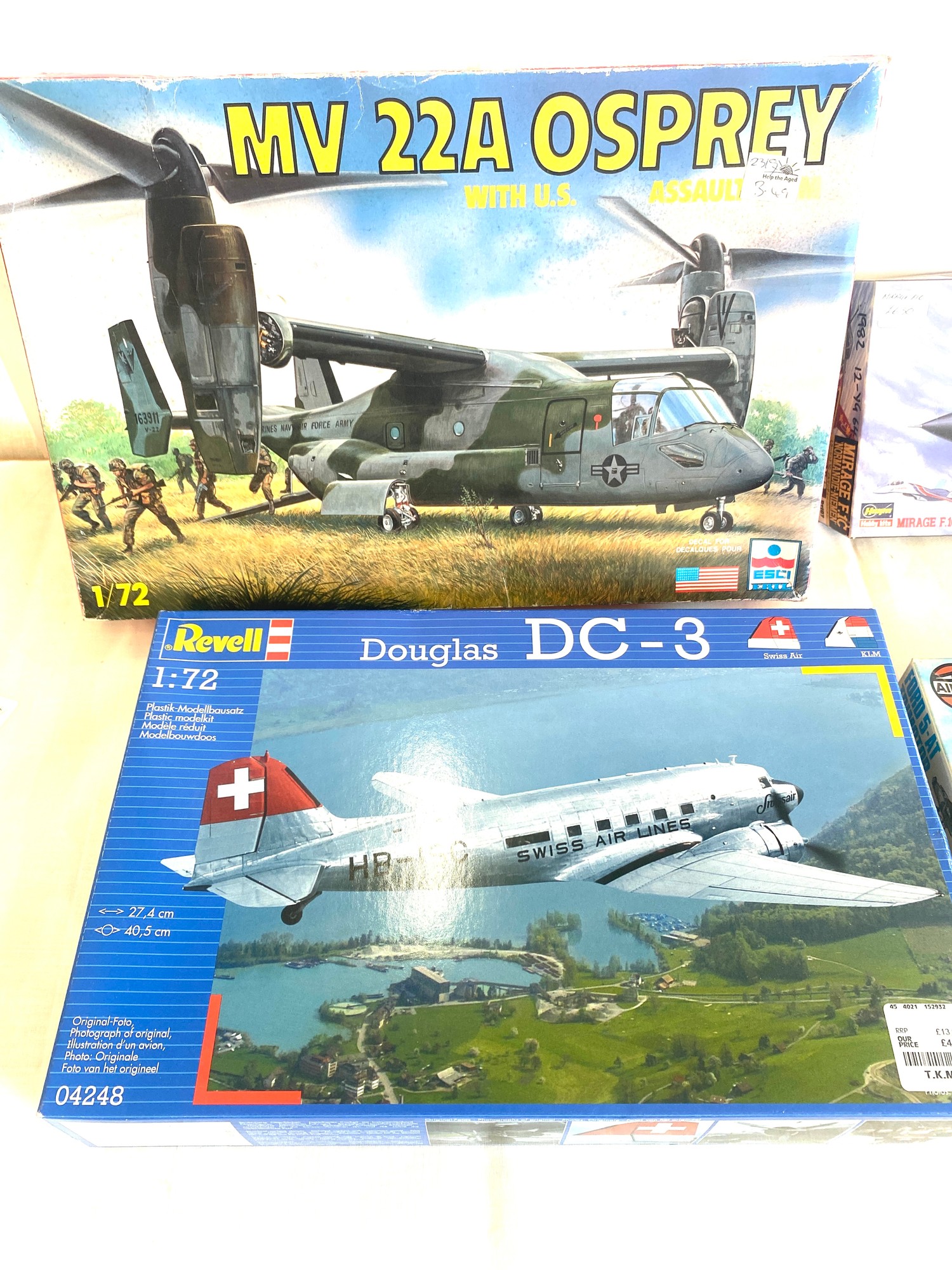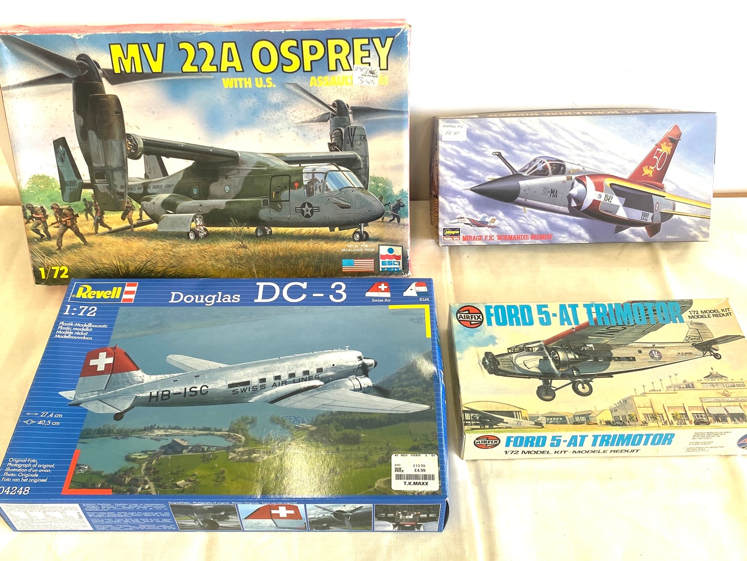 Selection of 4 boxed model air crafts includes,Osprey MV 22A, Mirage F.1C Normadie-Nuemen, Revell Douglas DC-3, Ford 5-AT Trimotor