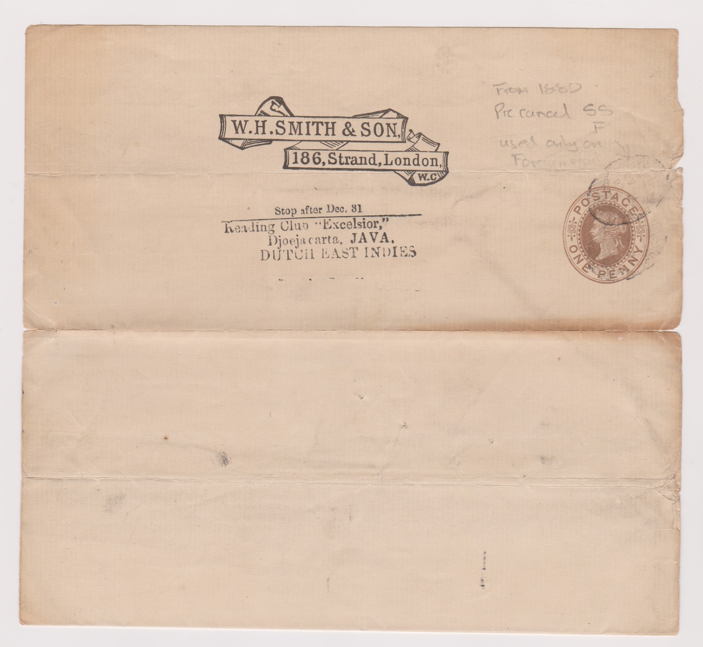 Great Britain-Michel S10 prepaid wrapper for overseas use printed for W.H. Smith and Son-Strand, London posted to Java cancelled on 1d brown postage