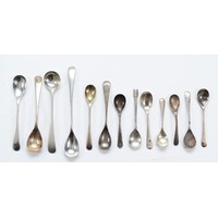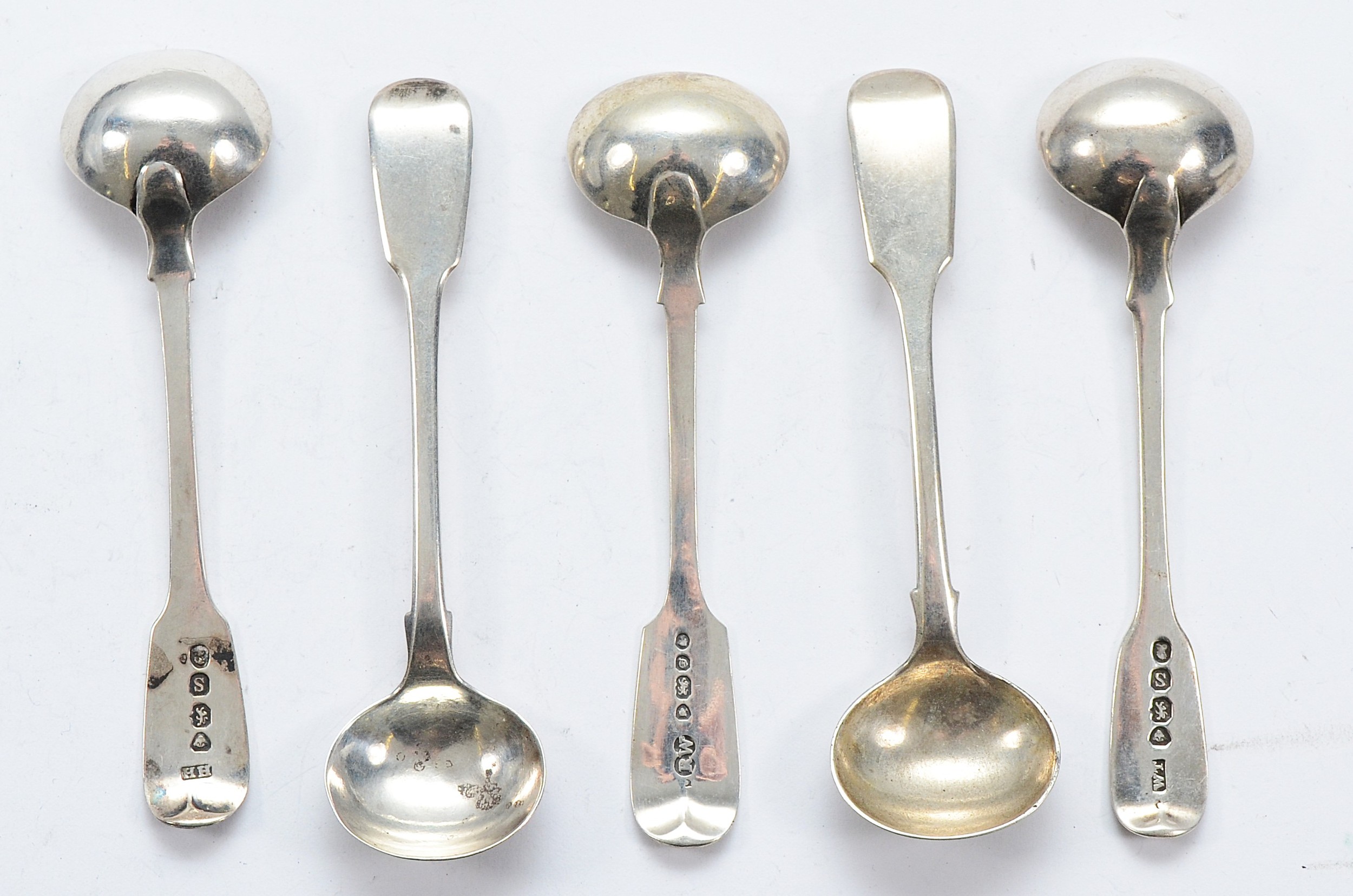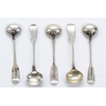 A collection of five Georgian and later silver fiddle pattern salt spoons, London 1833, 1833, 1833, 1864, 1851, 65gm.