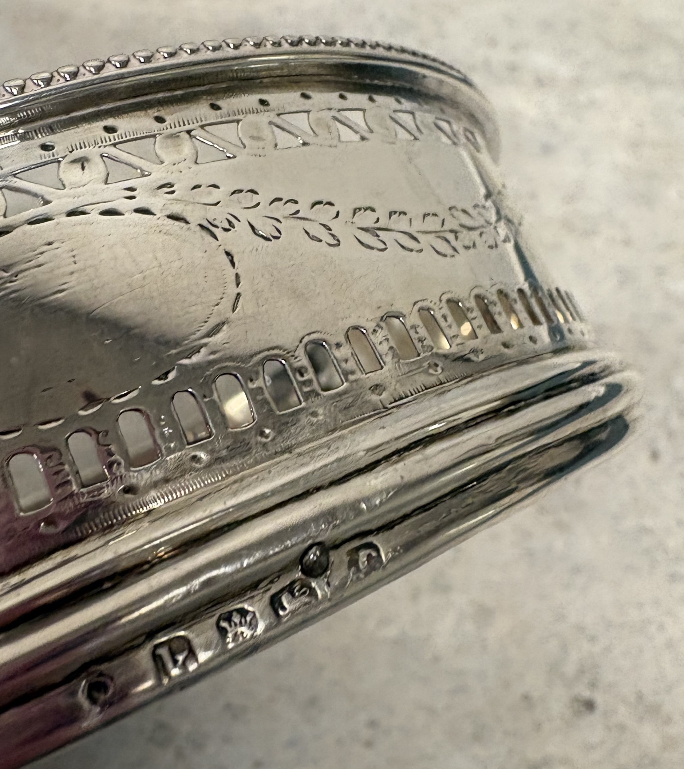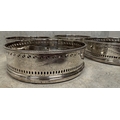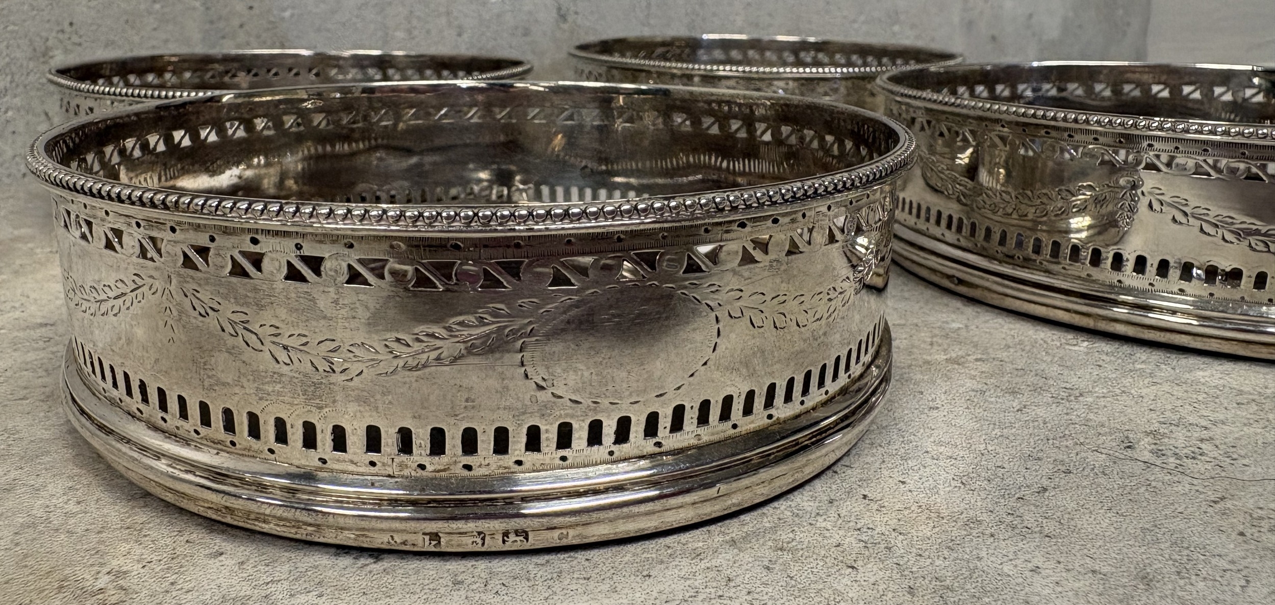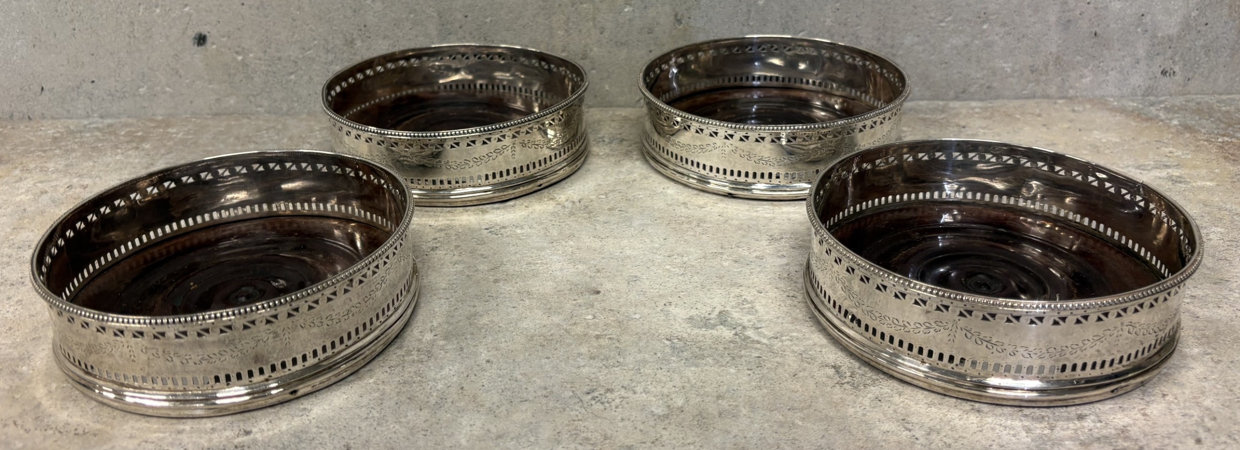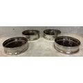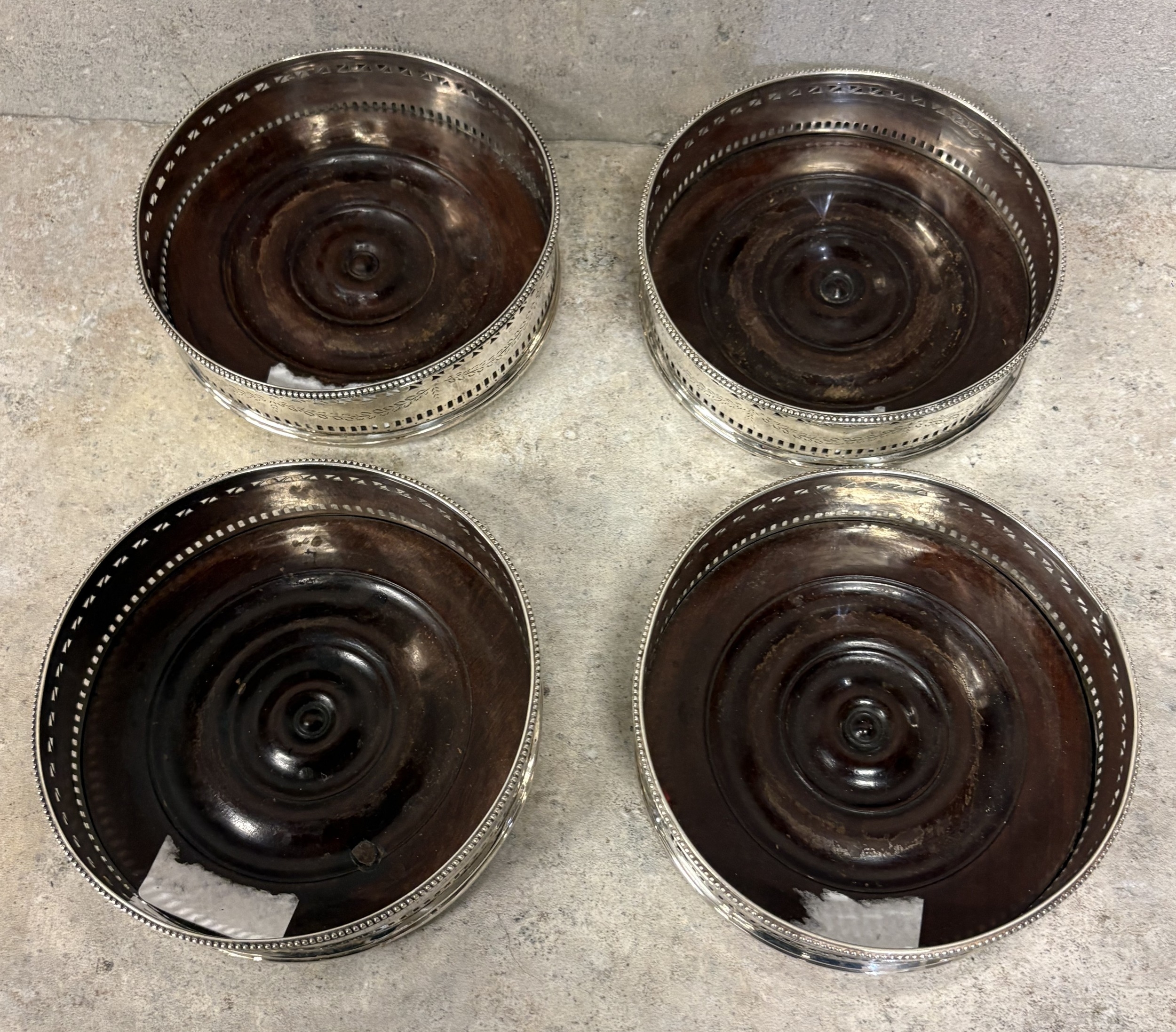 A set of four 18th Century George III silver-mounted wine coasters. London 1785. Approx. 569 grams of gross weight. Est. £1000 - £1500.