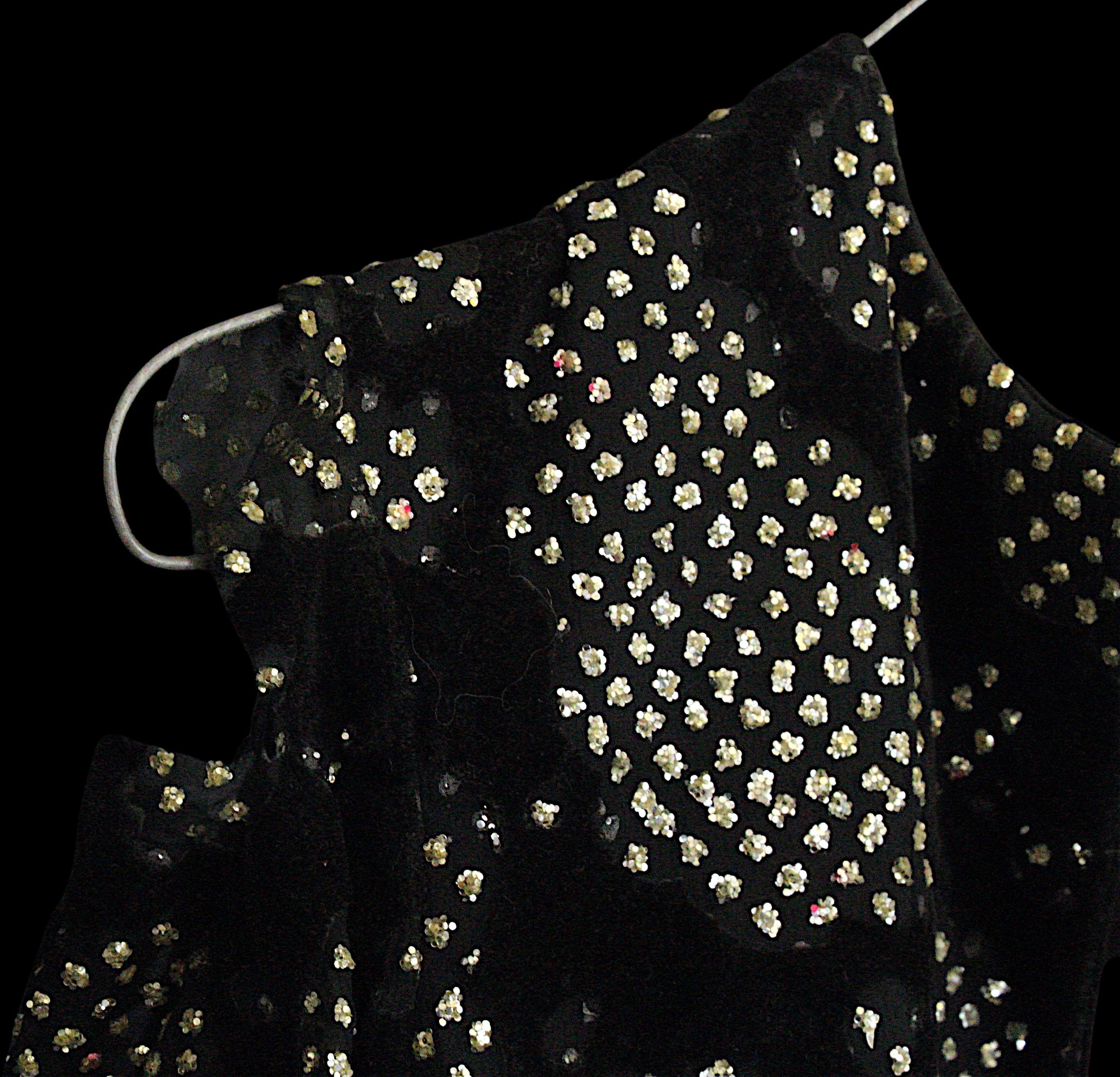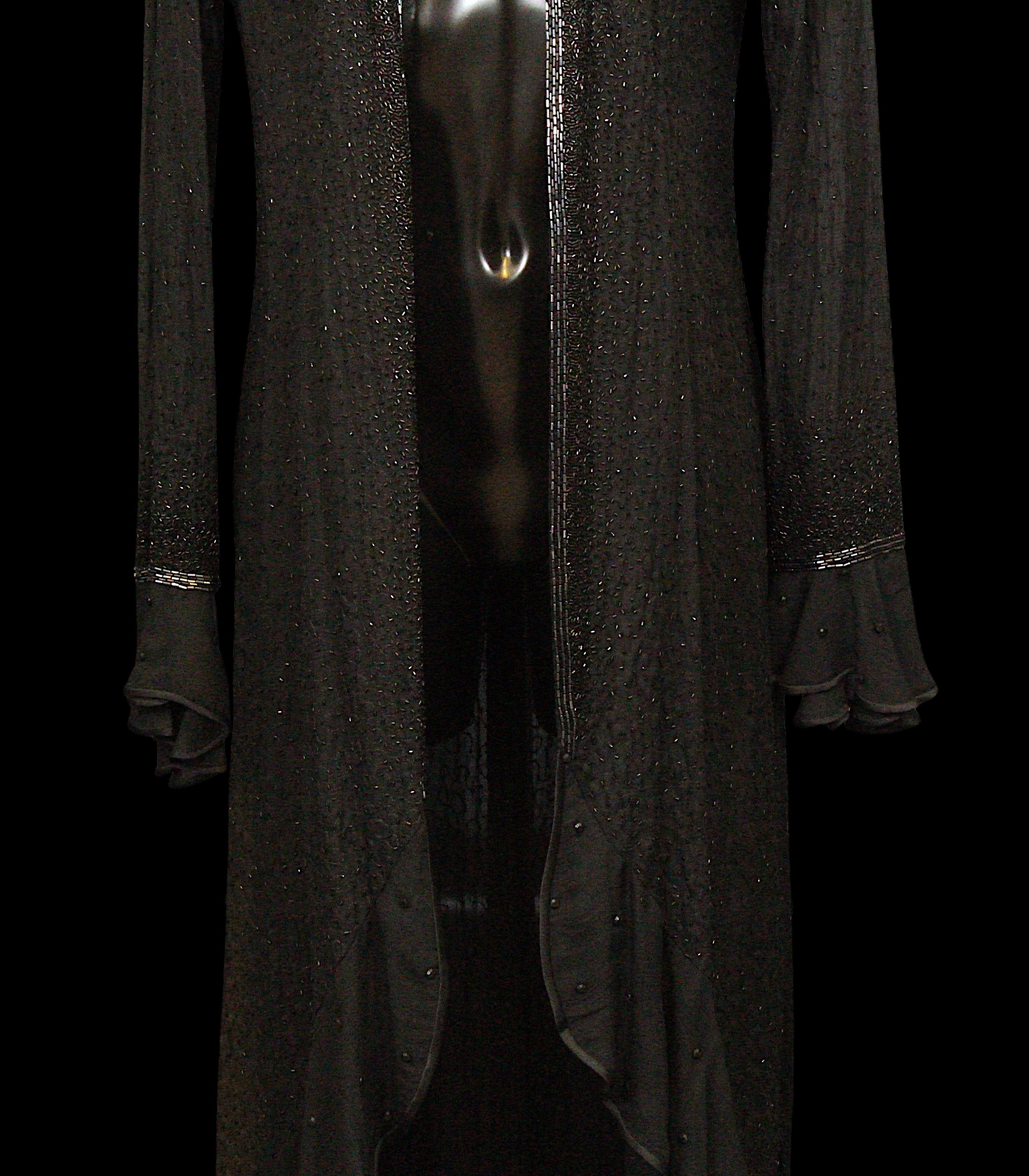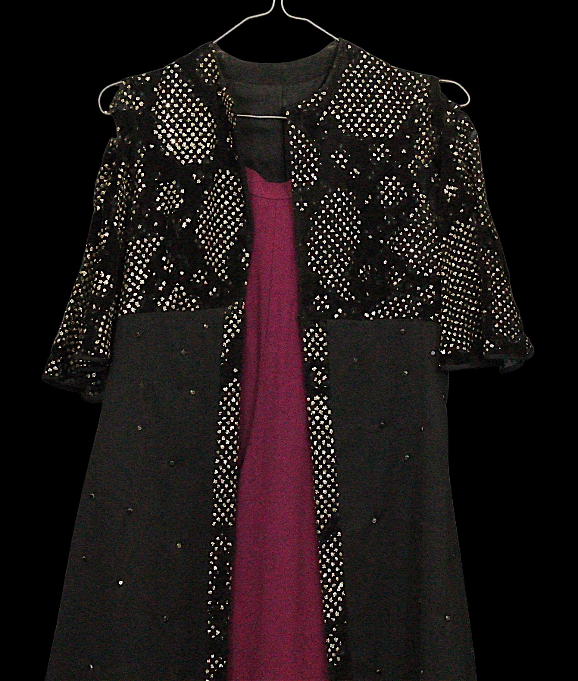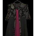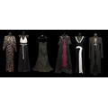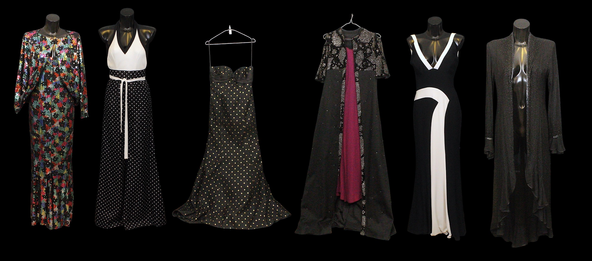 predominantly in dark colours including; a black long sleeved evening coat, embellished with beads; a black maxi dress with white trim and geometric motif, waist flat approximately 38cm; a black evening coat, upper and trim in flock type finish, embellished with silver sequins; a pair of light coloured plum trousers, waist flat approximately 32cm; a Jovani strapless full length black gown, patterned with gold glitter polka dots, bone bodice, labelled size 10; a black and white polka dot jumpsuit, halter neck, flat waist approximately 30cm, and a black chiffon evening dress and matching short evening coat, embellished with multicoloured sequins, dress waist flat 37cm approximately (8)