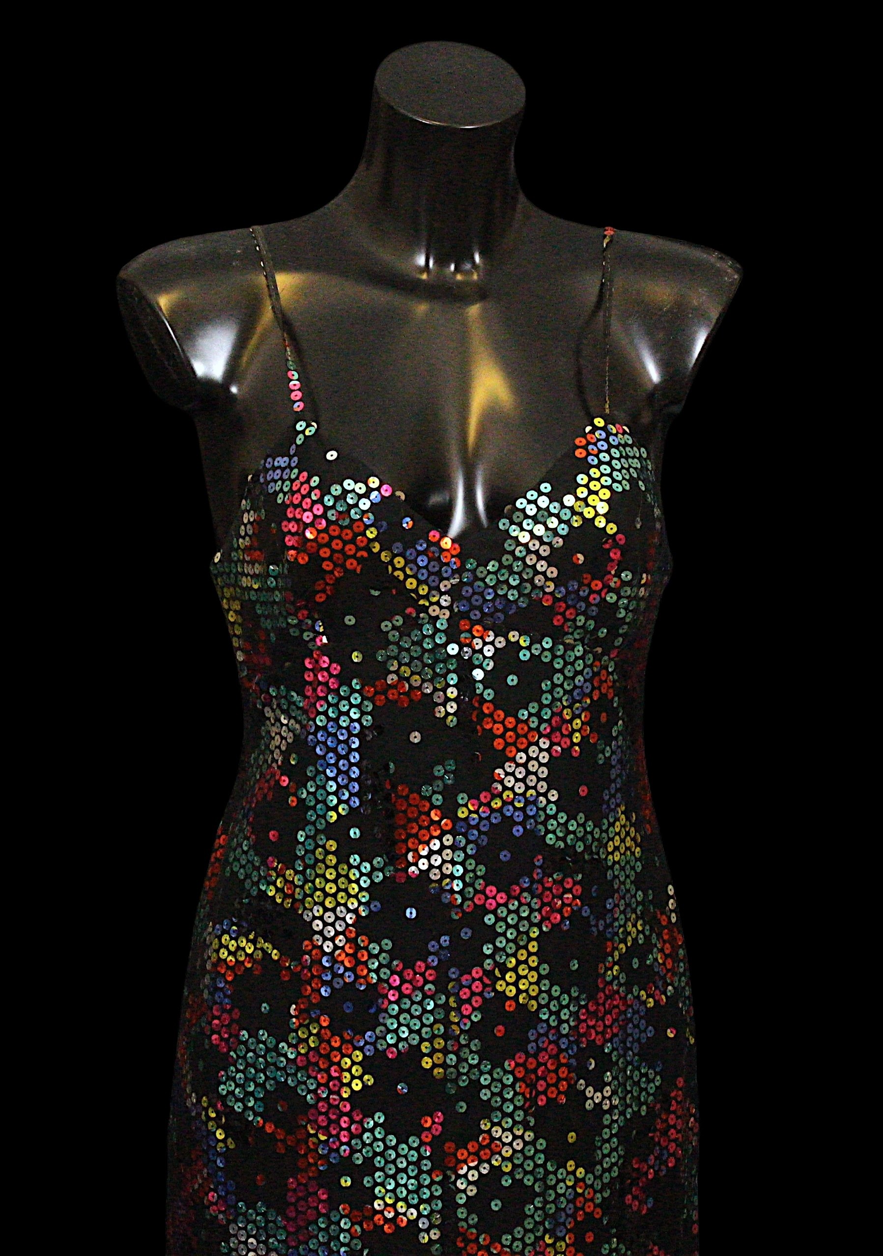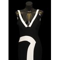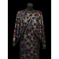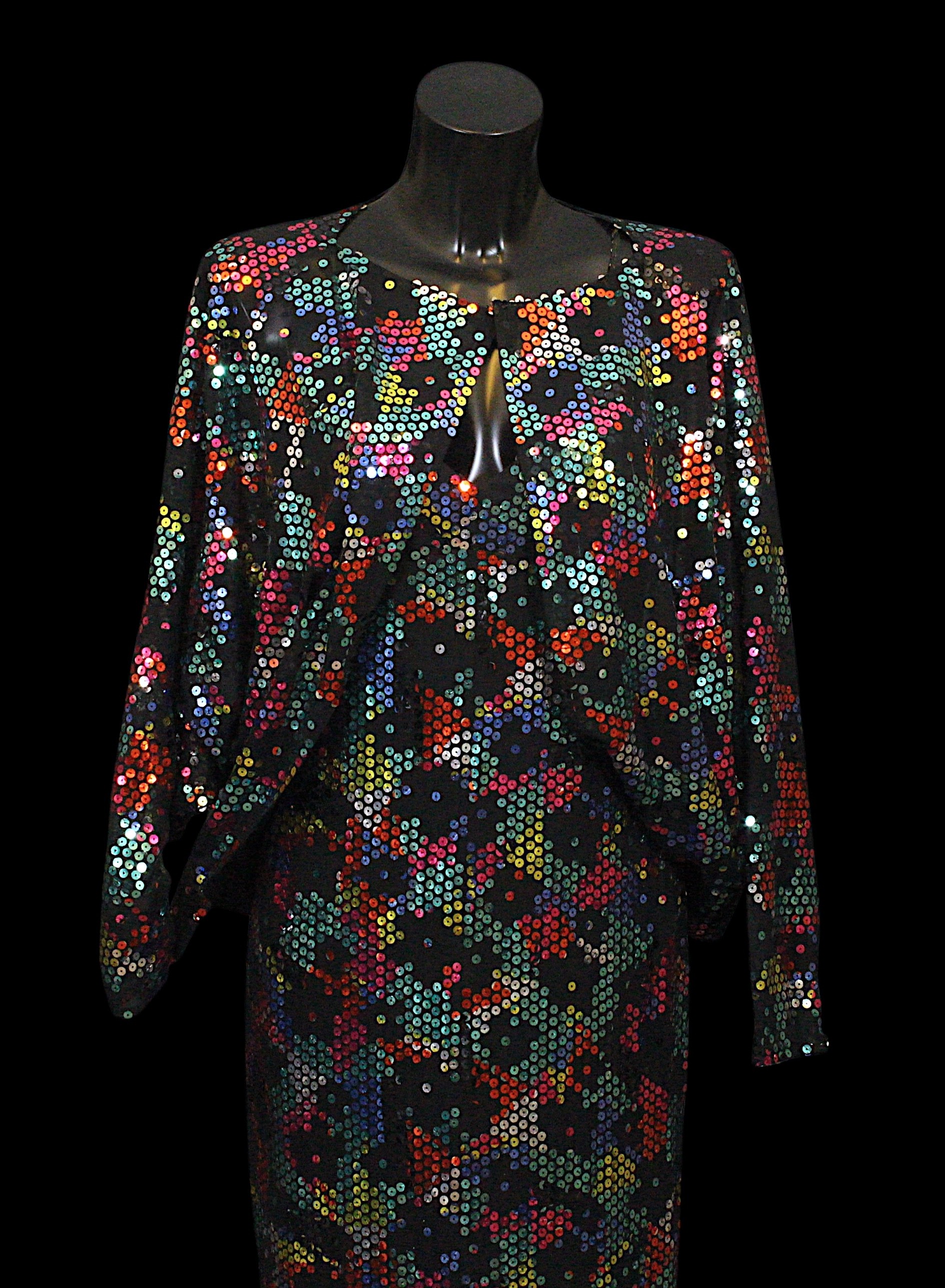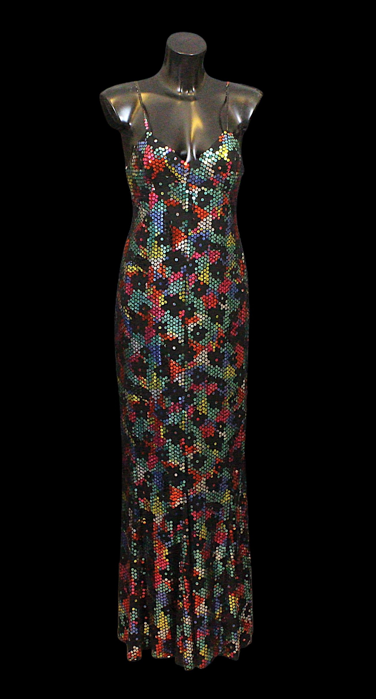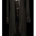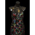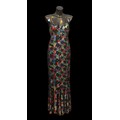 predominantly in dark colours including; a black long sleeved evening coat, embellished with beads; a black maxi dress with white trim and geometric motif, waist flat approximately 38cm; a black evening coat, upper and trim in flock type finish, embellished with silver sequins; a pair of light coloured plum trousers, waist flat approximately 32cm; a Jovani strapless full length black gown, patterned with gold glitter polka dots, bone bodice, labelled size 10; a black and white polka dot jumpsuit, halter neck, flat waist approximately 30cm, and a black chiffon evening dress and matching short evening coat, embellished with multicoloured sequins, dress waist flat 37cm approximately (8)