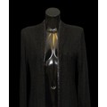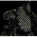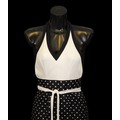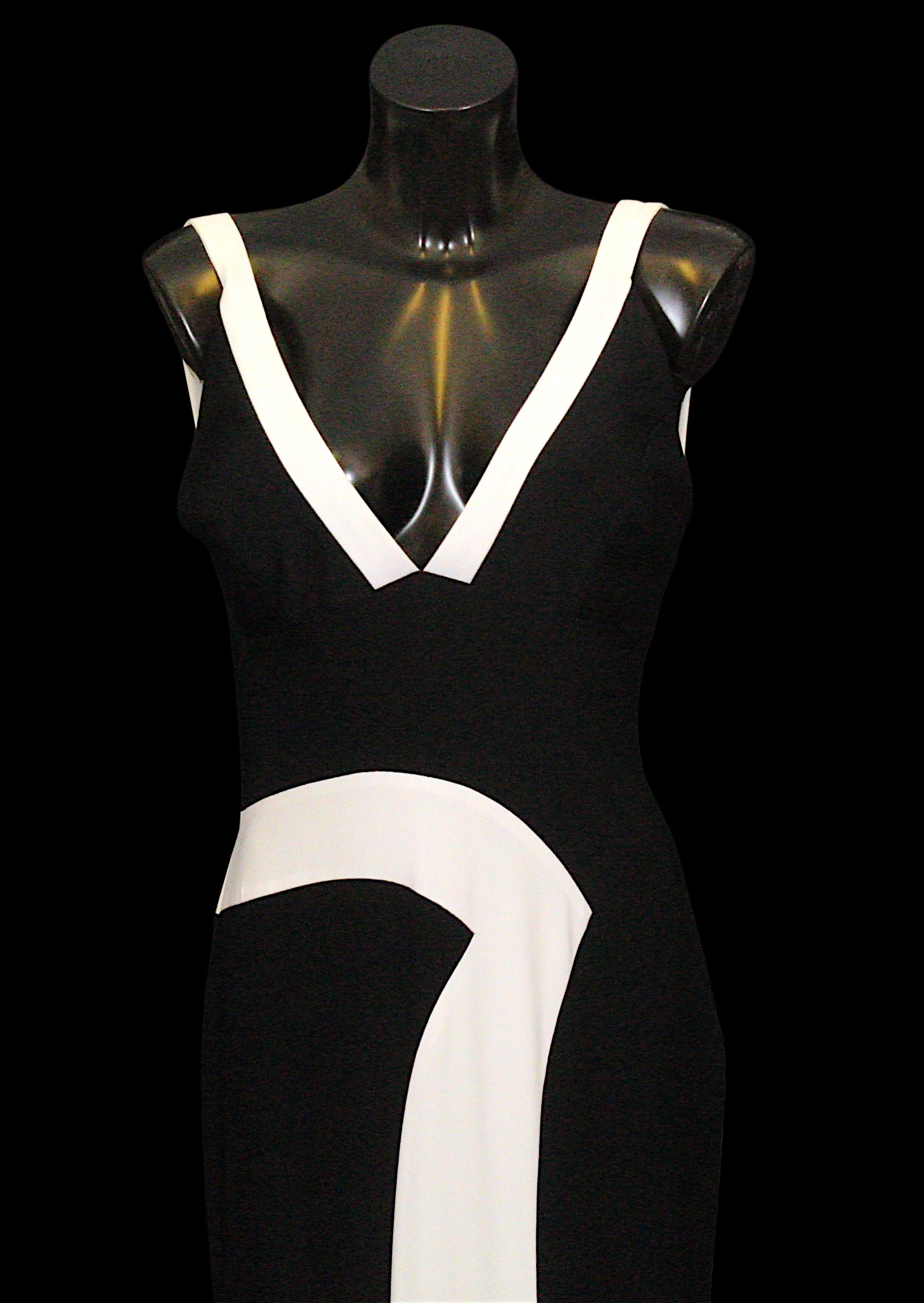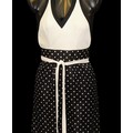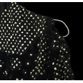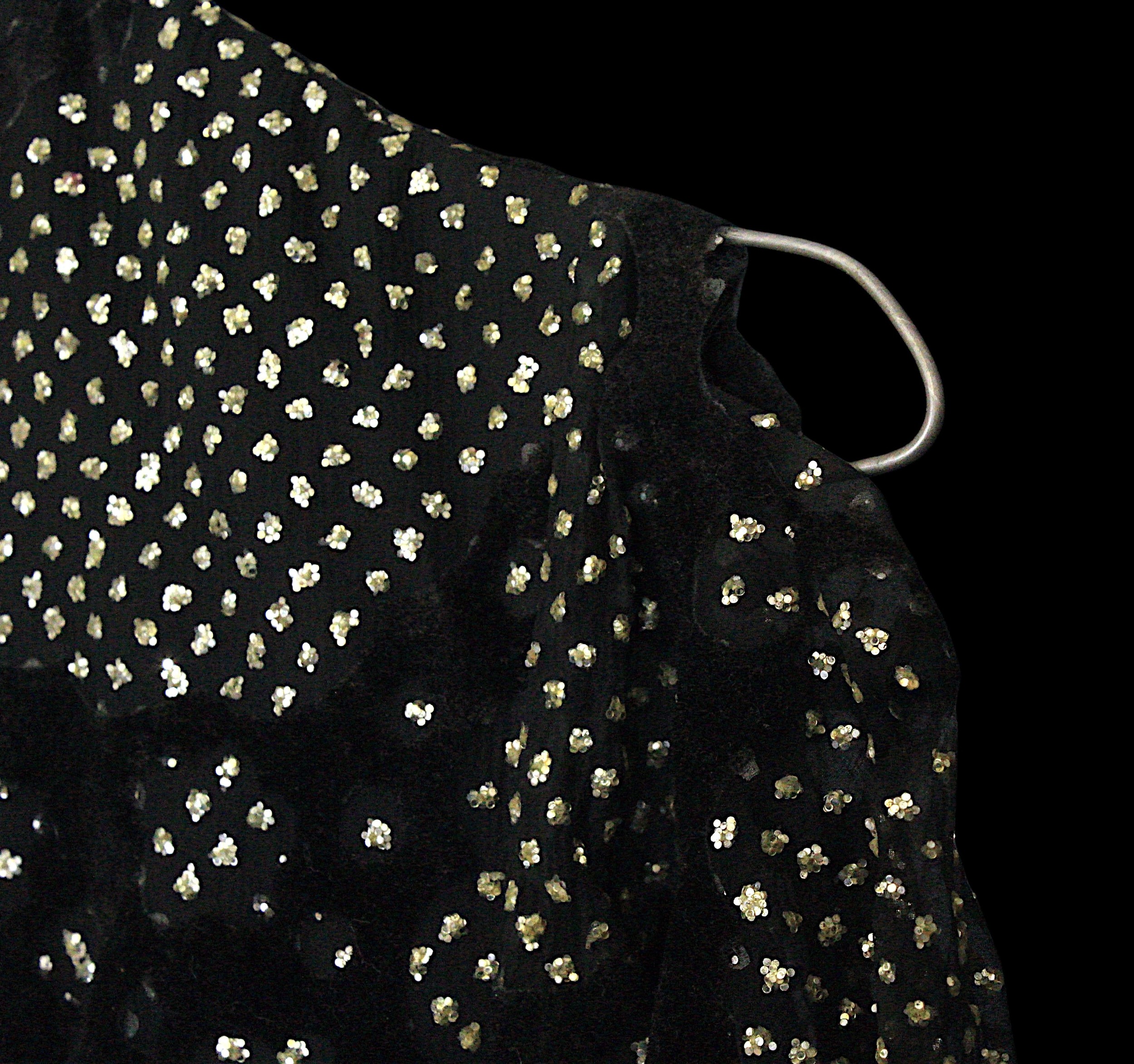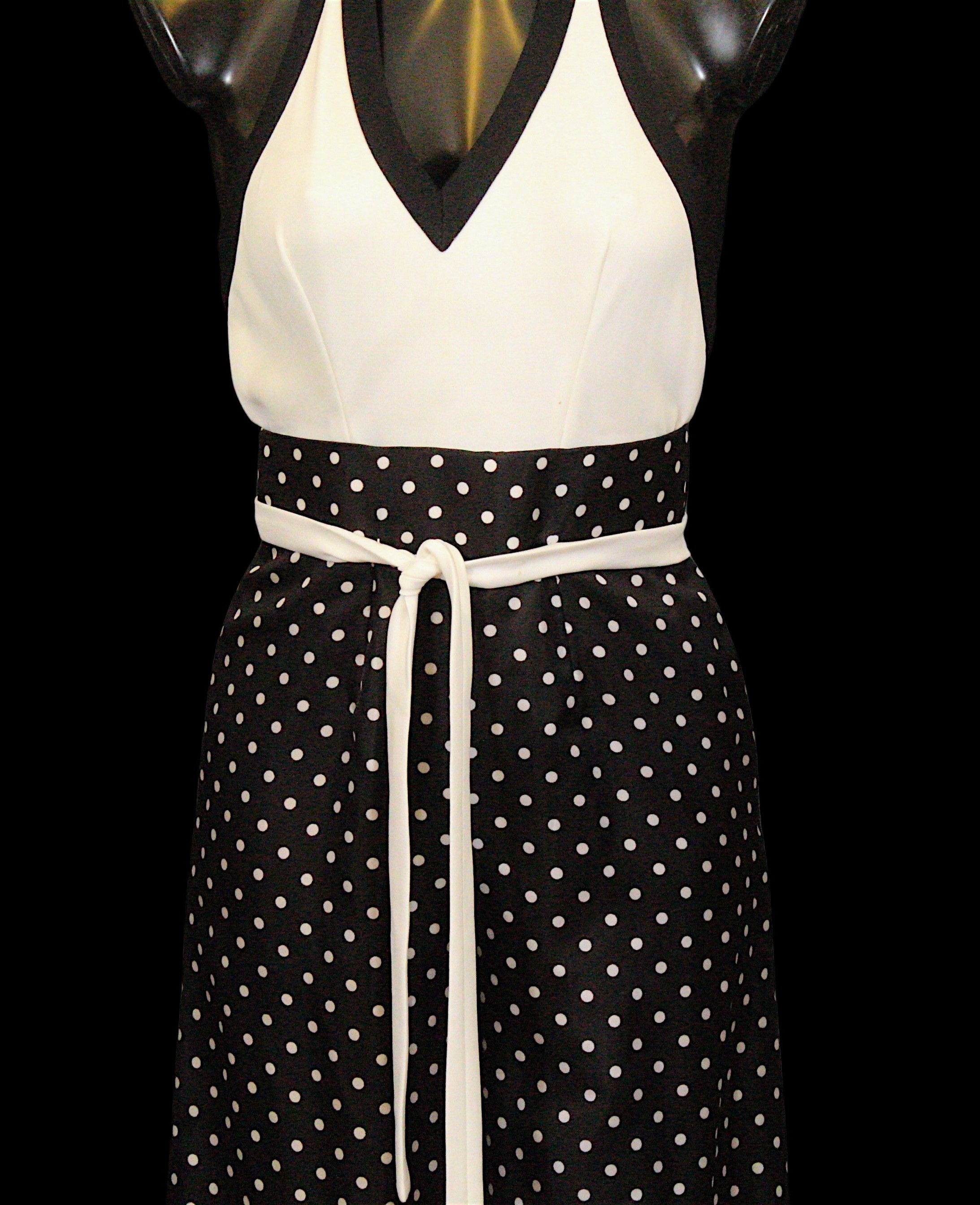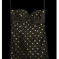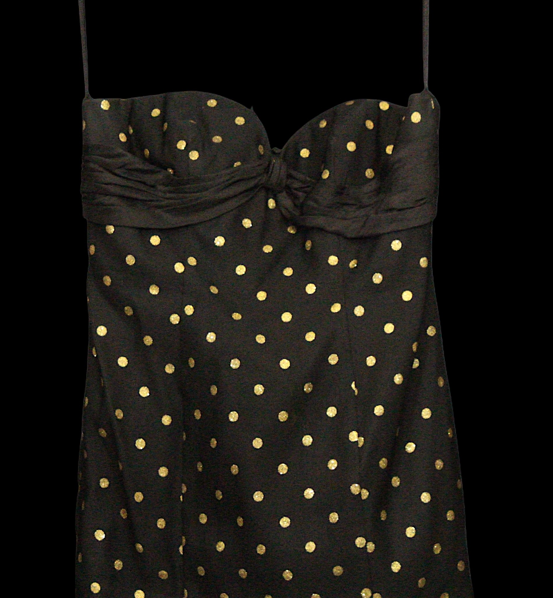 predominantly in dark colours including; a black long sleeved evening coat, embellished with beads; a black maxi dress with white trim and geometric motif, waist flat approximately 38cm; a black evening coat, upper and trim in flock type finish, embellished with silver sequins; a pair of light coloured plum trousers, waist flat approximately 32cm; a Jovani strapless full length black gown, patterned with gold glitter polka dots, bone bodice, labelled size 10; a black and white polka dot jumpsuit, halter neck, flat waist approximately 30cm, and a black chiffon evening dress and matching short evening coat, embellished with multicoloured sequins, dress waist flat 37cm approximately (8)