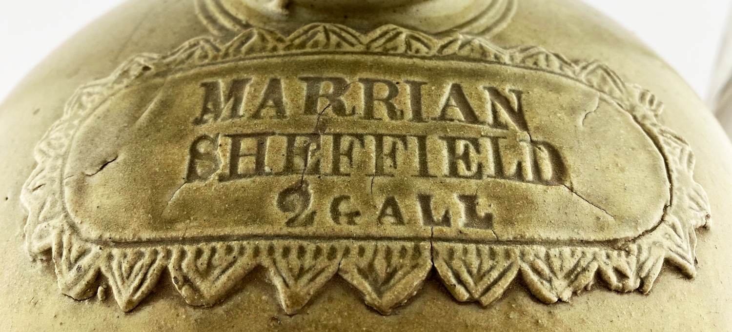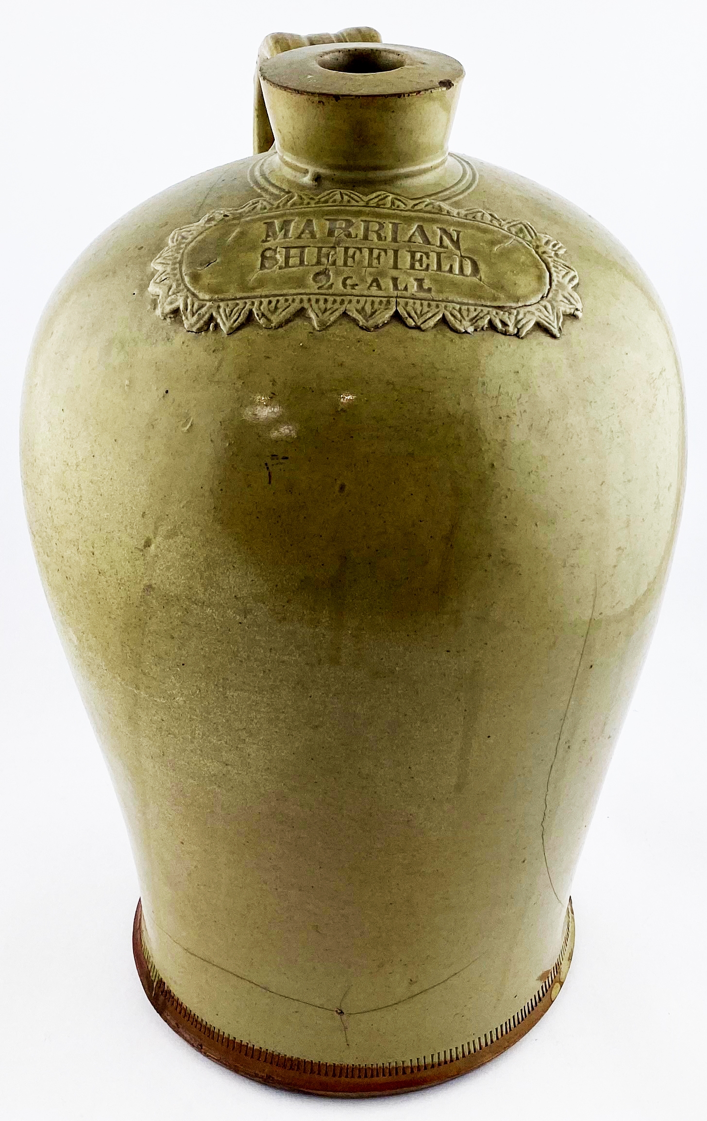 SHEFFIELD FLAGON. 15.5ins. Green/ grey, handled, impressed pie crust seal MARRIAN. Body crack & lip chip.