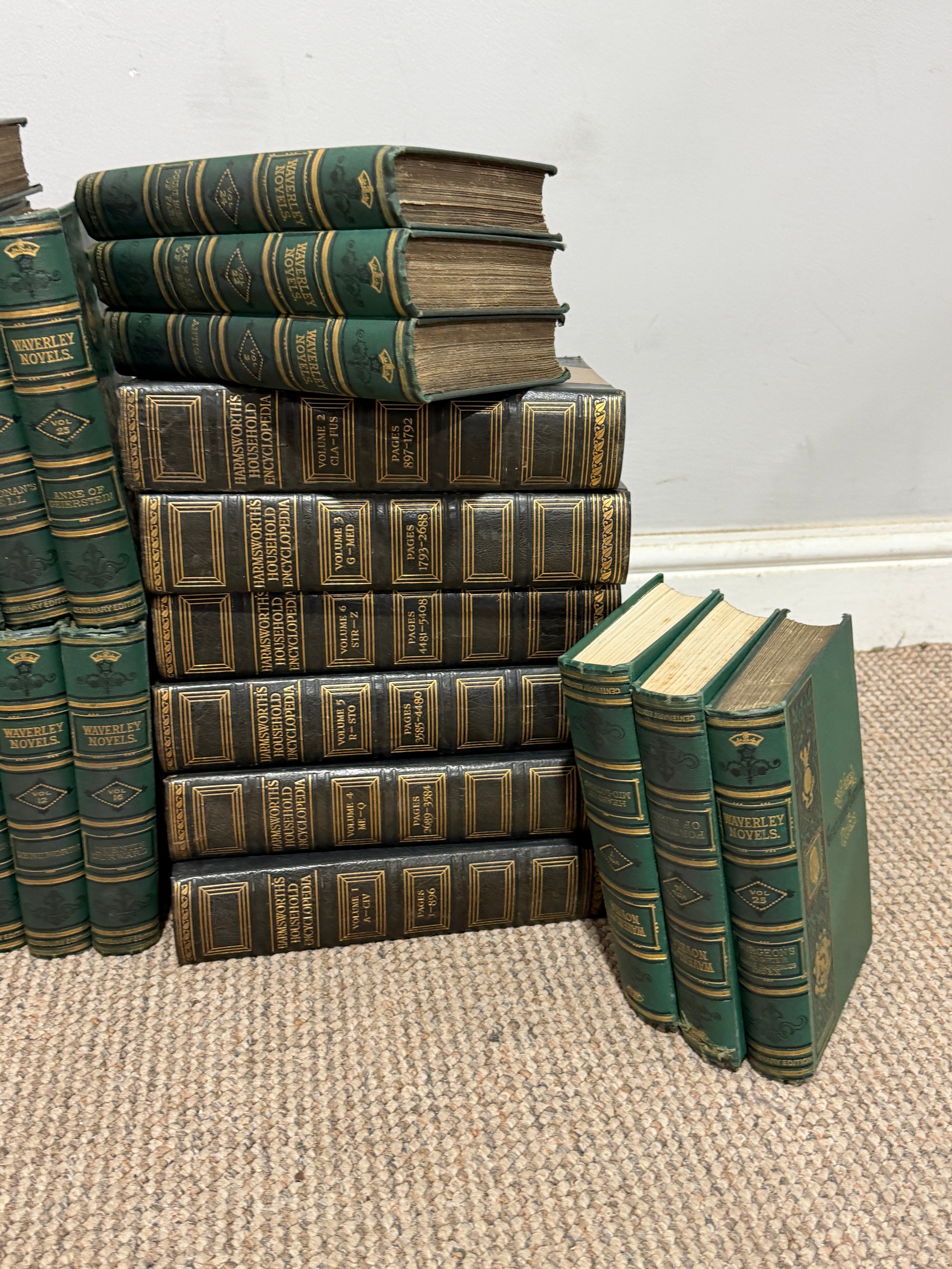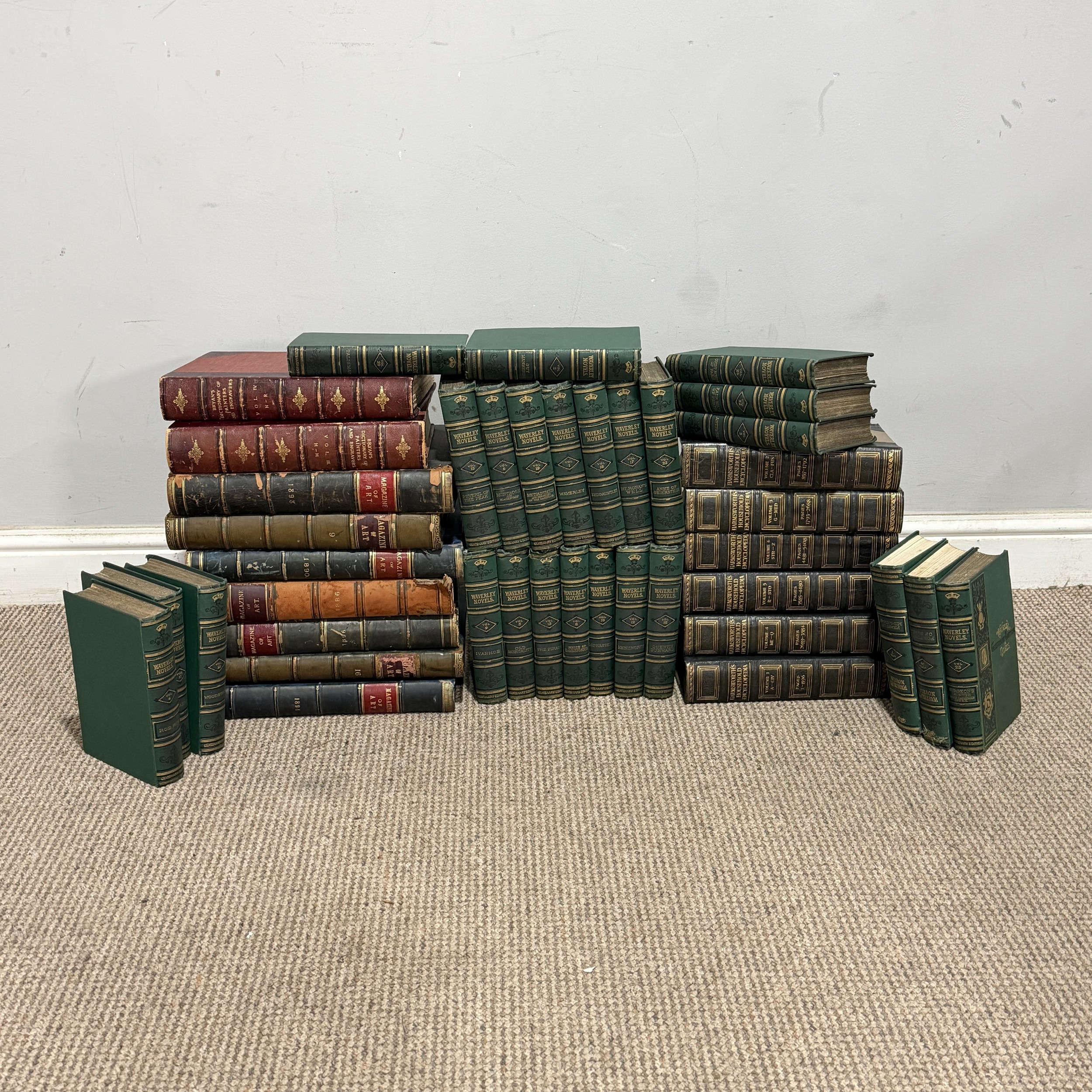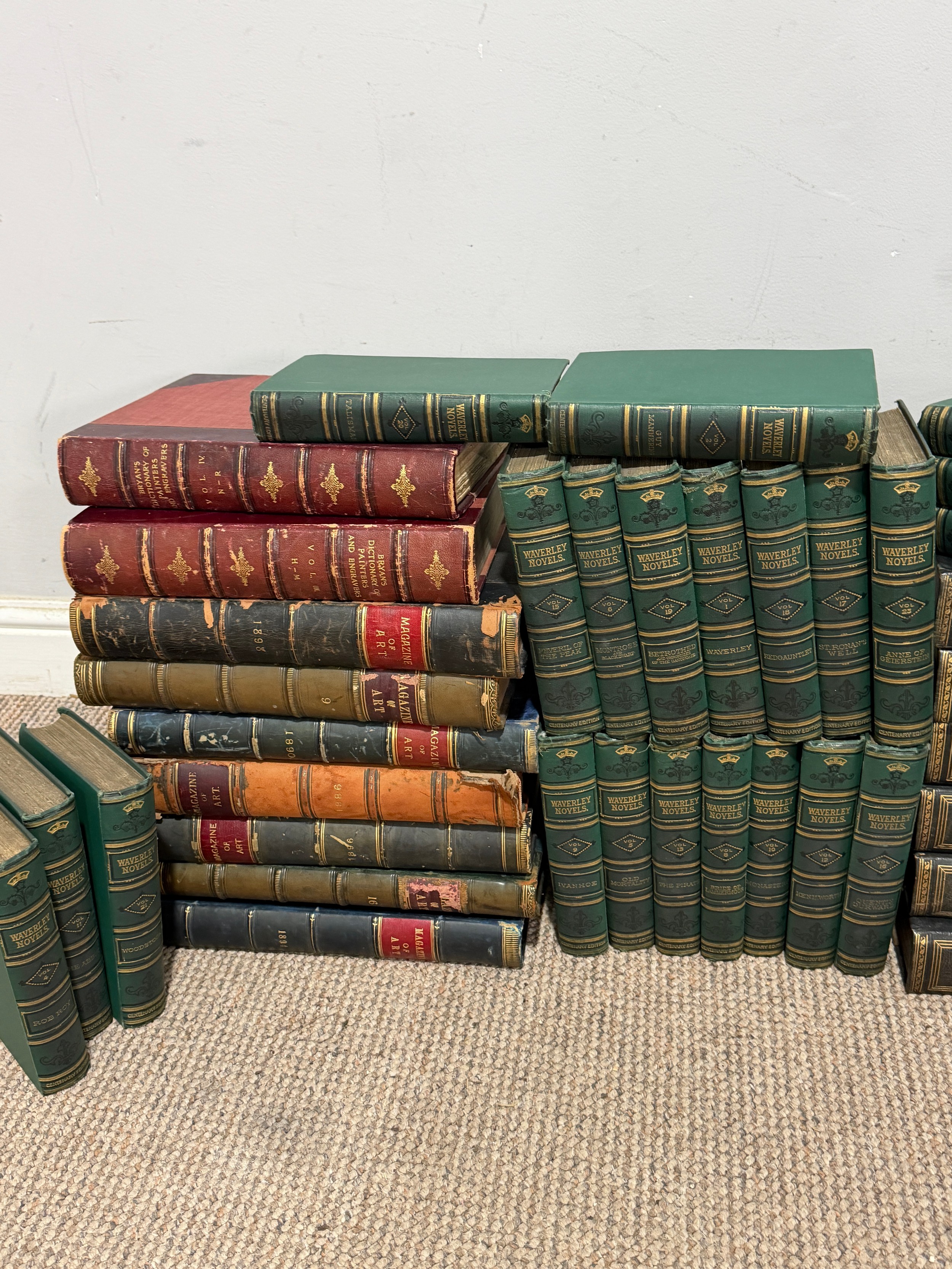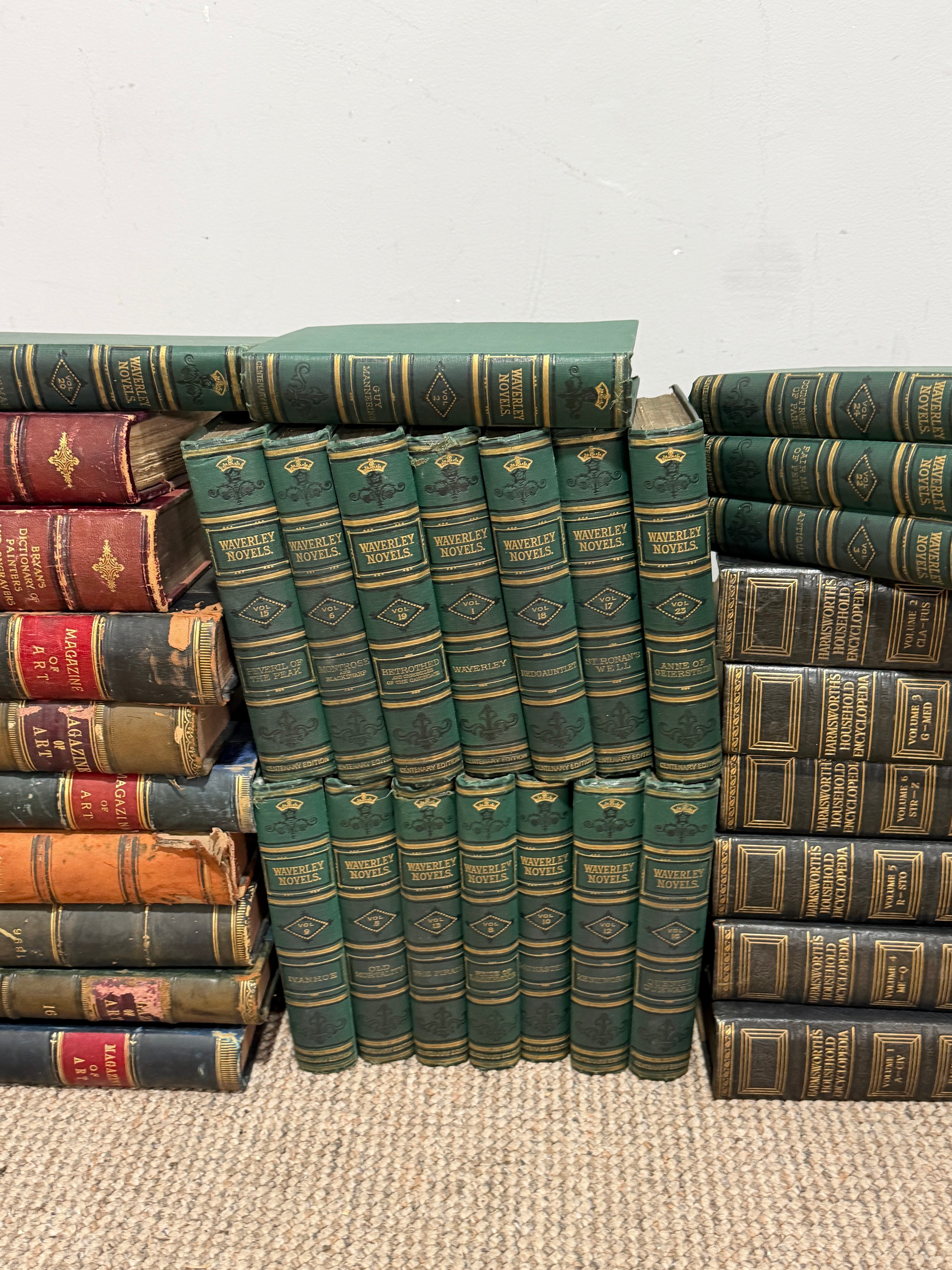 'Bryan's Dictionary of Painters and Engravers', new edition revised and enlarged under the supervision of George C Williamson, five vols, pub. G Bell & Son, London 1918-19, together with nine late 19thC bound 'Magazine of Art', a complete set of 25 Waverley Novels, Centenary Edition, A & C Black, 1871, publisher's green cloth and Harmsworth's Household Encyclopedia, in six volumes (a lot)