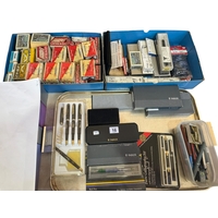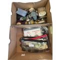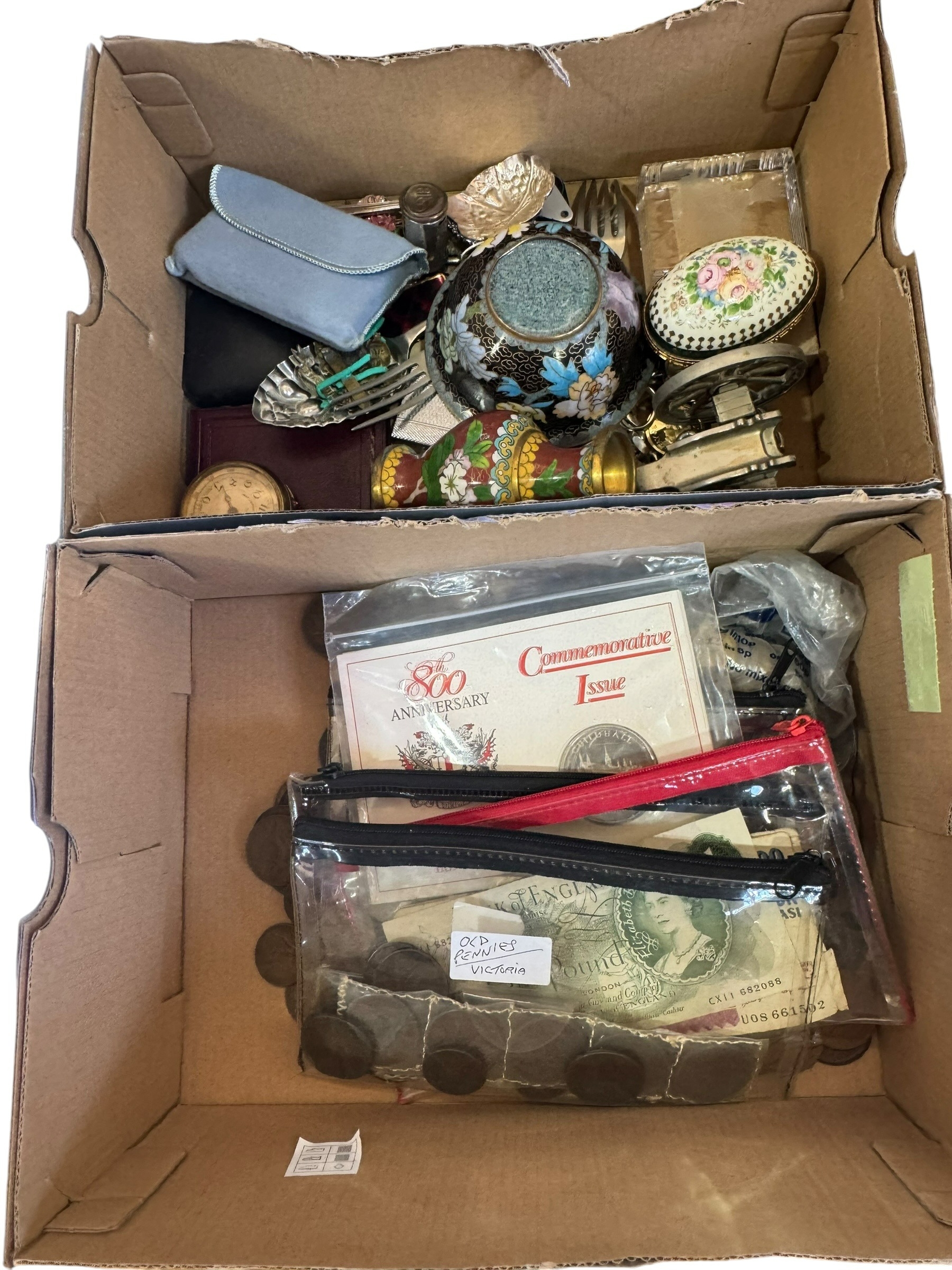 Two boxes with coins and collectables.
