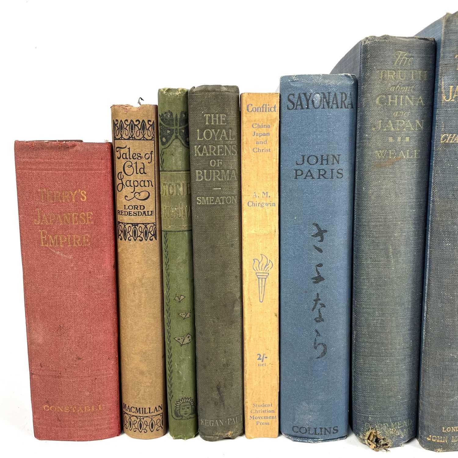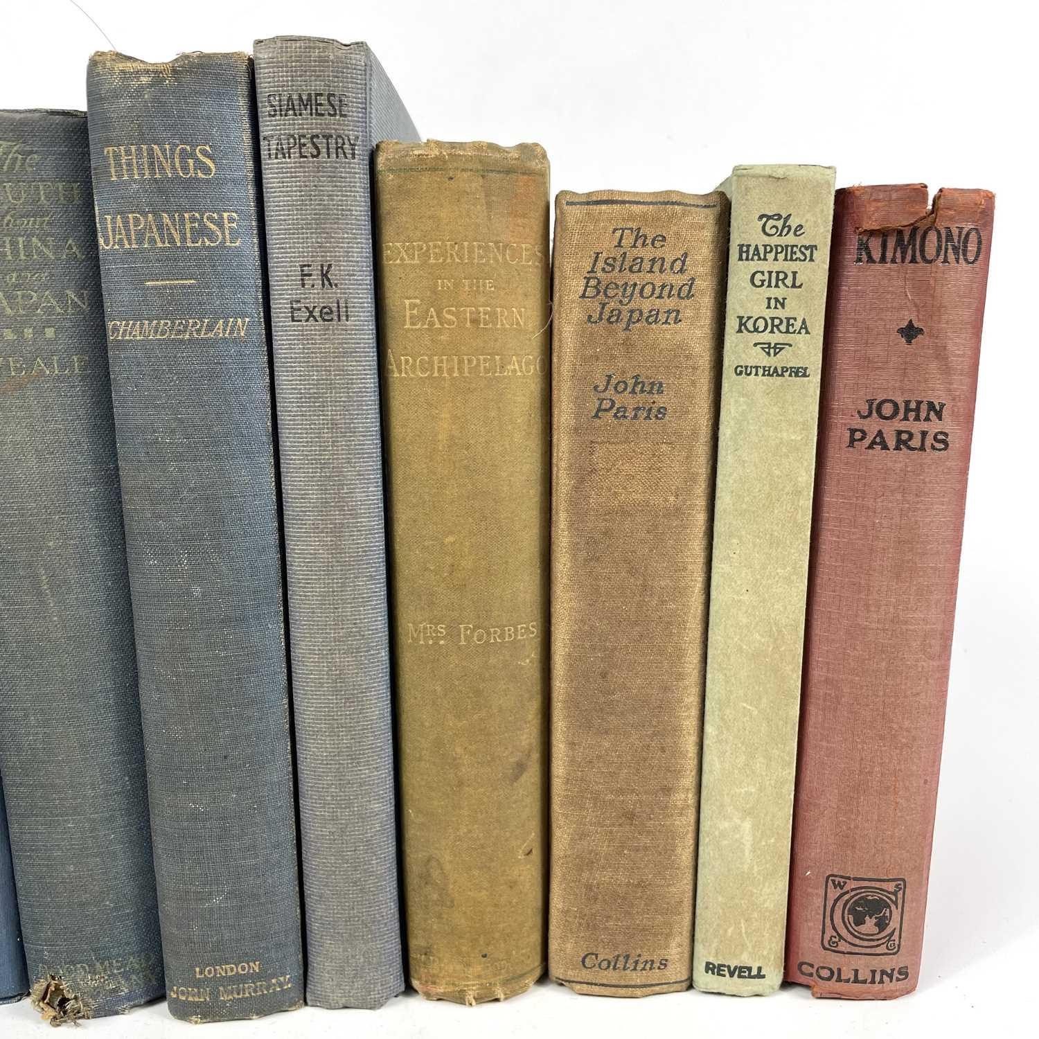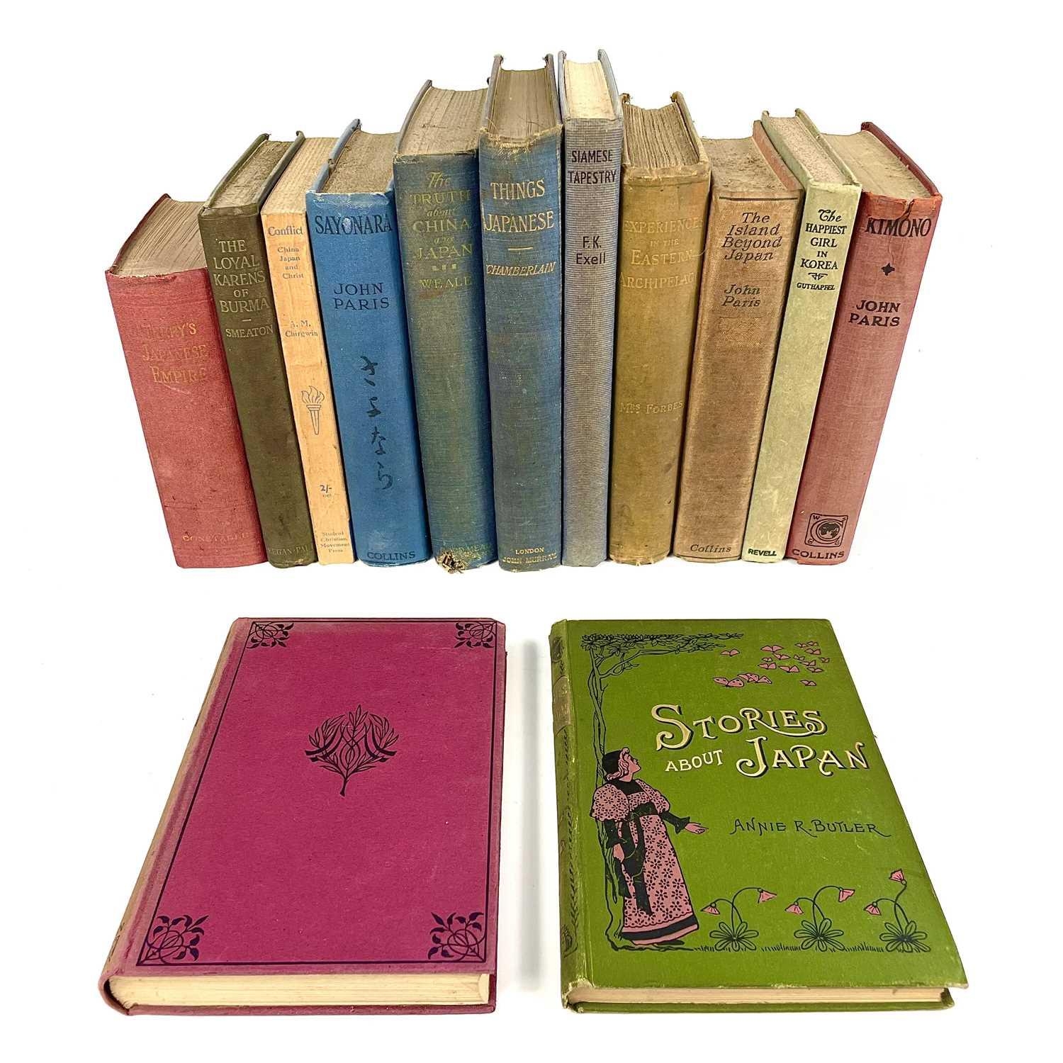 Twelve works about Japan and Asia. T. PHILIP TERRY. 'Terry's Japanese Empire Including Korea and Formosa....A Guidebook for Travellers,' original clith, sun bleached spine, fold out maps and plans, Constable & Company, London, 1914; ANNIE R. BUTLER. 'Stories About Japan,' original pictorial cloth, frontis engraving, plates, The Religious Tract Company, London, n.d; DONALD MacKENZIE SMEATON. 'The Loyal Karens of Burma,' second edition, original cloth, Kegan Paul, Trench, Trubner & Co, London, 1920; ANNA FORBES. 'Insulinde: Experiences of a Naturalist's Wife in the Eastern Archipelago,' stained original cloth, William Blackwood and Sons, Edinburgh, 1887; With nine other works about Japan and Korea. (12)