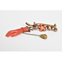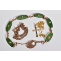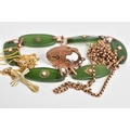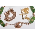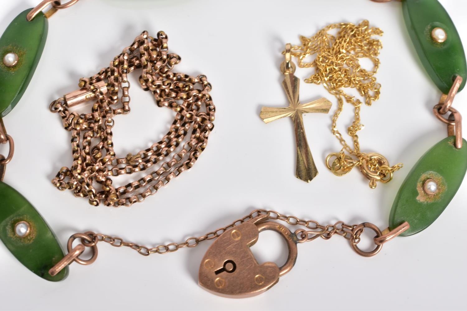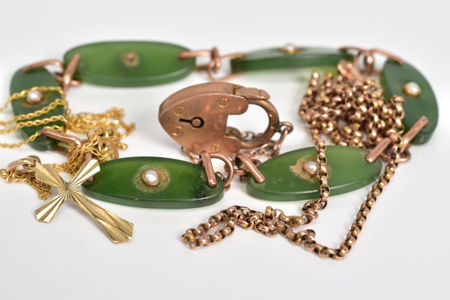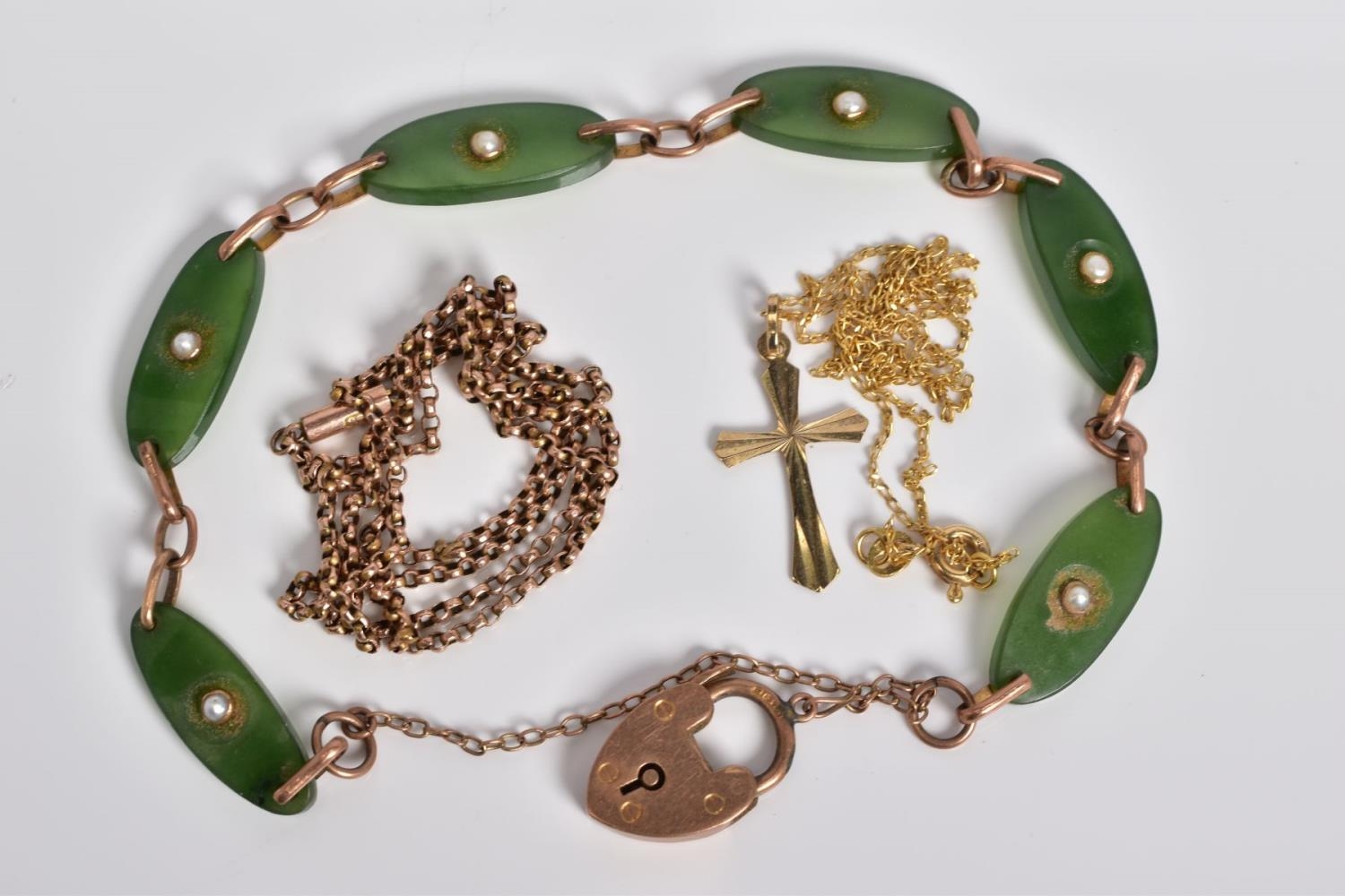 A SELECTION OF JEWELLERY, to include a rose gold bracelet with oval nephrite jade panels each set with a single split pearl, interspaced with a rose gold link, to the heart clasp and safety chain, with a 9ct hallmark for Birmingham, length 180mm, approximate weight 10.2 grams, also included a fine belcher chain, with push pin clasp, stamped 9ct, length 450mm and a fine curb link chain with cross pendant stamped 375, length 390mm, approximate weight of both 3.3 grams
