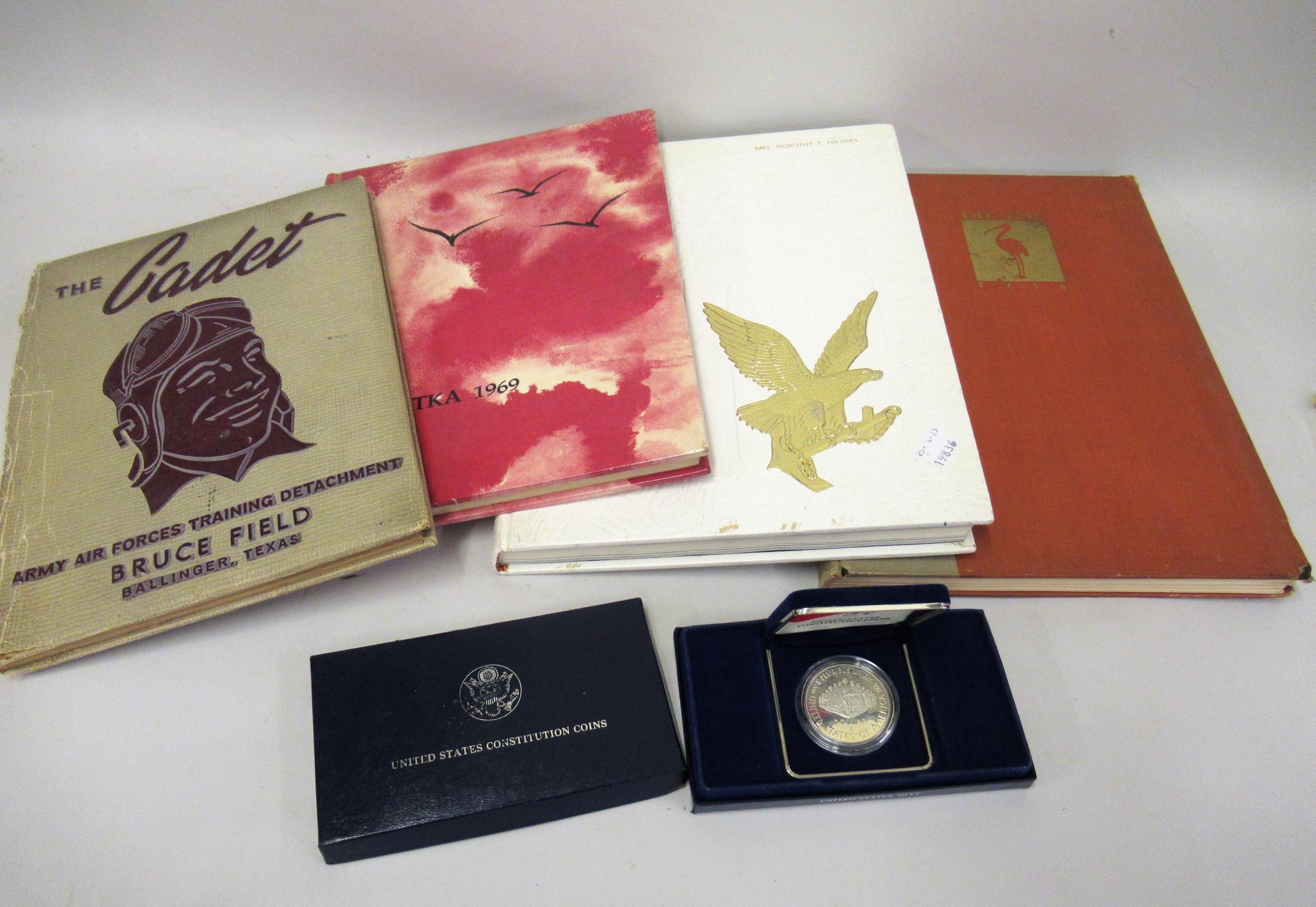 Cased United State Constitutional coin, one dollar 1987, together with four various American college albums