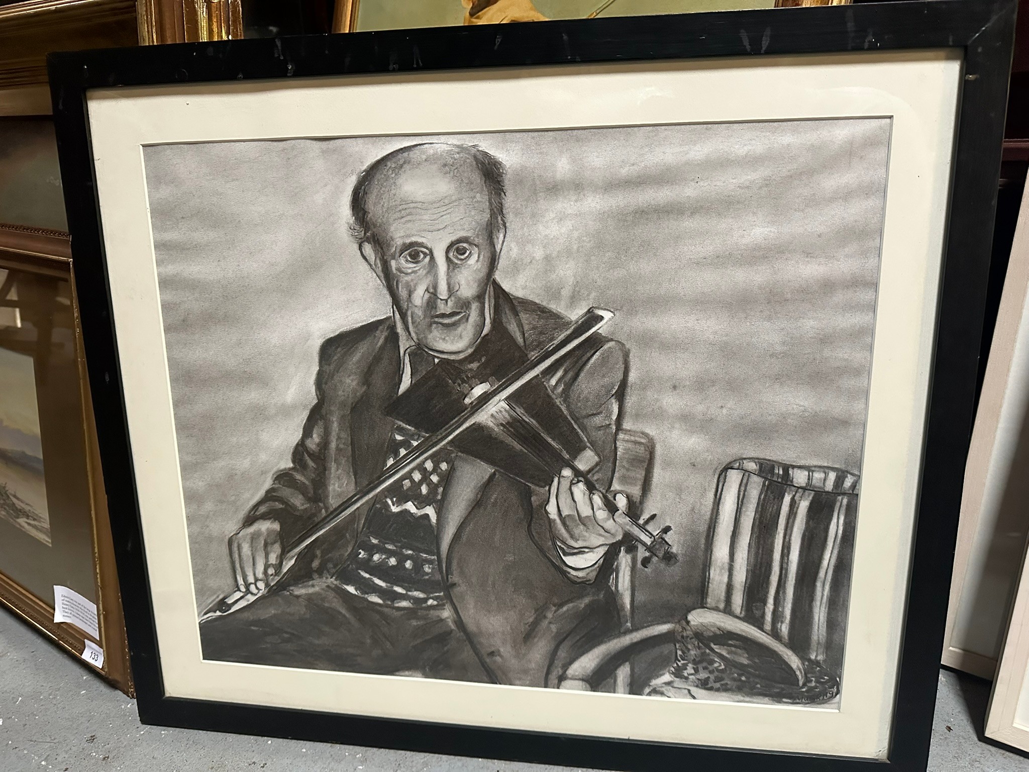 Charity Lot- Charcoal and Pastel Drowing of a Musician. Signed Murrily of Murrhy, Frame 75cm x 64cm, Image 60cm x 49cm
