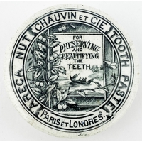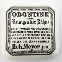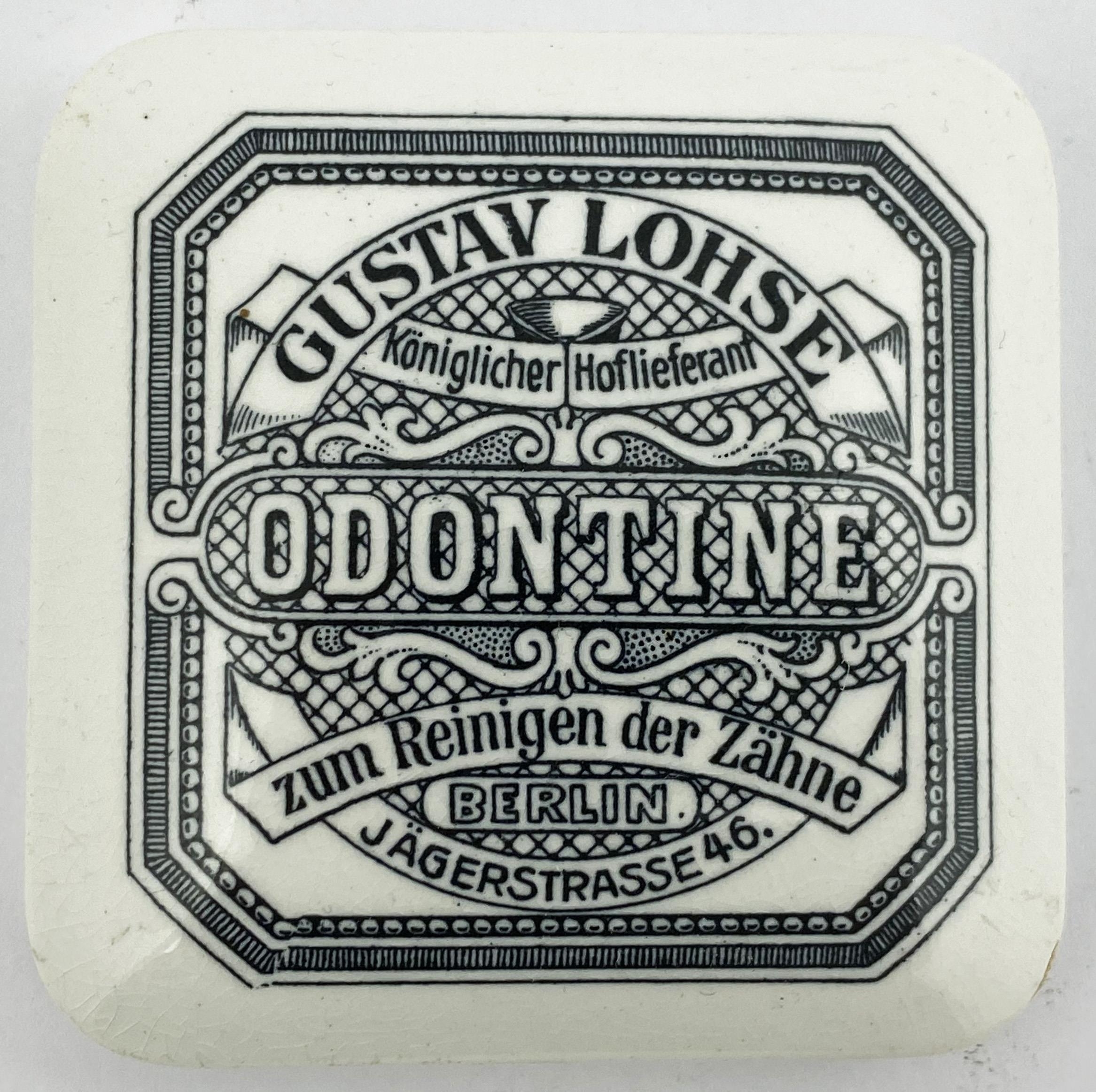 BERLIN POT LID. 2.5ins diam. Square with pronounced rounded corners. Reinigen Der Zahne translates TO CLEAN THE TEETH. With outer border. Very minor damage. (