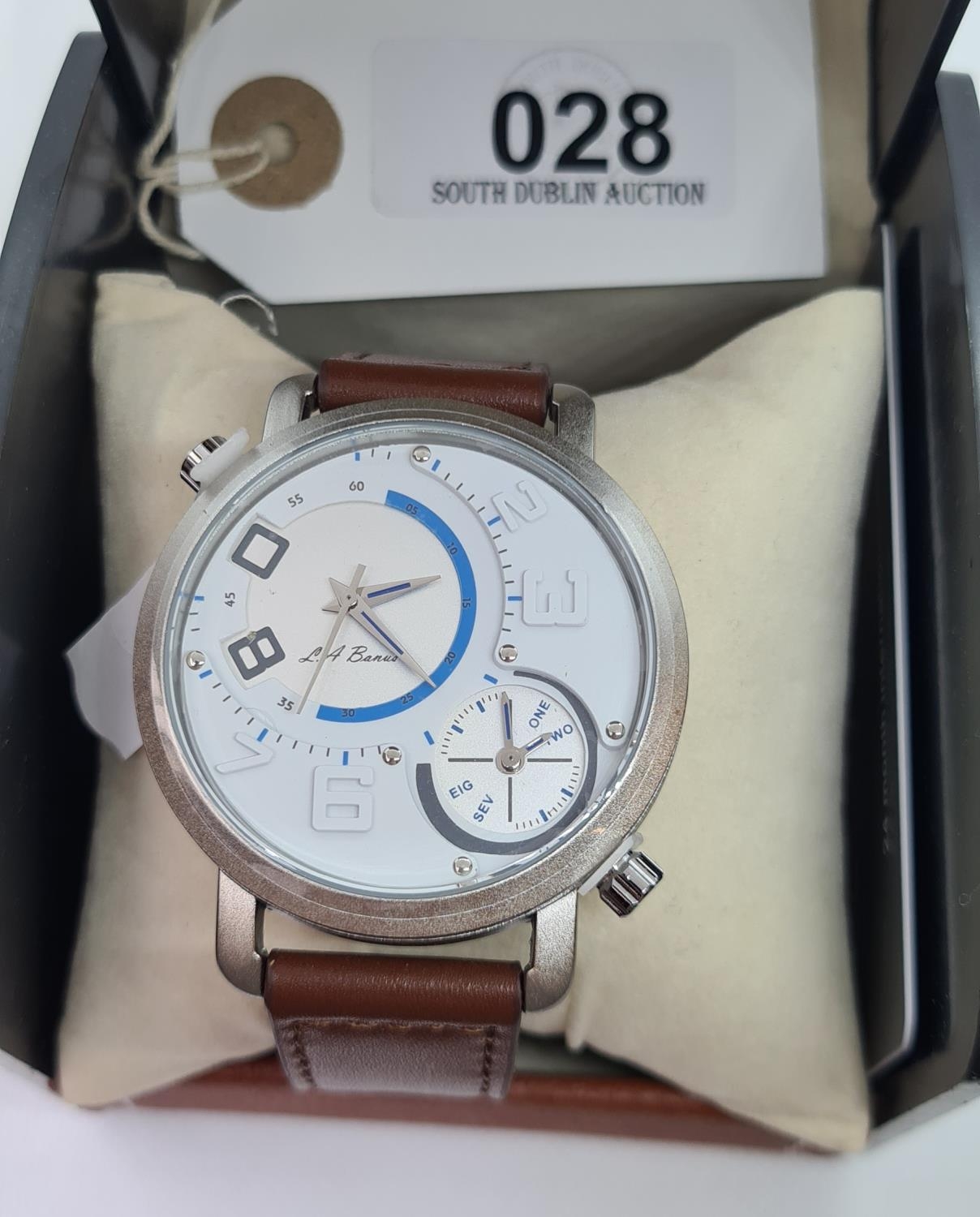 New LA Bonus watch in box with multiple chrono dials.