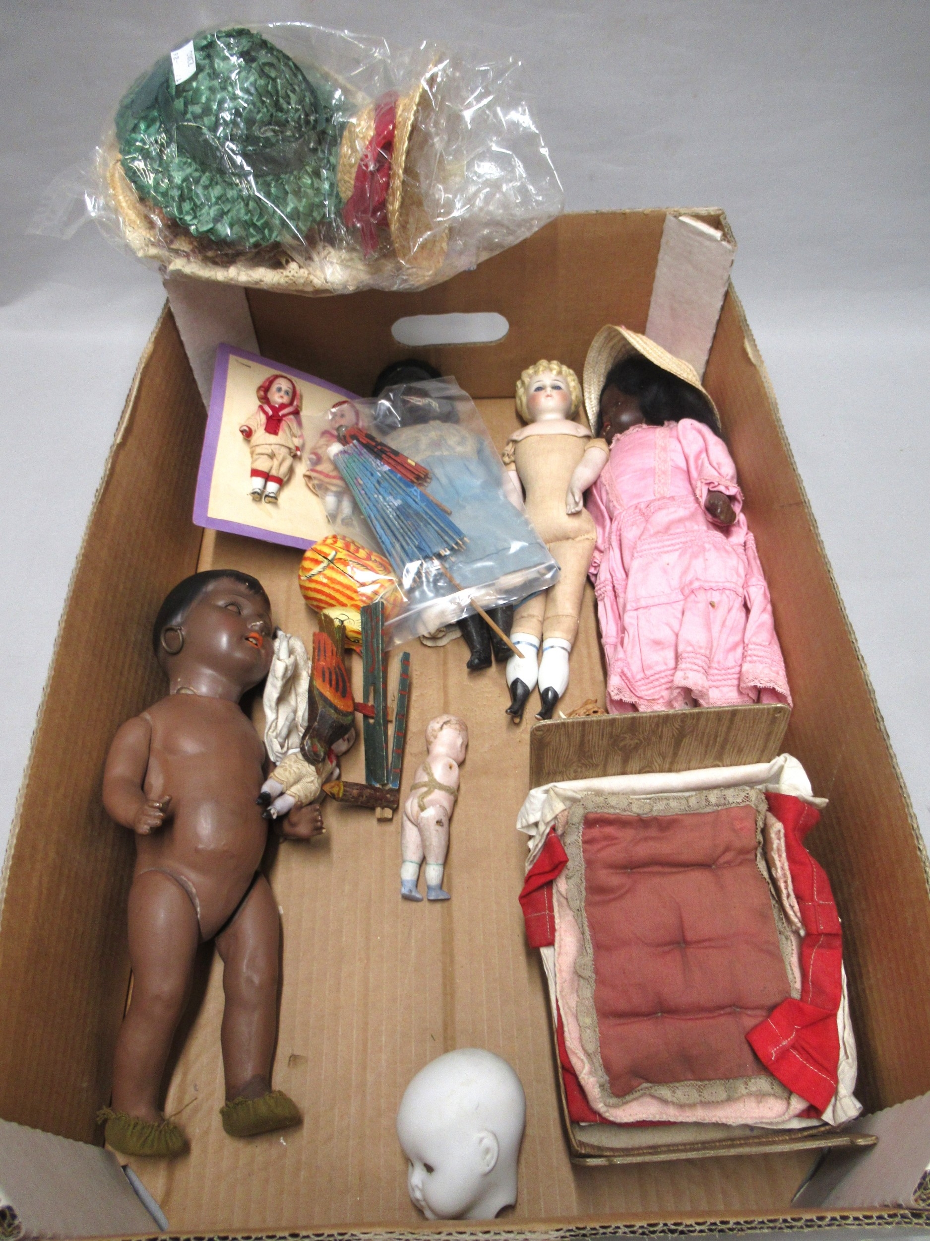 Box containing a collection of various dolls and clothes