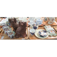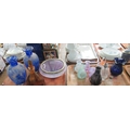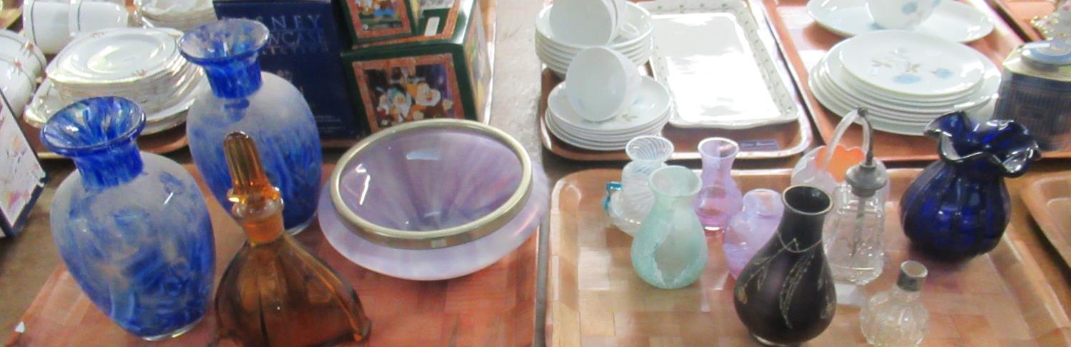 Two trays of assorted, largely glassware, to include: small Caithness style glass vases, cut glass perfume atomisers, large blue marbled glass vases, purple and white pearlescent glass bowl with a white metal rim, smoky quartz coloured glass bottle with stopper etc. (2)