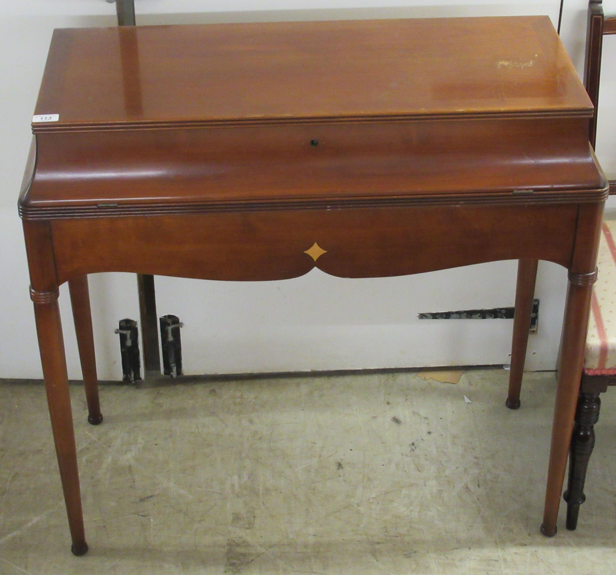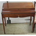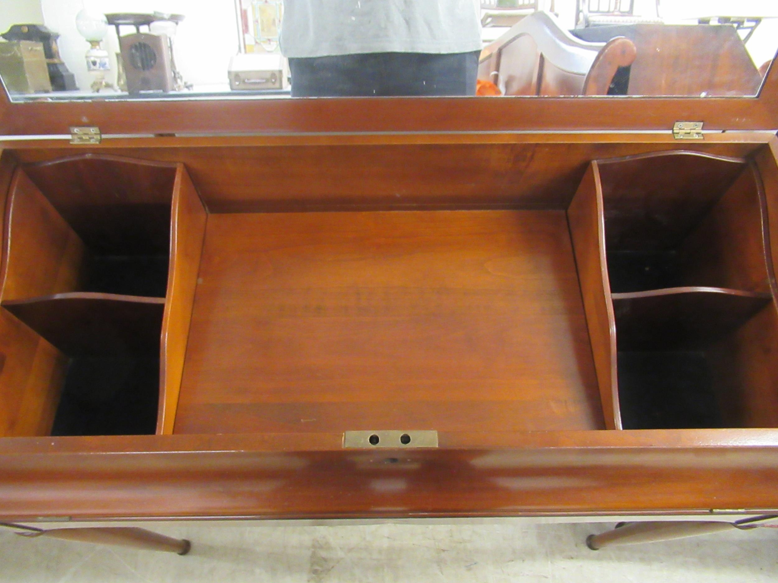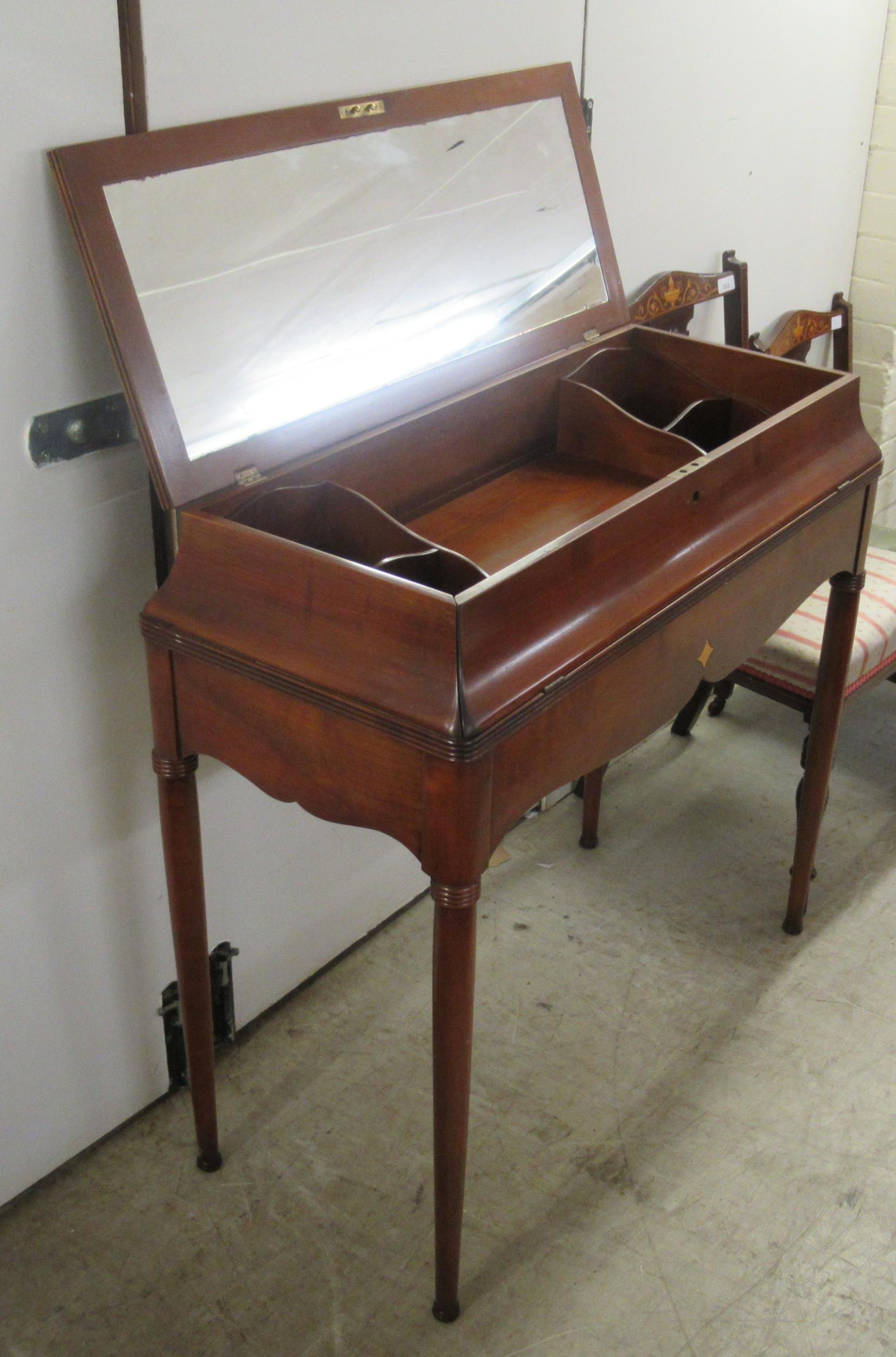 A modern cherrywood dressing chest/desk with a hinged mirrored lid and fall front, enclosing open compartments, raised on turned, tapered legs 35"h 36"w