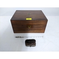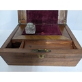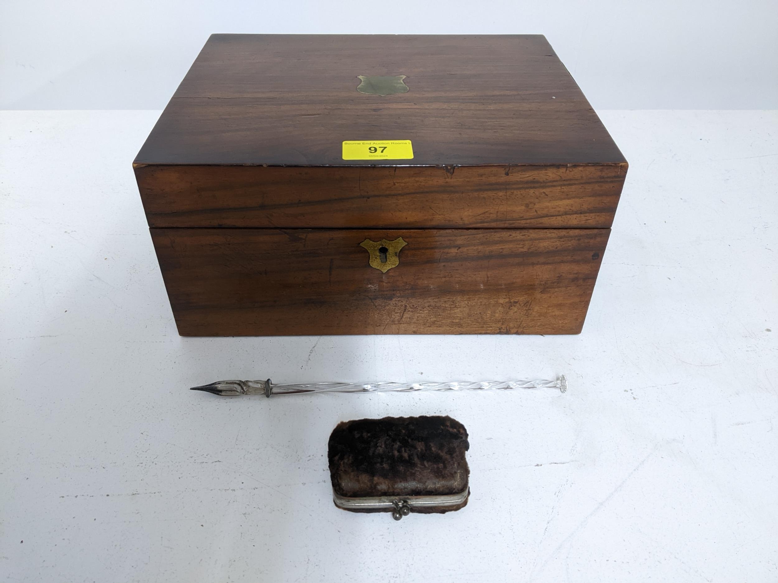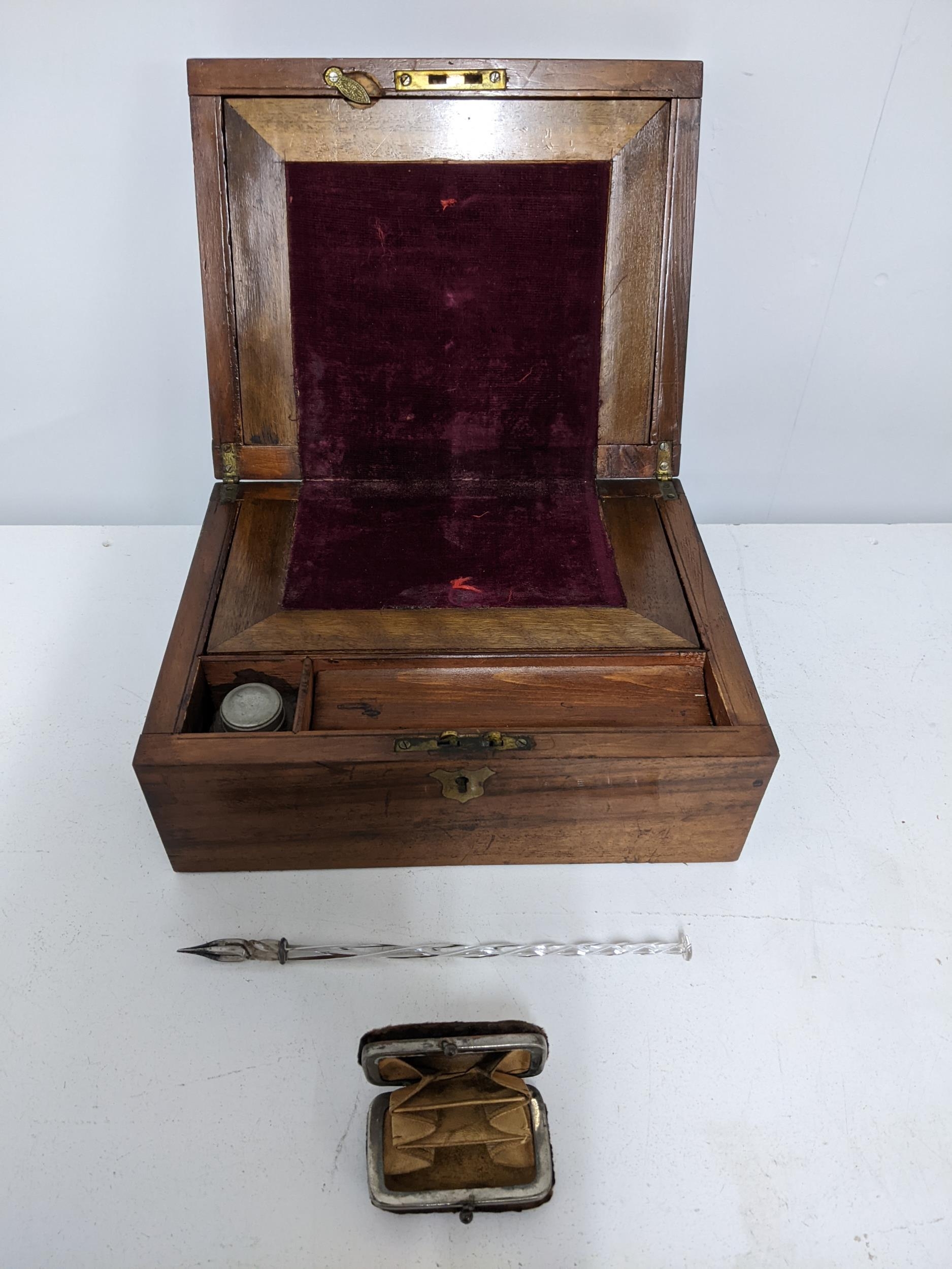 A mid Victorian writing slope with single inkwell in a fitted interior 13cm x 26cm x 21cm, glass dip pen and a fabric and leather purse Location:R2.3