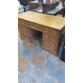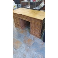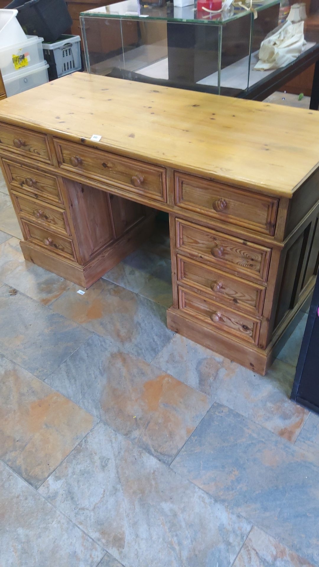 Antique pine wood desk featuring multiple drawers with turned wooden knobs.
