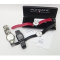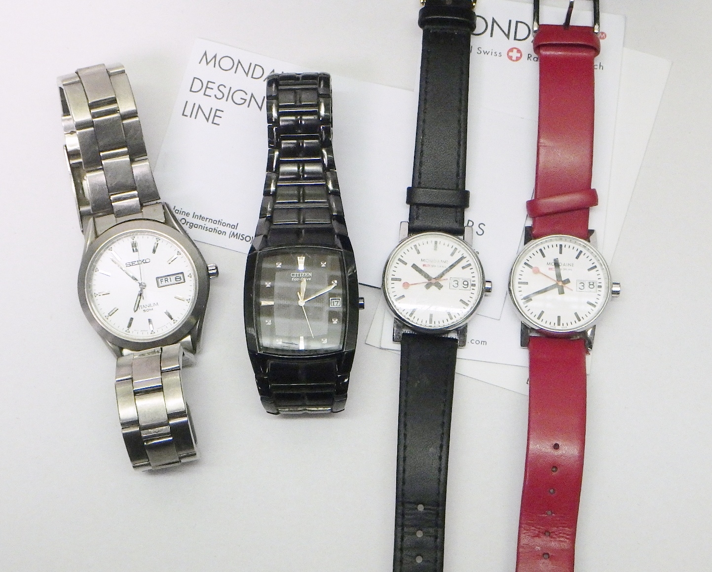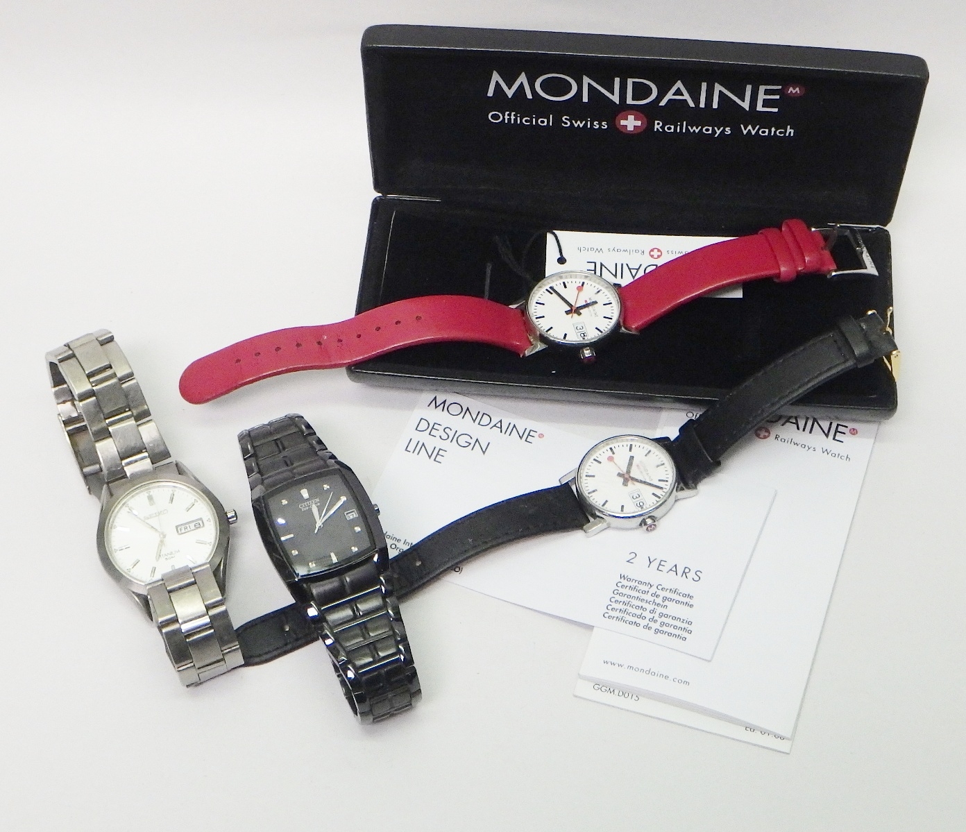 Two Mondaine Swiss Railways Watches comprising quartz analogue movements in steel cases, each 29mm across case, one boxed; a Seiko Quartz Titanium cased bracelet watch, 37mm across; a Citizen Eco-Drive bracelet watch, 31mm across. (4)