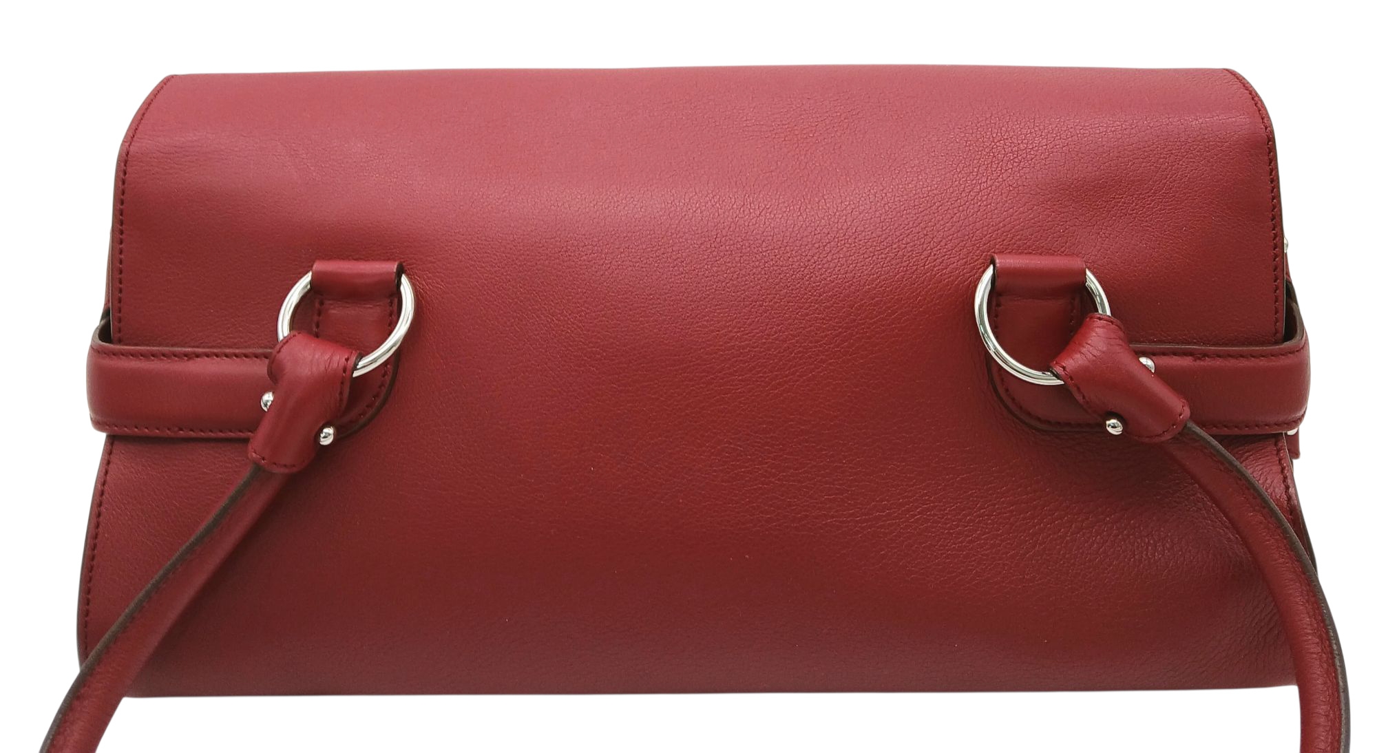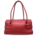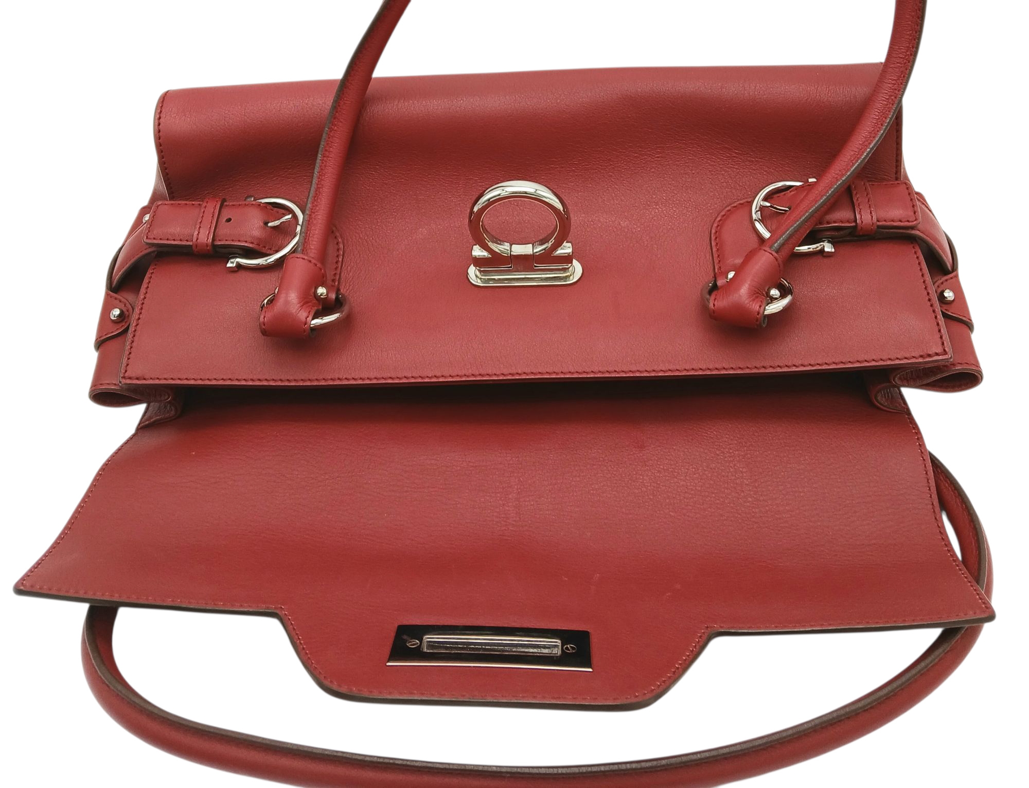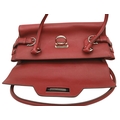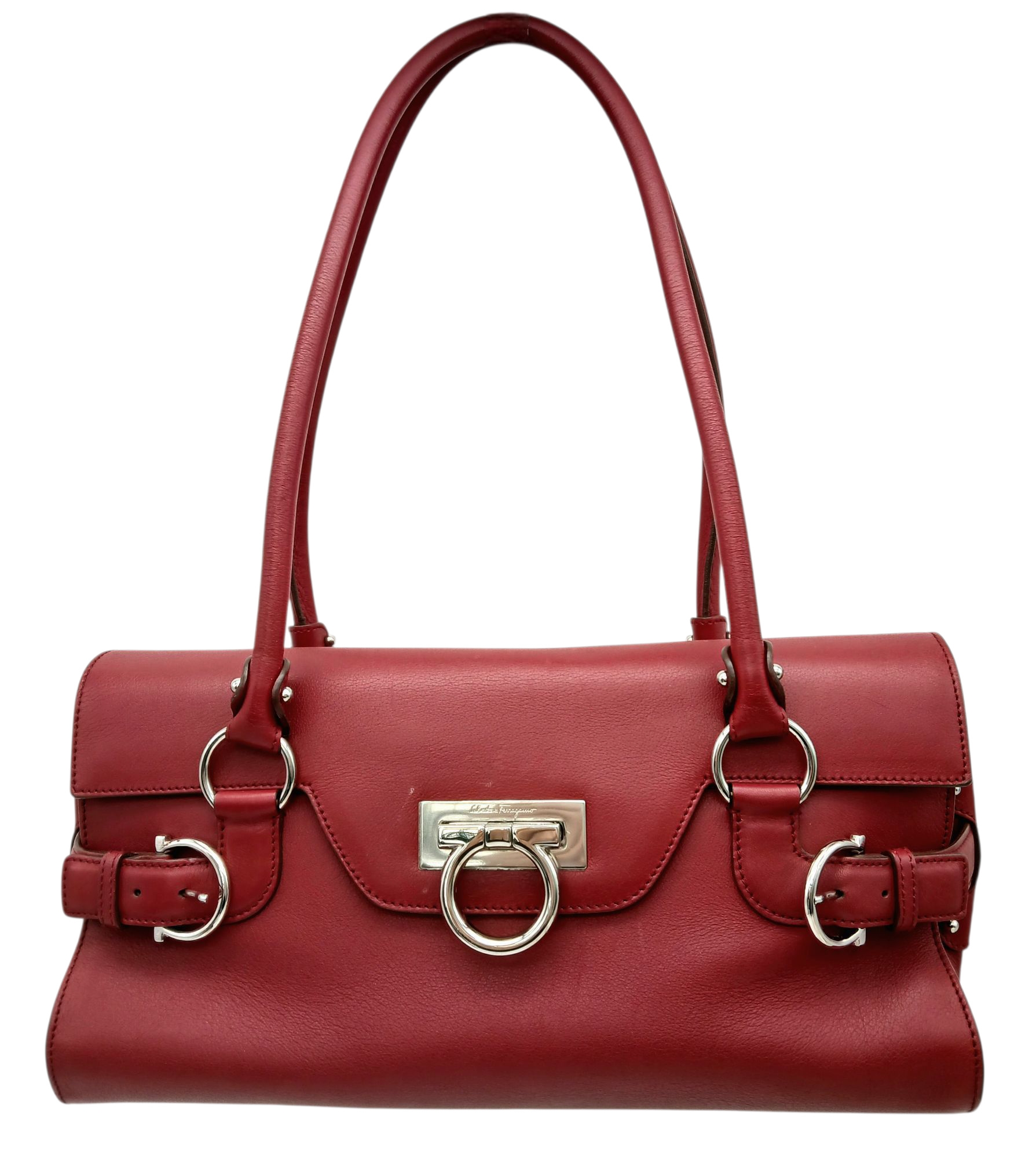 A Salvatore Ferragamo Red Leather Handbag. Red leather exterior with silver-toned hardware, dual top handles and Gancini turn-lock closure. Red leather interior with a zipped inner pocket. Some signs of wear exterior but in good condition overall. Approx 32cm length x 15cm height x 13cm depth. Comes with a dust cover. Please see photos or request a condition report. Ref: STK022935