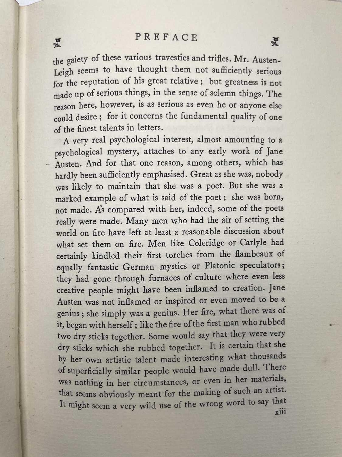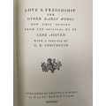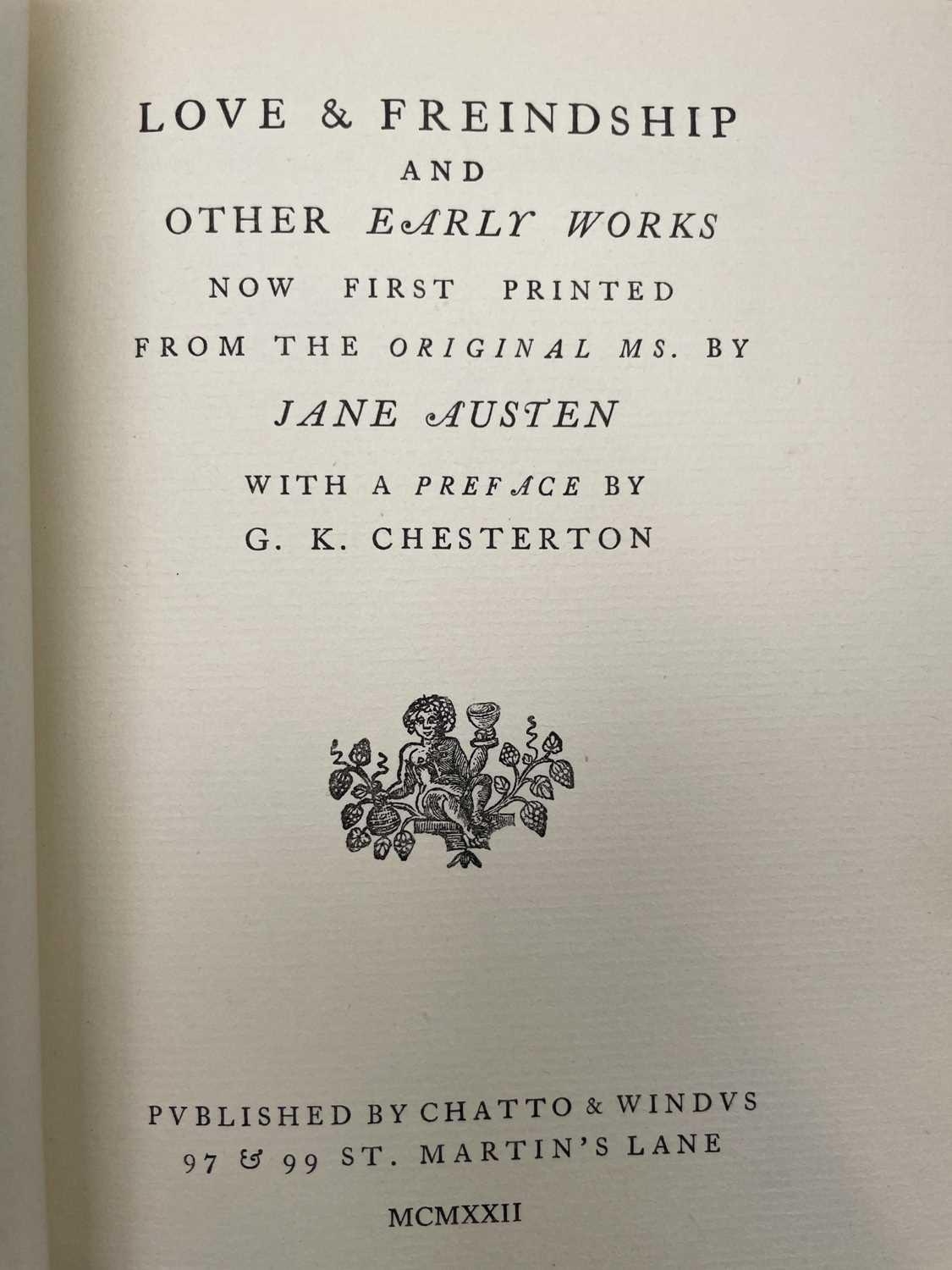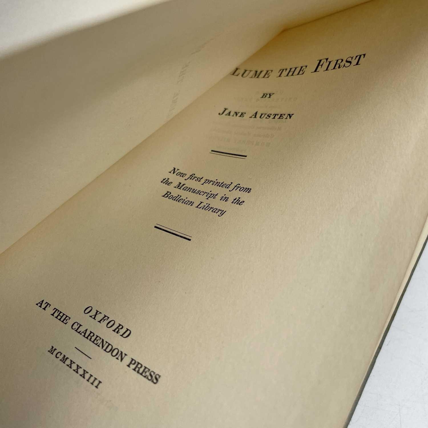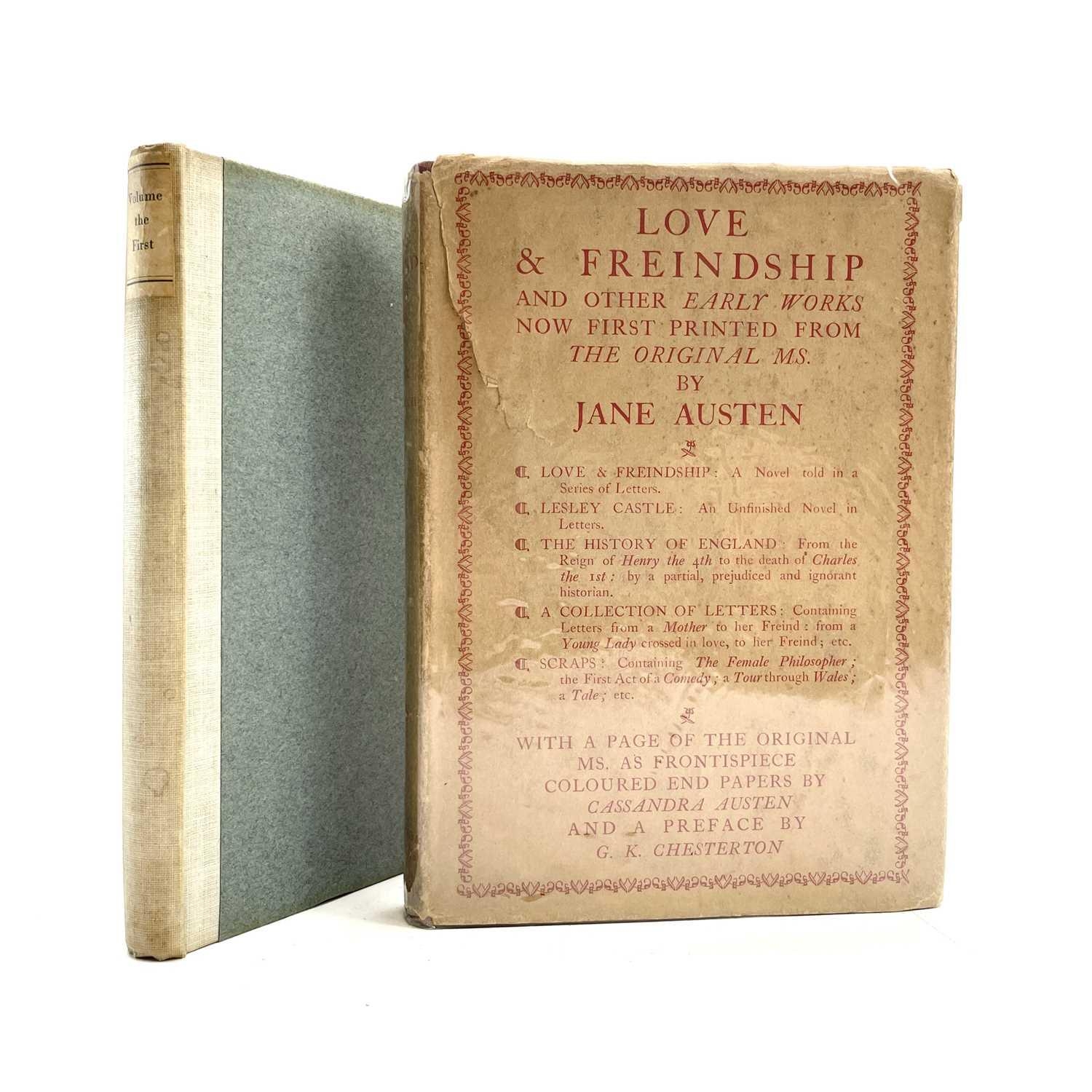 JANE AUSTIN. 'Love and Friendship and Other Early Works Now First Printed from the Original Ms. by Jane Austin,' unclipped dj, original cloth, Chatto and Windus, London, 1922; 'Volume the First,' unopened leaves, publishers boards, Clarendon Press, Oxford, 1933. (2)