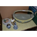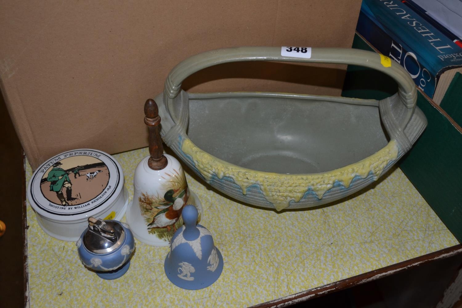 POTTERY BASKET, PATUM PEPERIUM POT AND LID, WEDGWOOD TABLE LIGHTER AND BELL AND NORWICH BELL