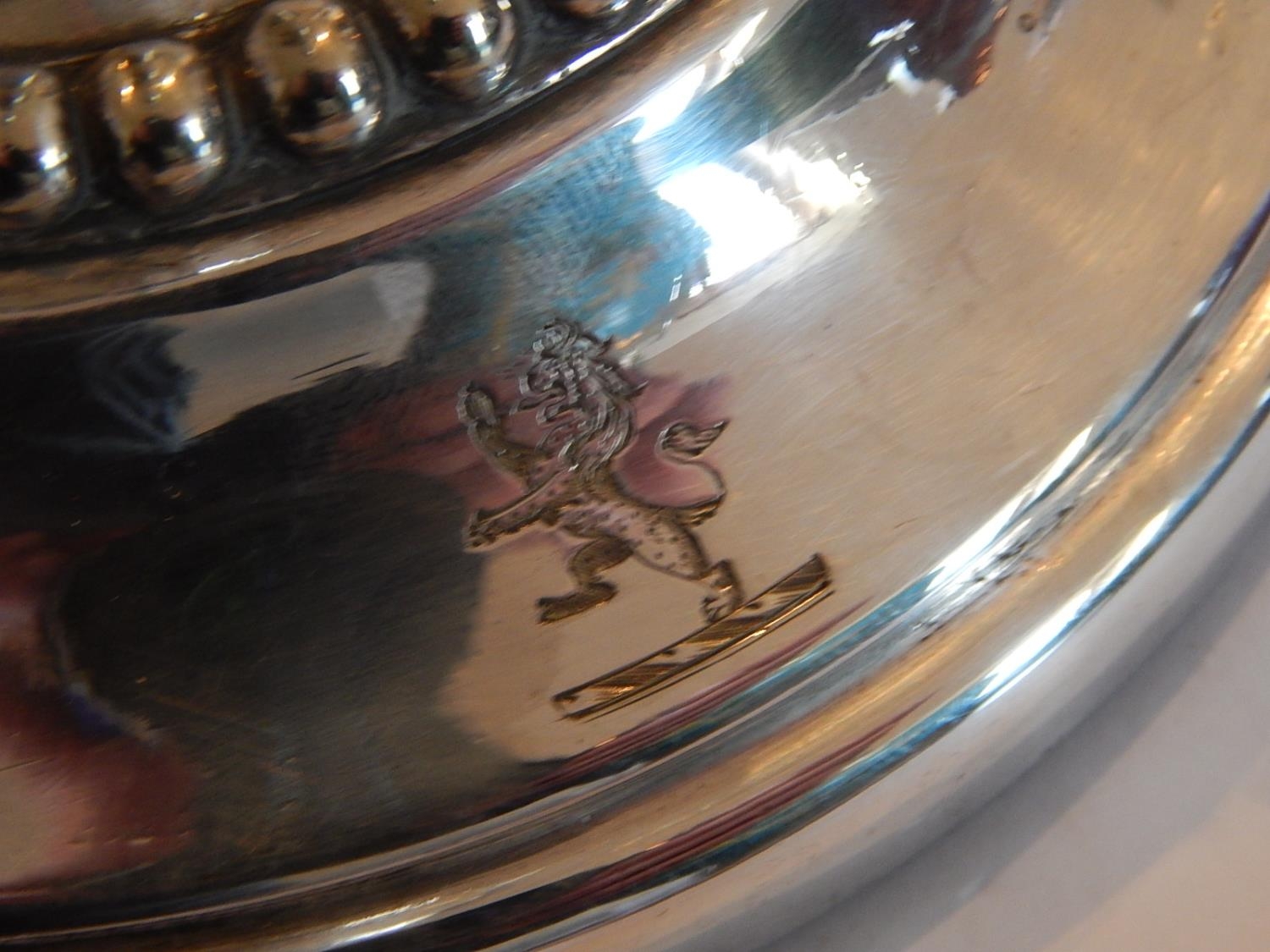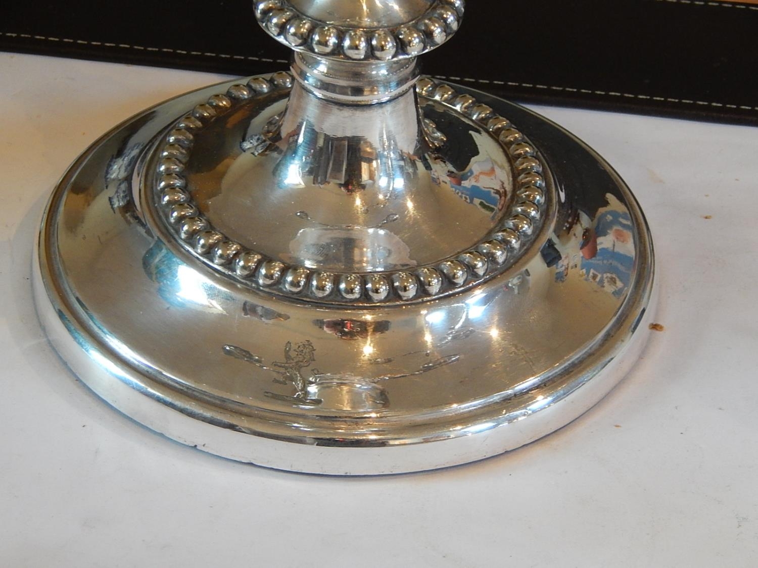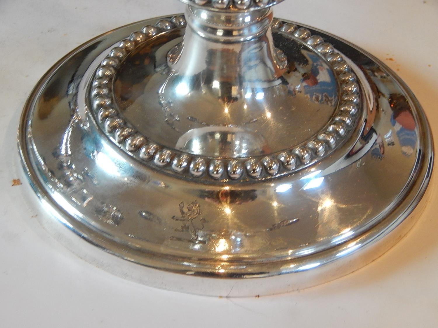 A Superb Pair of Sterling Silver Three Branch Candelabra, weighted, not Hallmarked but tested as Sterling Silver. Crested with Rampant Lion. Height 58cm: Gross weight 8060g (259oz).