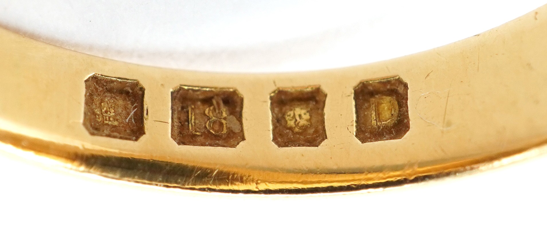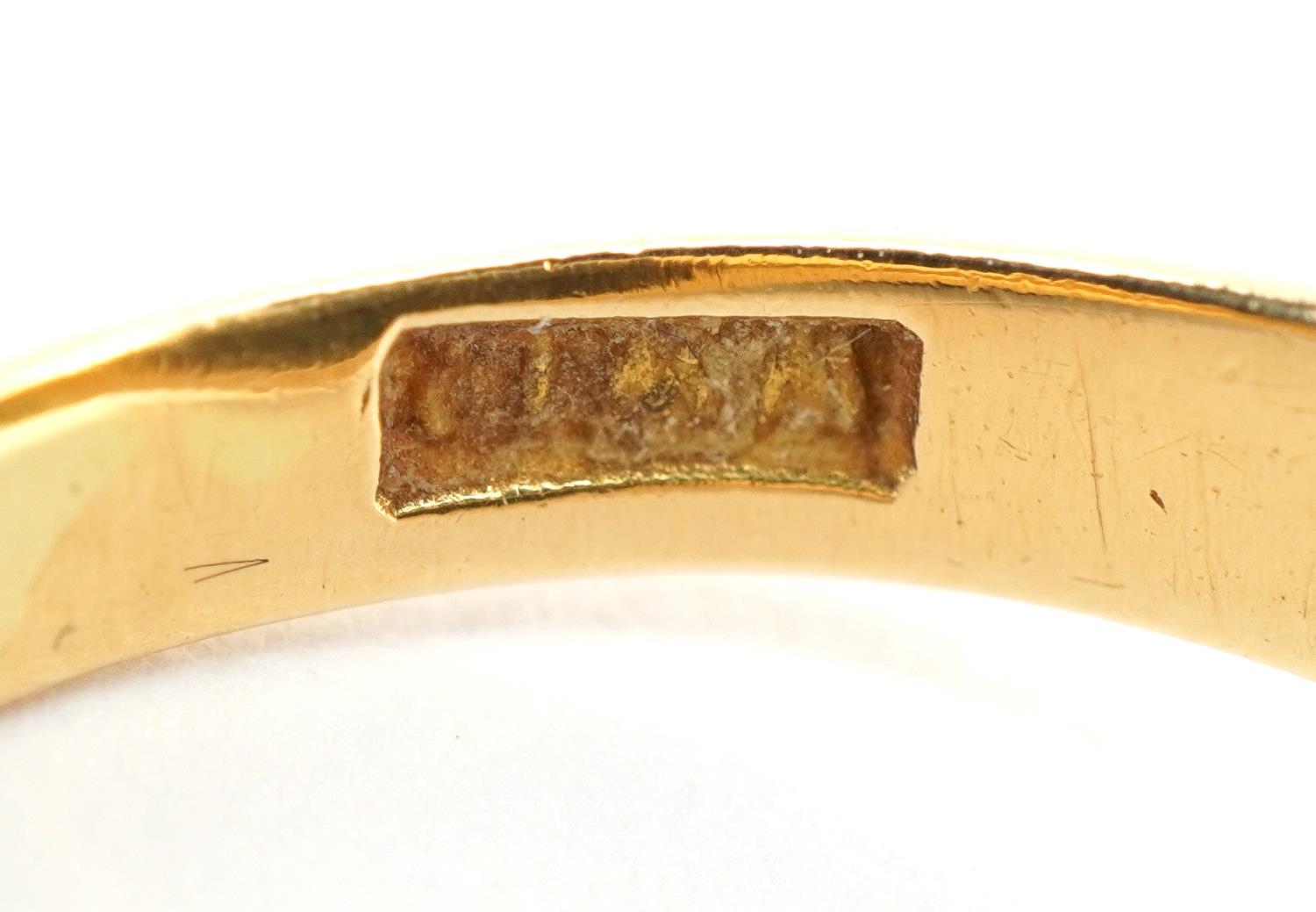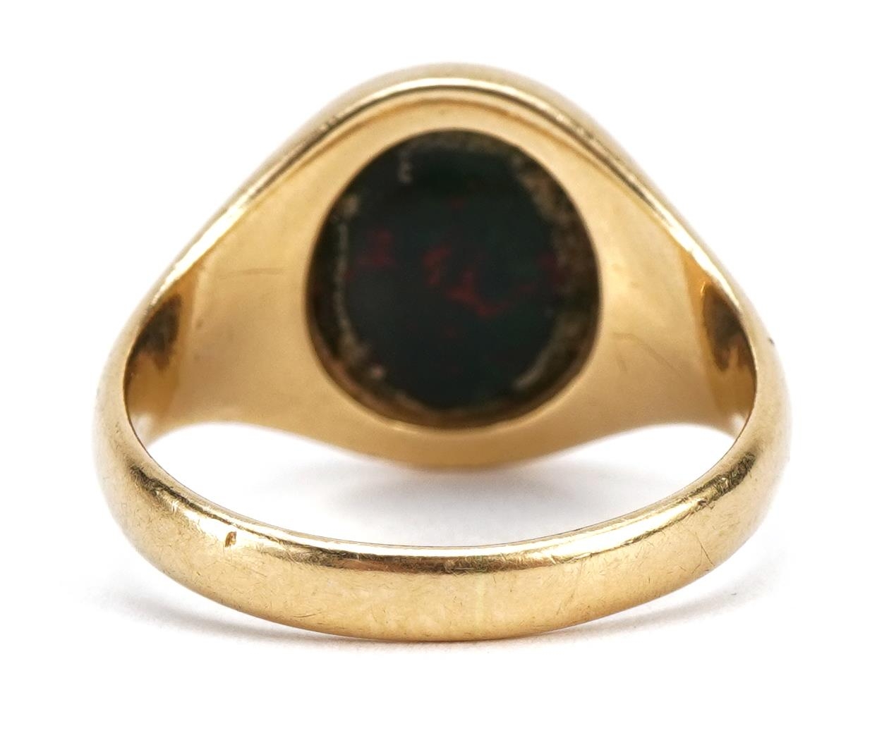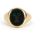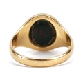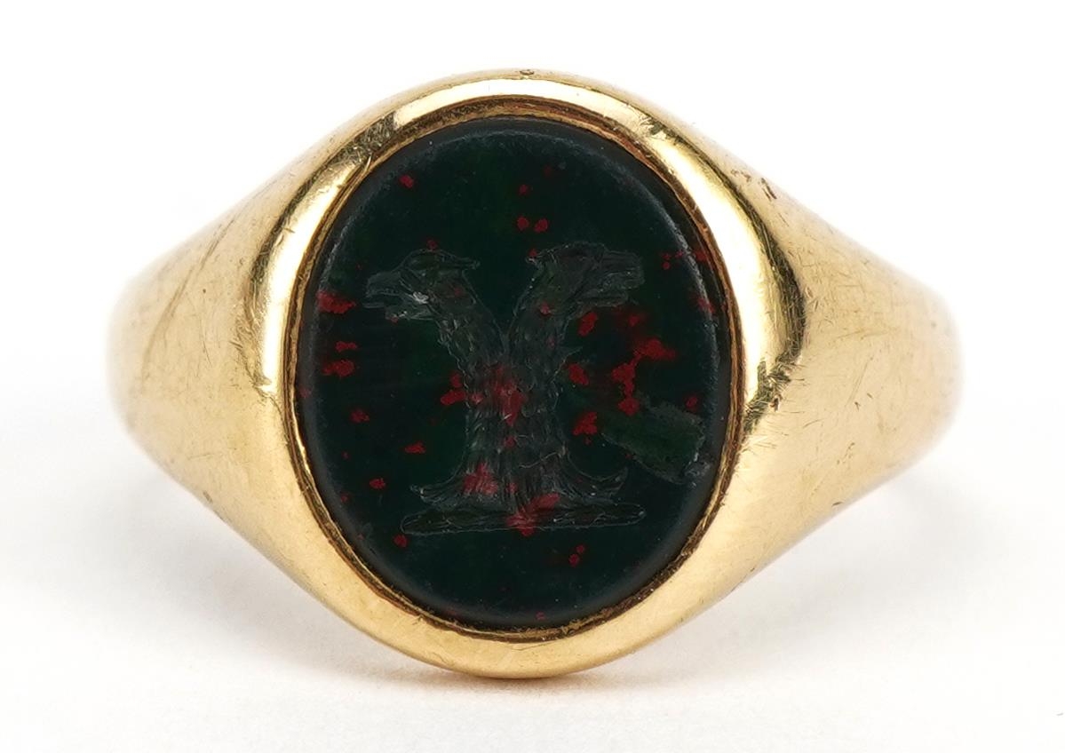 18ct gold bloodstone signet ring carved with a double headed eagle heraldic crest, size N/O, 6.6g