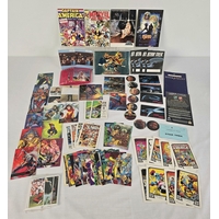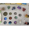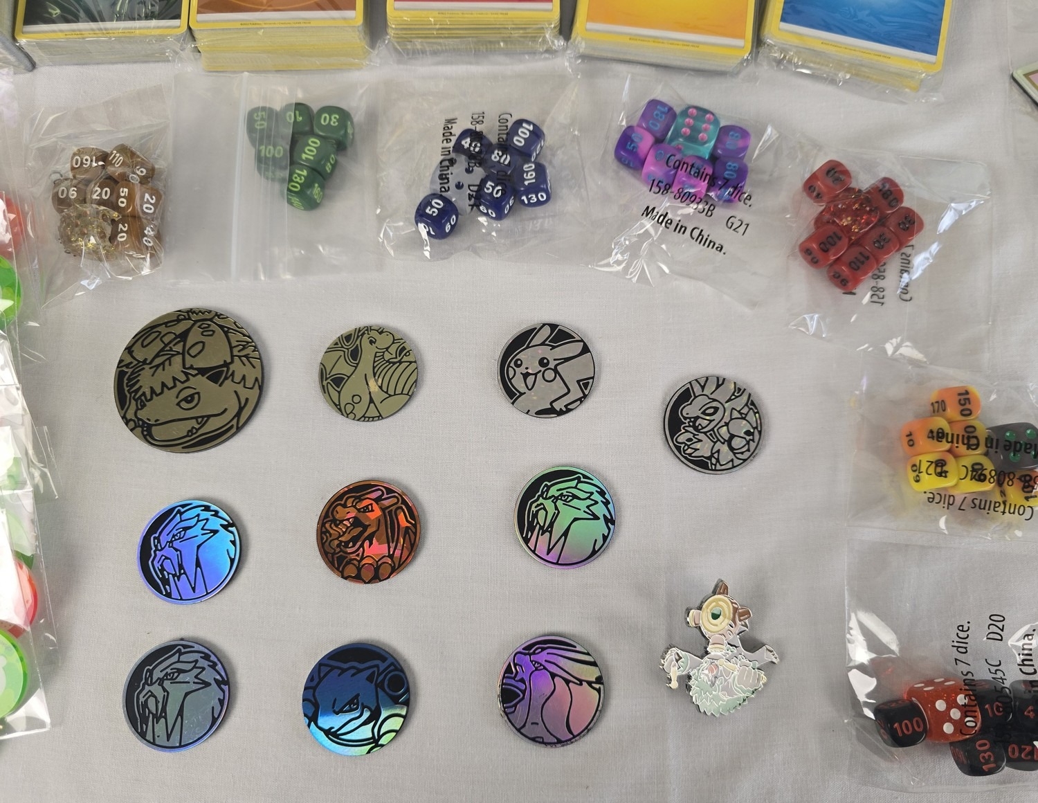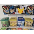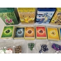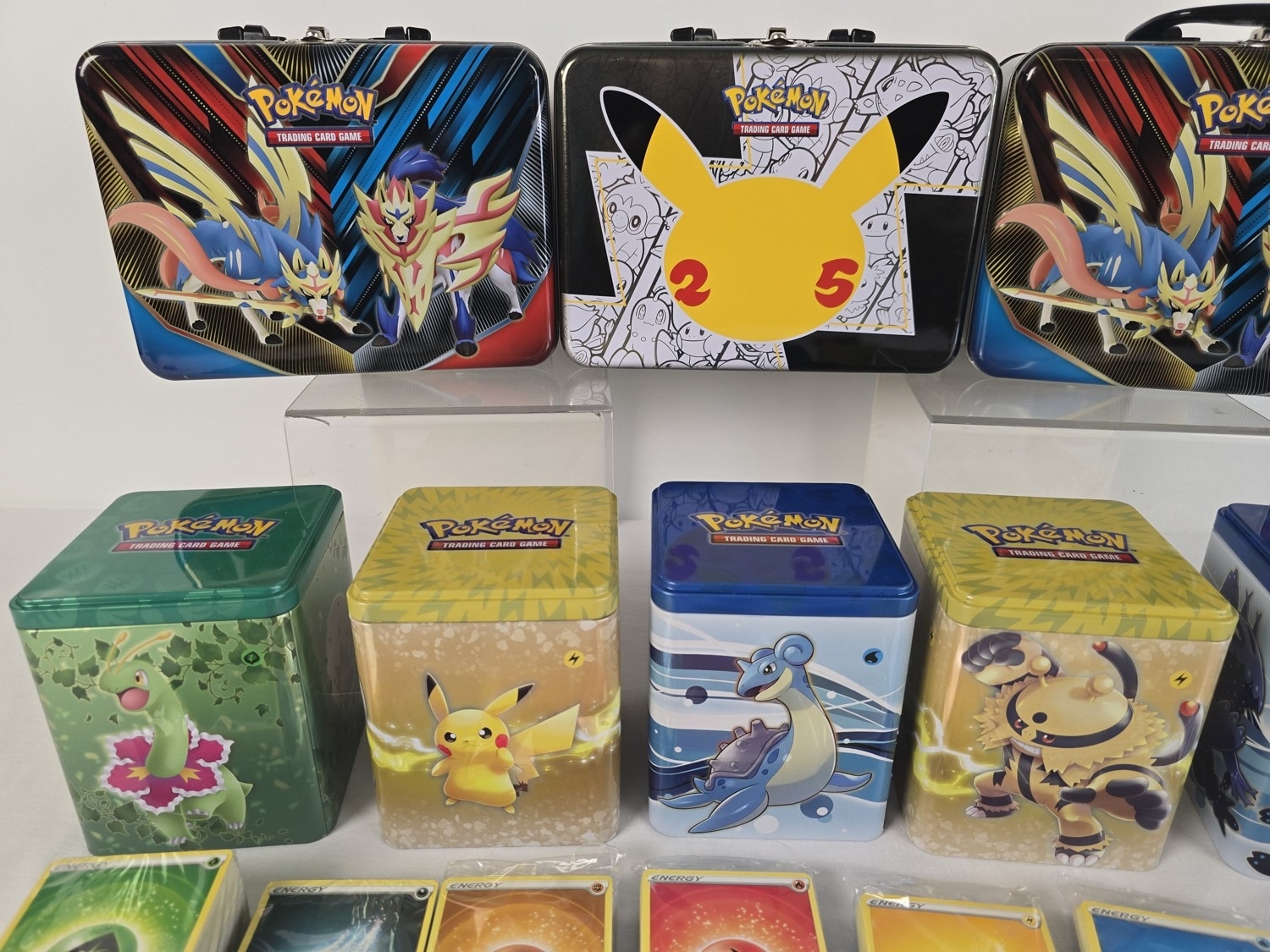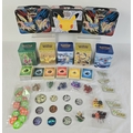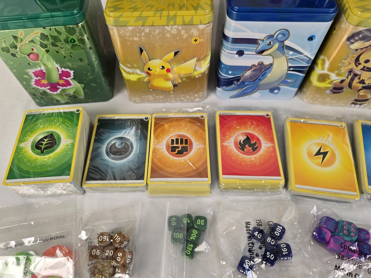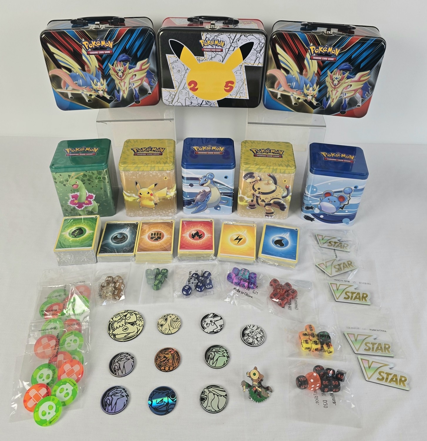 A collection of assorted Pokémon tins together with some sealed energy card packs, dice, tokens and enamelled pin badge.