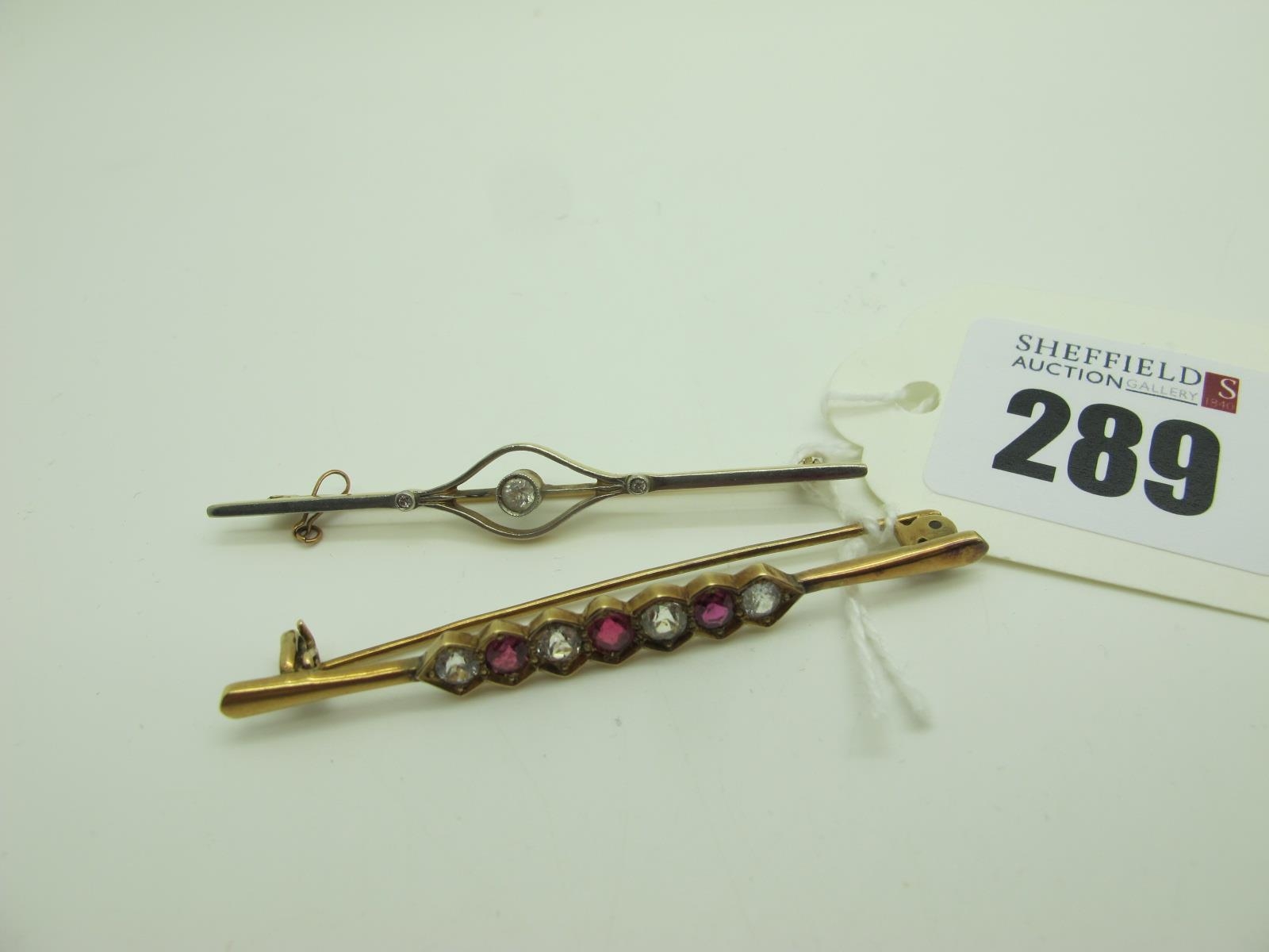 A Seven Stone Bar Brooch, alternately set; together with an Edwardian diamond set bar brooch. (2)