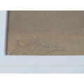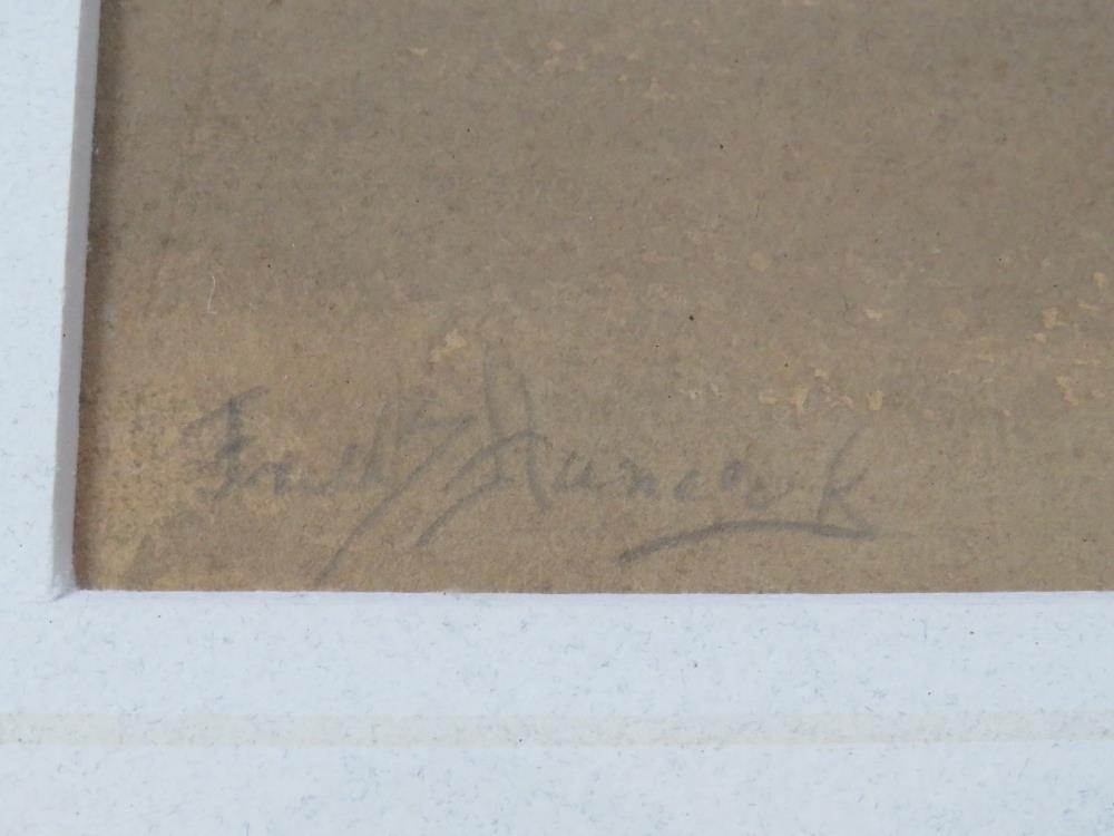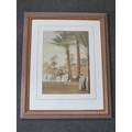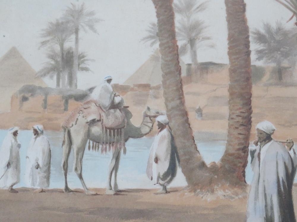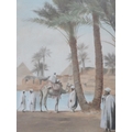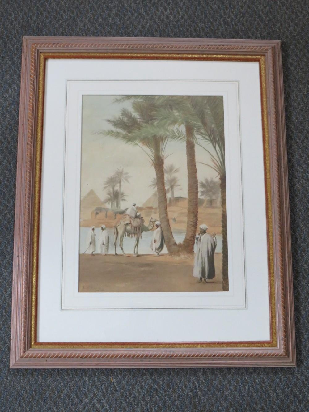 FREDERICK HANCOCK (XIX-XX). British school, 'Pyramids by The Nile', with camels and figures, see verso, signed lower left, watercolour, framed and glazed, 36 x 26 cm