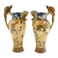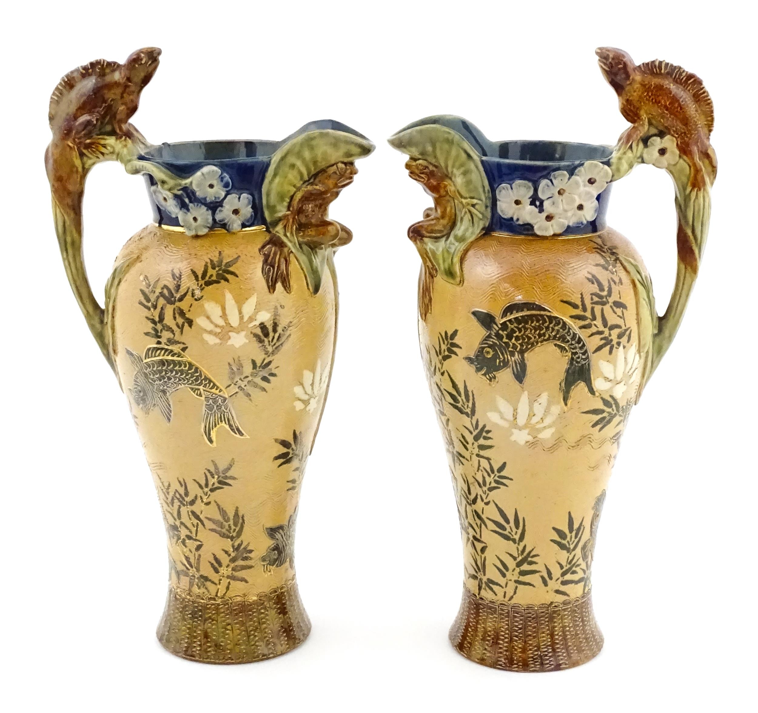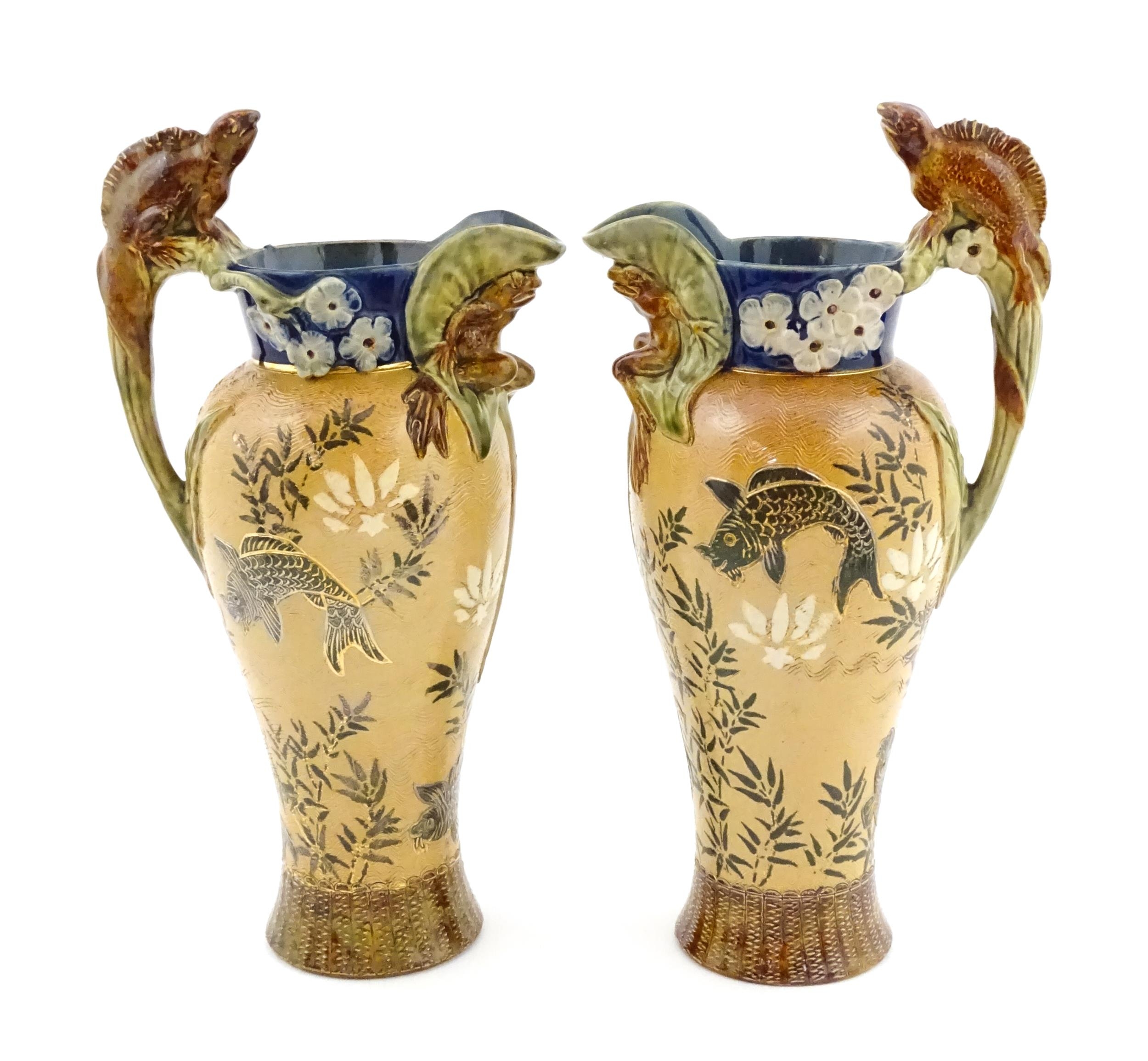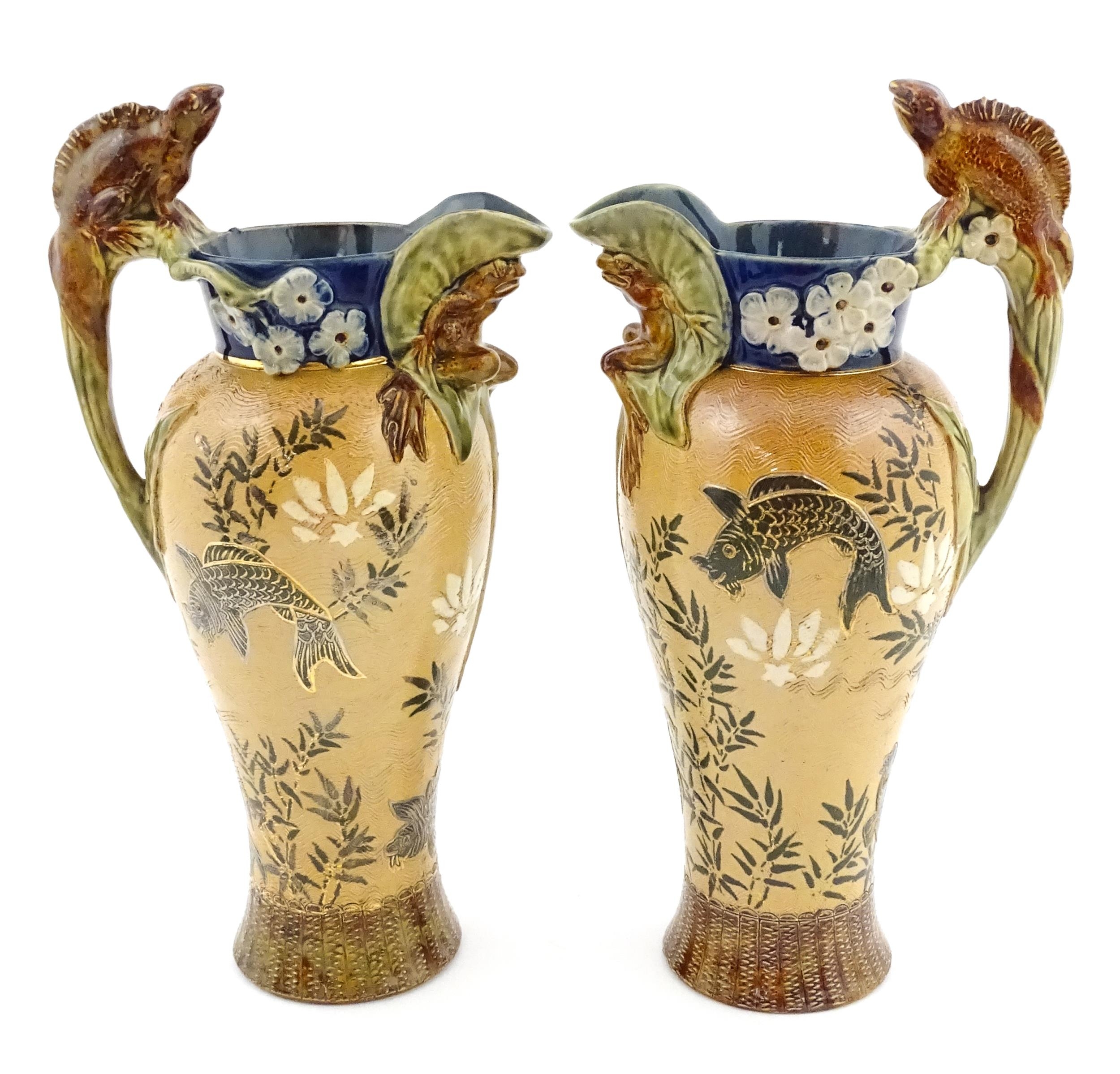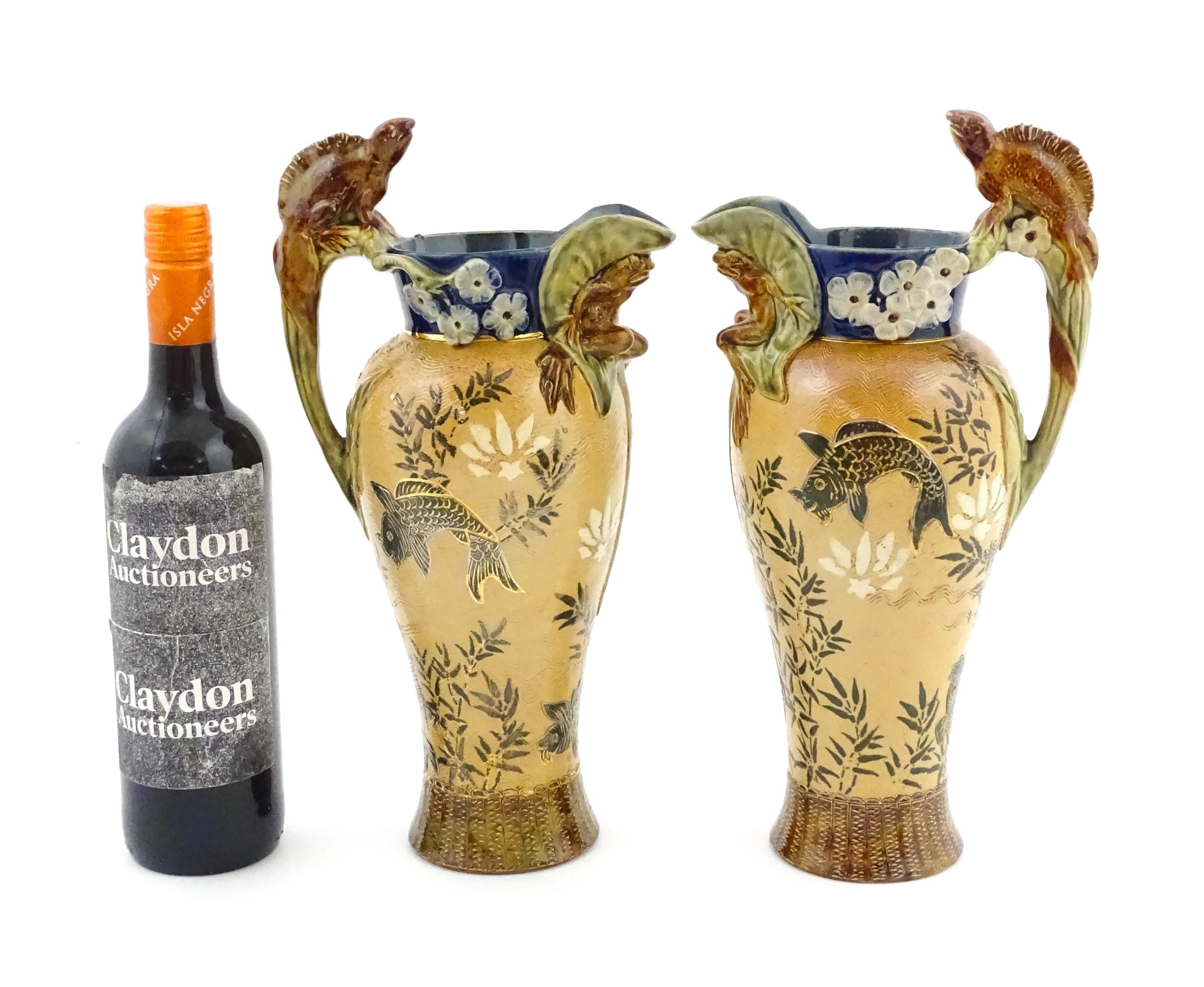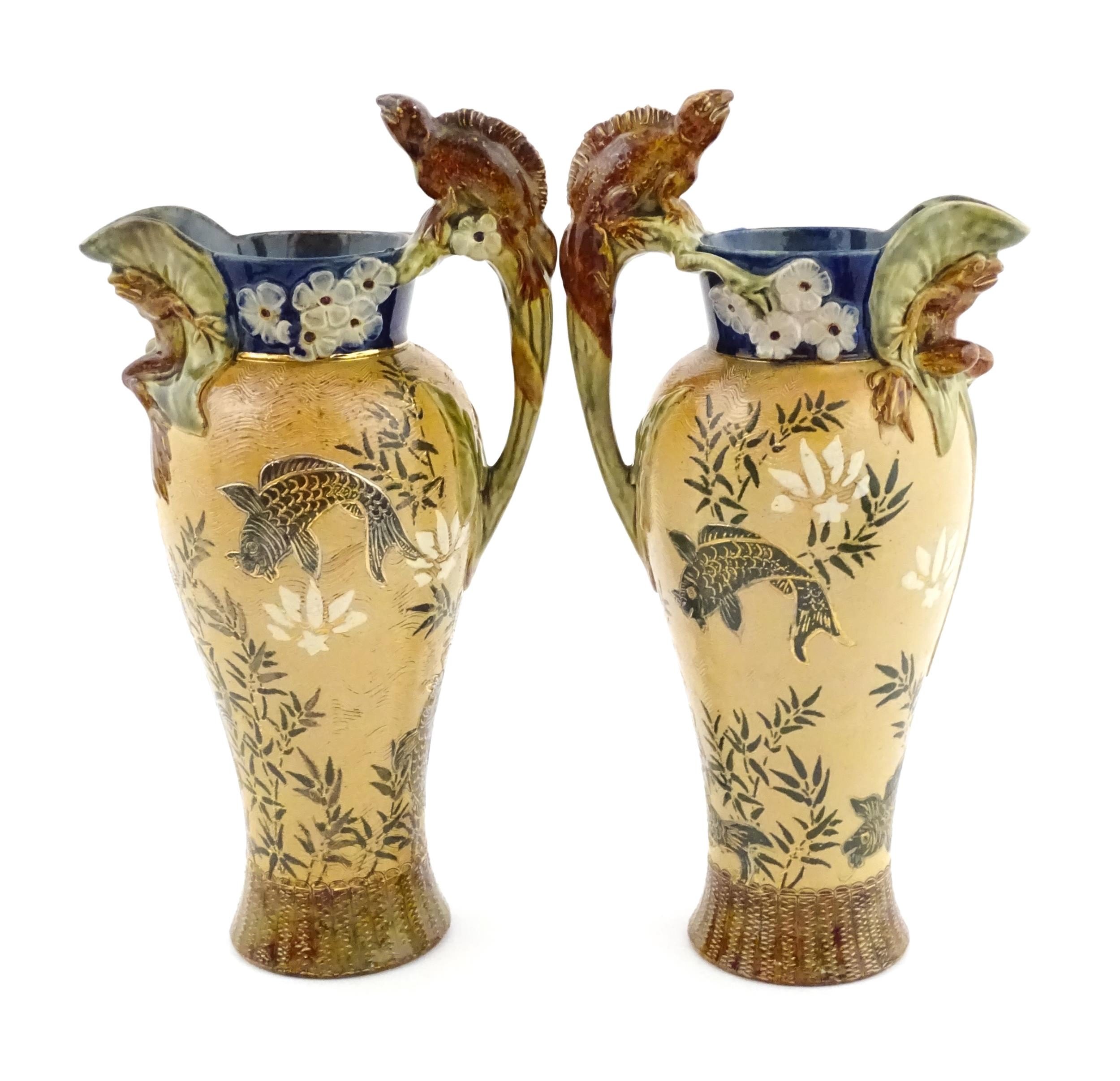 A pair of Doulton Lambeth stoneware grotesque ewers / pitchers, the bodies decorated with carp fish swimming amongst reeds, the spout moulded as a leaf with central frog / toad, with floral detail to neck, the handle surmounted by a lizard. Marked under, numbered 4635, X3941. In the manner of Mark V. Marshall. Approx. 13 1/2" high (2)